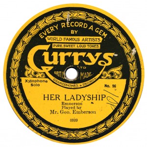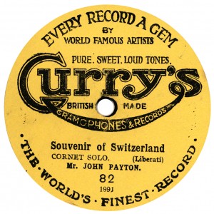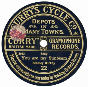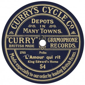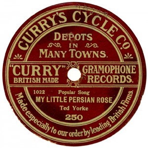 of the machines and discs crashed after about 1910, progressively to 1914. Curry’s was probably the first ‘chain’ of these shops; they already had ‘Depots in Many Towns’ as early as 1910, when the first series of discs above, drawn from Edison Bell ‘Bell Disc’ appeared. The first yellow label issues are derived from Guardsman. The last two discs date from about 1924, and the first bears a Grammavox master dating from about October 1913. And the rest is history. A century later, the nationwide chain of Curry’s Discount Warehouses stand in the forefront, everywhere! “The U.K.’s Foremost Electrical Retailer” is their byline. There was evidently money – lots of it – to be made from bicycles and records, as long as you managed the business well. Later they had other labels, called Portland and Westport. They seem to have abandoned records by about 1930; but that is beyond the scope of these pages. |