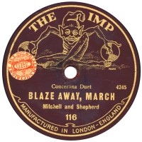 | In TMR 90, John Booth, the editor, reproduced an IMP label in monochrome, and asked for any further information. The label colour was not stated. In TMR 91, Frank Andrews replied that these were produced by ‘Edison Bell’ from Bell Disc and possibly Winner masters. The proprietor is unknown. Curiously, Frank reveals that no less than four of these IMP records have been found in the U.S.A. As they are practically unknown in the U.K., one is forced to conjecture whether they were made here for export to the U.S.A? This seems to us rather unlikely, as the USA generally had high import tariffs. Some of the sides date from 1908; but the IMP in TMR 90 (as also two here) has a copyright stamp; these came in in 1912. Still, the presence of a copyright stamp at this early period is not, we think, proof that the disc was definitely sold in the U.K. There are instances (also involving ‘Edison Bell’ as it happens) of Minstrel and Herald records made for J E Pidgeon in New Zealand, which have been seen with U.K. stamps. Perhaps in those early days it did not matter whether the royalty was paid in the country of manufacture or the country of consumption? Anyway, IMP records, needless to say, are very scarce indeed. Perhaps the rather sinister appearance of its eponymous being is to blame? | ||||