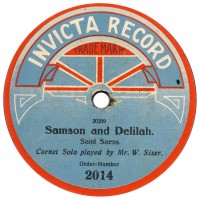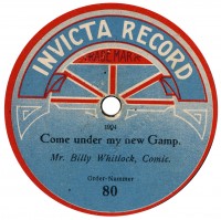 Master’s Voice’ fame. William had already been the British agent for Dacapo records, and when Dacapo opened their own direct branch in London, he looked for another line. He took on Invicta records, which were made in Germany by Berolina. Unfortunately, after only a few months, a disagreement arose, and Berolina appointed another agent, John Abrahams. Abrahams continued to sell the red white & blue German Invictas right up until August 1914, when supplies obviously ceased, at around catalogue number 380. The split occurred in mid-1913, at Cat. No. 270. Barraud believed that he had the rights to the name Invicta, and so got Invicta records pressed here. These are the ones with the blue labels. At first he went back through his original catalogue, trying to get the same artistes to record the same selections. It is important to realise then, that blue Invicta 206 above, though it carries the same titles by the same artist (Billy Whitlock) as are found on red white & blue Invicta 206, they are different recordings made many months later. These remakes all have master numbers between about 14370 and 14639. Besides this, Barraud needed new recordings. These were made in a new 100 master series. The trouble was, that he carried on with the catalogue number 271. Thus, absurdly, there were two different Invicta labels both using the same catalogue numbers – and, of course, carrying completely different artistes and repertoire! This outlandish state of affairs continued for several months, creating a nightmare for future discographers. Briefly, a court found against Barraud regarding the name Invicta, so he changed the name of his label to Guardsman, which began at 340. The red sticker above was attached to his remaining stocks of blue Invictas. |