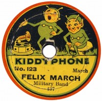 The Kiddyphone trade mark was registered in the U.K. to the German toy & novelty company Bing-Werke in April 1926. They had already been marketing toy tinplate gramophones and suitable small records in other countries, so Kiddyphone was their British line. The discs were pressed by Crystalate, either from Mimosa masters already to hand, plus others, as they were newly recorded. Three sizes are were used: 5.5", 6" and 7" (14cm, 15.25cam & 18cm). In common with most labels of this type, contemporary material was coupled with non-copyright stuff to save on royalty payments. In the above example, ‘Susie Was A Real Wild Child’ was a current popular song and so bears the (minimum) copyright payment of one halfpenny. The ‘Felix March’ is non-copyright. Had both sides paid a royalty, that would have been one penny, and since the discs were sold in 1925 for fifteen old pence (1/3d. or ~6.5p), that would represent a payment of 7.5%. Yet the required royalty was only 5% of the retail price. Very few companies were prepared to over-pay the publishers, hence the use of non-copyright material for one side. |