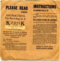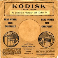 In these pages, we have several times described the search for an unbreakable record as the ignis fatuus of the record industry from earliest times. But a close contender would be the production of a simple and cheap means by which the public could make their own sound recordings. Cylinder phonographs that had a feed-screw (most of the half-decent ones had them) had always allowed their owners the facility to do so. You only needed to change the reproducer for a recording version, slip a blank soft wax cylinder onto the mandrel, and off you went! With discs it was considerably more difficult to contrive a home recording device. But in the U.S.A. in 1921, the inventive mind of Victor Emerson – already a veteran of the record industry – thought of, and patented, a pre-grooved metal disc. This would guide the sound-box of your gramophone across the disc, while at the same time, you spoke or sang into the horn of the gramophone. With any luck, the gramophone would act in reverse, and emboss your vocal efforts on the hitherto smooth walls of the groove. It may have worked quite well at the time. But alas, it would seem that in the intervening 90 years, those transient modulations have disappeared, as it were, resorbed into the groove. Adding together all the known instances of present-day owners of Kodisks, I can state categorically that of over thirty known examples, not a single one is claimed to replay anything comprehensible. Quite apart from this, the ire of the Kodak film & camera company was kindled, not only by the name Kodisk, but also by the phrase ‘Snapshots of your voice’. Kodak cameras took the ‘snapshots’, OK? The slogan had to be changed to the rather biblical ‘Hear yourself as others hear you’, and stickers placed on packets (and indeed some discs) declaring that Kodisk was nothing to do with Kodak. A dedicated ‘megaphone’ was available as an accessory; there was also a sound-box, at least in the U.S.A. |