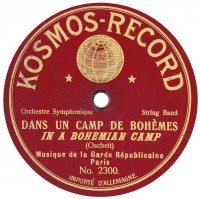 An exceptionally scarce label, Frank tells us that they were launched at the 1908 Franco-British Exhibition in London. Kosmos was a French company based at Roubaix, in the extreme north of France. Double sided, bilingual and lateral cut (vertical cut remained popular in France for many years still to come), they cannot have made much impact. Kosmophone gramophones were also on offer. A Listing contained 20 discs, all simply credited to ‘Orchestre’ / ‘Band’, so Kosmos 2300 which credits La Garde Républicaine is probably later. At the foot of the label is ‘Importé d’Allemagne’ or ‘Pressé en Allemagne’. Information found suggests that many of the masters on Kosmos were derived from the German Anker label. |