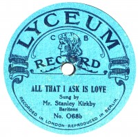 | There were two distinct incarnations of Lyceum. The ‘C B’ on the label stands for the wholesaler Cooper Brothers. Since 1912, CB’s only label had been Coliseum, but they must have felt another was needed, as the price war was raging in late 1913, and cheaper and cheaper discs were required. An initial batch of 87 discs, made in Germany by Beka, appeared first, by November 1913, in time for the Christmas trade. The colour of O-68 is an unusual variant – its other side is normal. However, the series did attain O-200 – but by this time War had broken out, and O-152 above is ‘manufactured throughout in England’. This type would have been pressed at the Lindström works in Hertford. Frank informs us that the (newly re-founded) Wm. Cooper Bros. Ltd. concern stopped promoting Lyceum records from November 1917. There was, however, a second incarnation of Lyceum a year or two later in an O-2000 series. Frank knows only of four examples, O2009 being the highest. These last issues, derived from the Sound Recording Co., ‘Popular’ masters and pressed by Crystalate, probably date from 1918-20 and are very scarce indeed. As you can see, they are printed on a much darker blue paper, and since the type is in dark blue as well, the labels are not terribly legible! In Lyceum we have a classic example of an always elusive label, yet which was produced in three different factories, with three quite different sources of repertoire none of which was actually original to Lyceum. | ||||