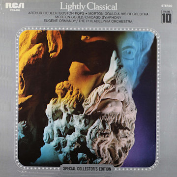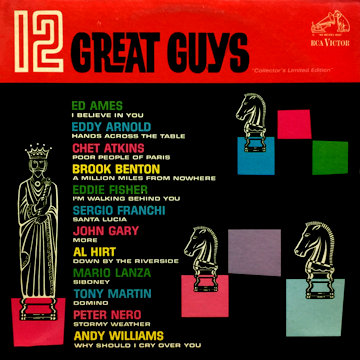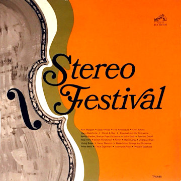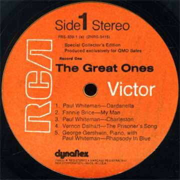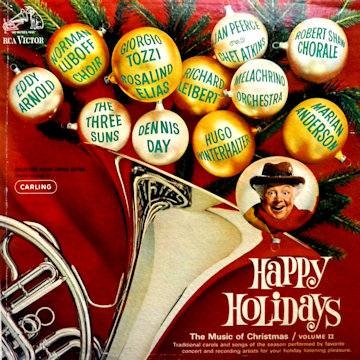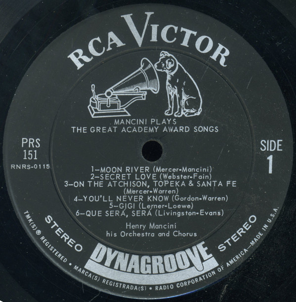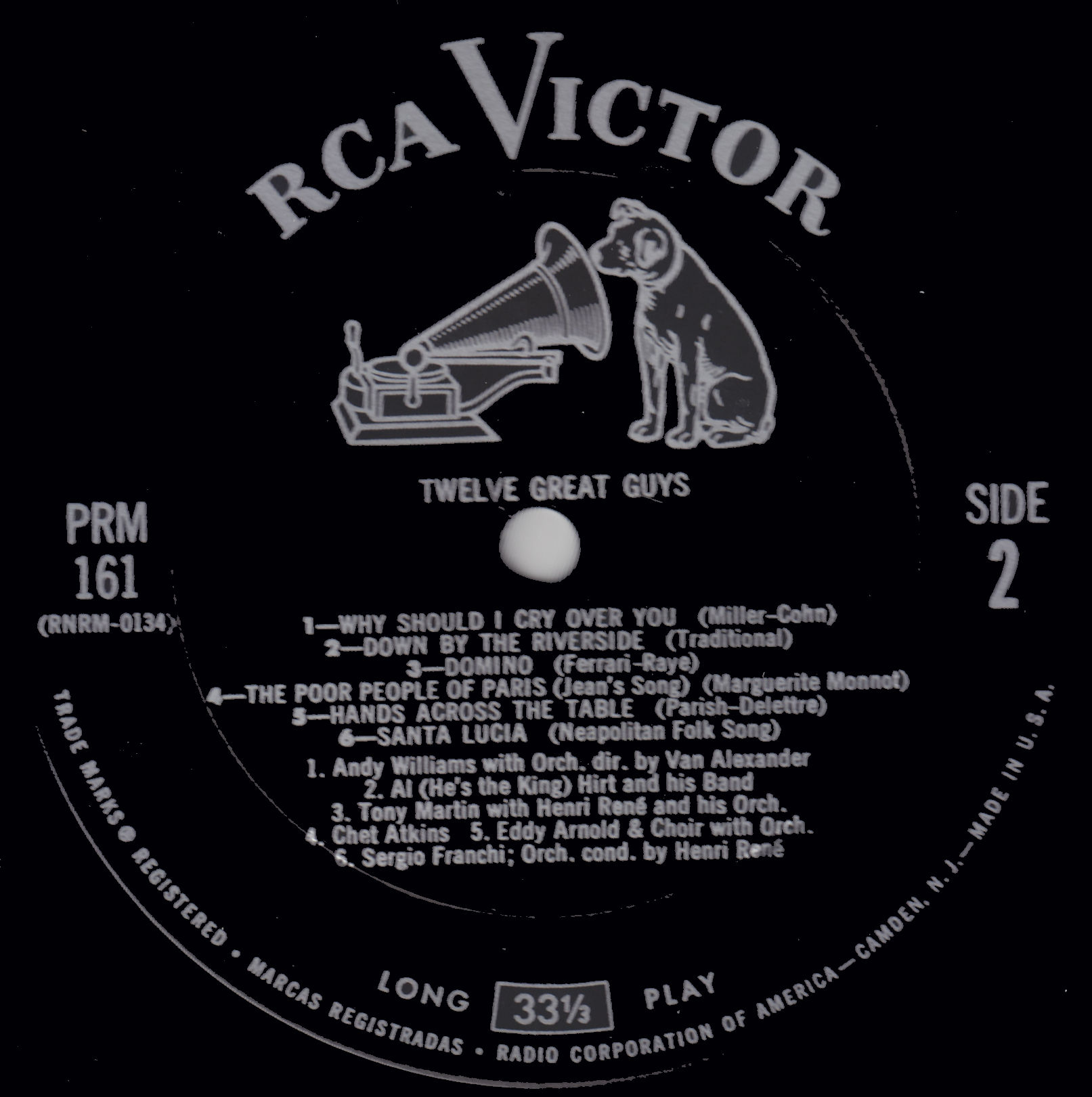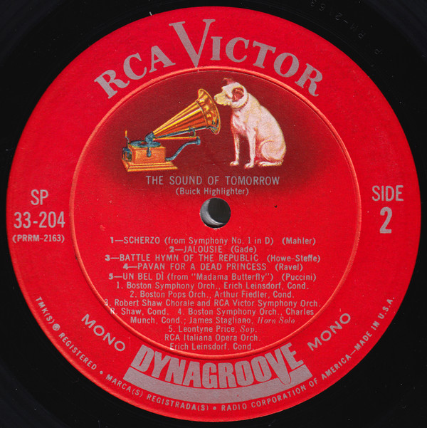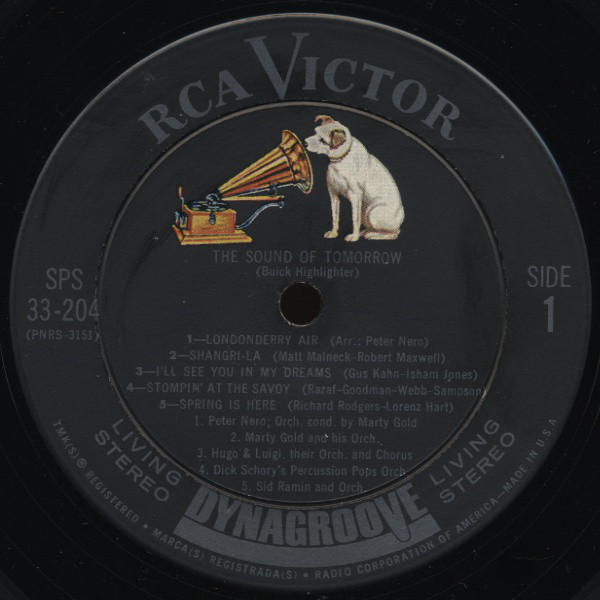 Most of the early issues in this series used a black label with silver print with an RCA Nipper logo outline at the top. Occasionally, a special label in gold, blue, or red was used, or a black label with the full color Nipper logo at the top. |