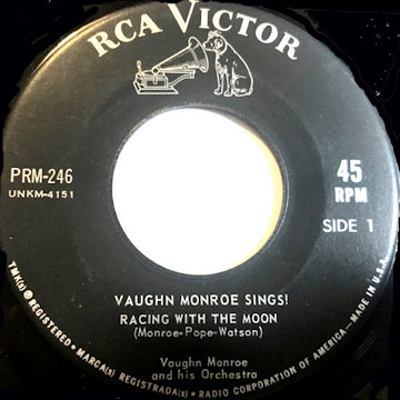 Occasionally, the regular RCA label was used, with the full color Nipper logo at the top. In the case of PRM 161, both the "outline" label (far left) and the regular RCA label (near left) are known. This probably happened because one of the pressing plants ran out of "outline" label blanks, and substituted the regular label. Alternatively, it may have just been a mistake at one of the plants. |