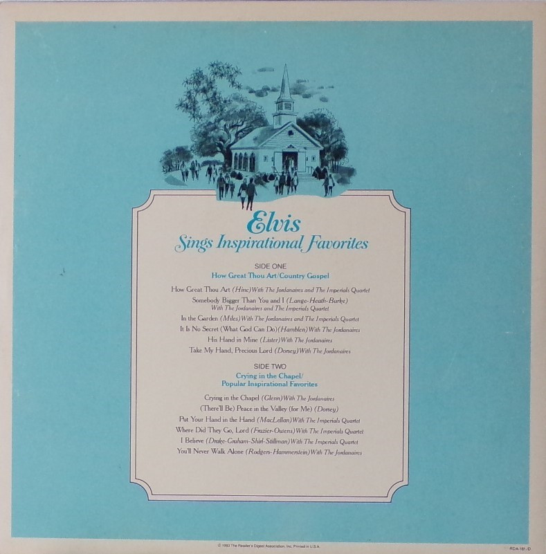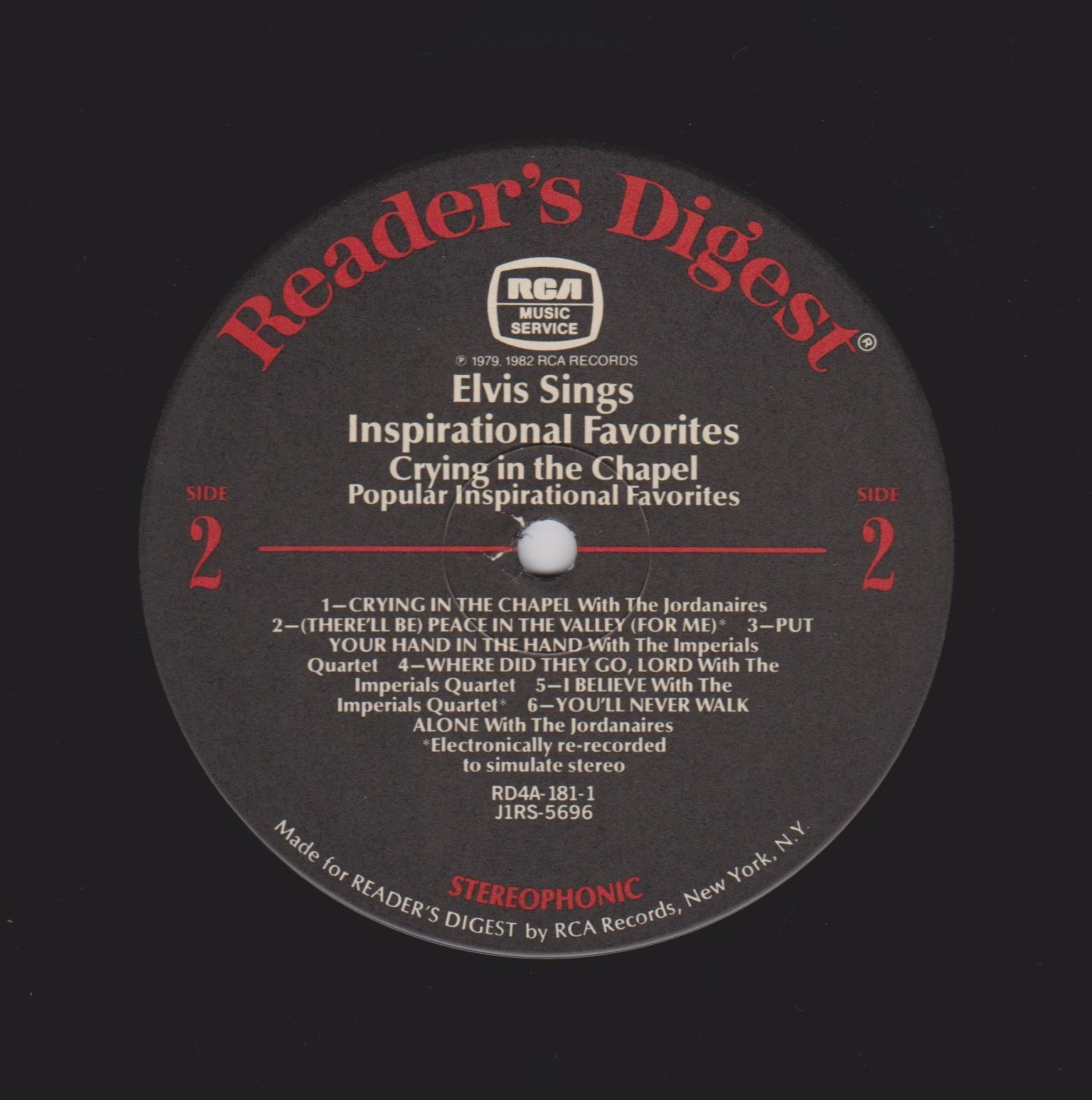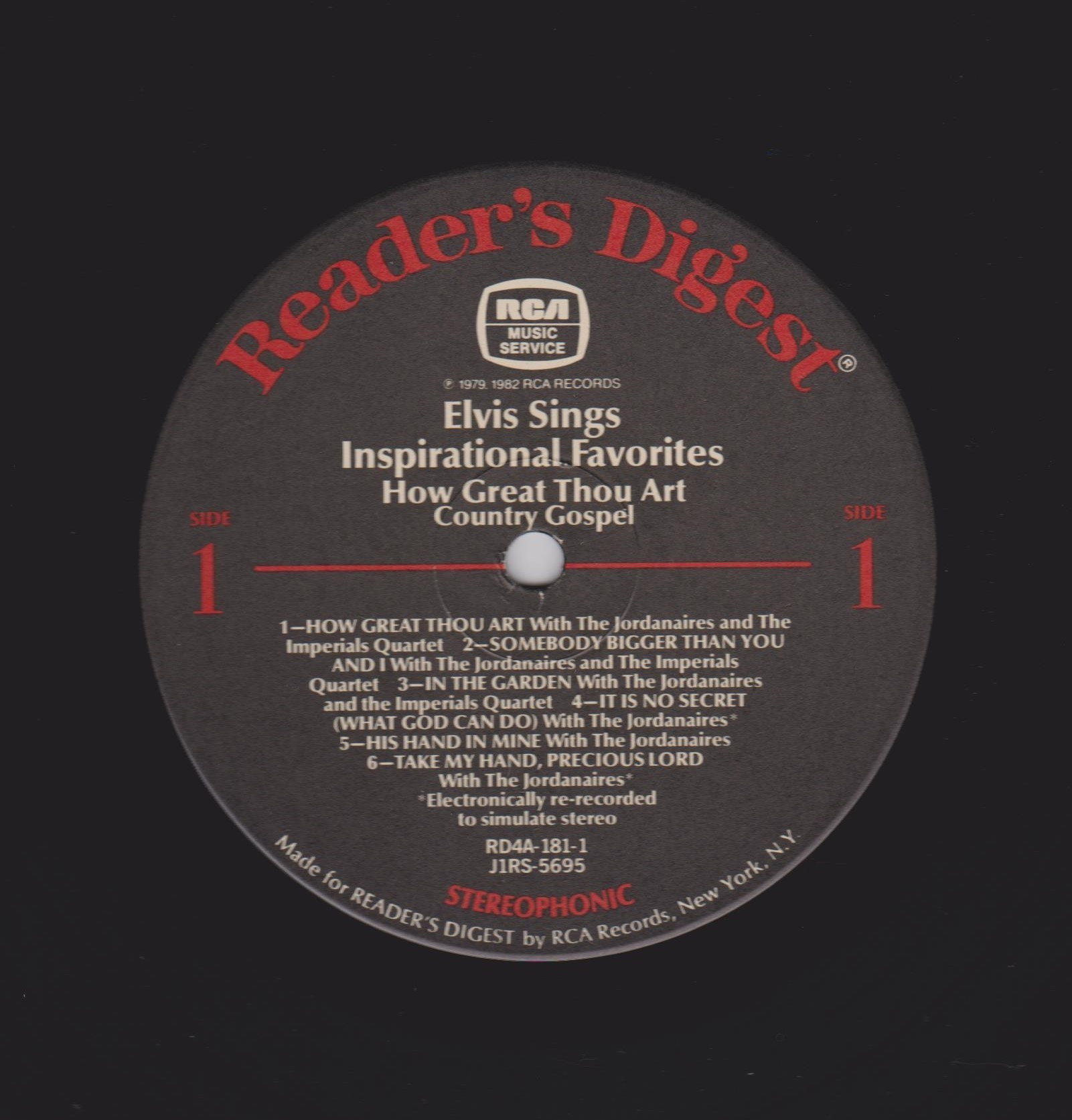 Title : Elvis Sings Inspirational Favorites Catalogue Number : RDA - 181 / D Year Release : 1983 Side One : How Great Thou Art Somebody Bigger Than You And I In The Garden It Is No Secret (What God Can Do) His Hand In Mine Take My Hand, Precious Lord Side Two : Crying In The Chapel (There'll Be) Peace In The Valley (For Me) Put Your Hand In The Hand Where Did They Go, Lord I Believe You'll Never Walk Alone Brief History : This limited edition 12-track LP, was available by mail order only from Reader's Digest magazine.Details : 1983 Release Front Cover : Photo of Elvis. Title bottom left. Catalogue number top right. Rear Cover : Catalogue number bottom right. Title mid centre. Printed in U.S.A. bottom centre. Label : Black with red & white lettering. Flexible vinyl. Side 1 : Reader's Digest at top in red text. Side 2 : Reader's Digest at top in red text. Pressing Plant : Indianapolis Matrix Number Side 1 : J1RS - 5695 4 A1 - (Machine Stamped) N (Hand Etched) Matrix Number Side 2 : J1RS - 5696 1 A1 - (Machine Stamped) B (Hand Etched) *NOTE* The catalogue number on the rear cover RDA-181/D differs from the record label which is RD4A-181-1. Readers Digest is referenced on front cover top left. |