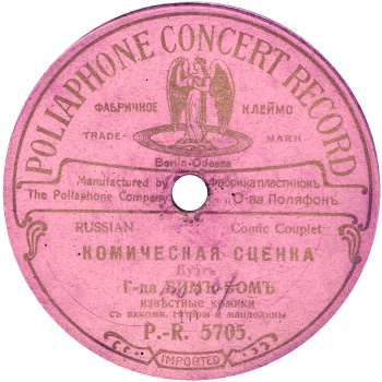 masters bought from German companies Stella, Beka and etc. Judging by the existing copies of records, the company achieved certain perfection in the business of copying somebody else's records: on this record the own announcement is attached to the copied phonogram! One can make this conclusion after careful listening to the record: the announcement sounds indistinctly and faintly, while the orchestra sounds brightly and richly. Supposedly, for achieving this goal they used a pantograph with attached to it mouthpiece. The process might work this way: first they started the recorder, then spoke necessary phrase into the mouthpiece, then without stopping started the playback of the original record. Since all records have more or less prolonged lead-in groove, there should be a lapse between the end of the phrase and the beginning of the actual sound - this is exactly what we observe! Usually there is no such delay on the original recordings. Using this hi-tech technology combined with social skills of Poliakin-senior explains the fact why "all attempts of thieved artists to stop the illegal business ended up without success - wise Poliakin-senior befriended with local police as well as with fathers of the city, so they closed their eyes on all his pranks".After passing of the Copyright Law in March 20, 1911, the company began making its own recording, mostly with folk music. |
