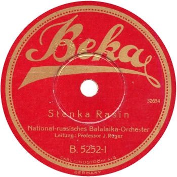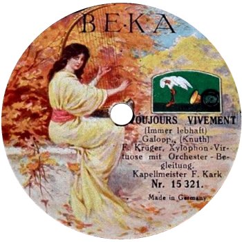| Beka Records was a record label based in Germany, active from about 1903 to 1925. Before the Great War Beka also made gramophone records for the United Kingdom and Russian markets under the Beka-Grand-Record label. Russian repertoir of the company was vast; according to A.Zhelezny the first records were made as early as 1905 (1906 according to P.Grunberg). Beka often sold their Russian matrixes to another gramophone companies. After the Great War broke out in 1914 it stopped all operations in Russia. Eventually, the company became a subsidiary of the Carl Lindstrom A.G. group which was sold to the Columbia Graphophone Company in 1926. |