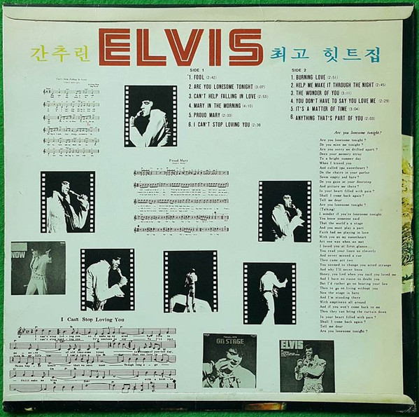 Yegrin - PI-001 Format: Vinyl, LP, Compilation, Unofficial Release, Stereo Country: South Korea Side 1: 01: Fool 02: Are You Lonesome Tonight ? 03: Can't Help Falling In Love 04: Mary In The Morning 05: Proud Mary 06: I Can't Stop Loving You Side 2: 01: Burning Love 02: Help Me Make It Through The Night 03: The Wonder Of You 04: You Dont Have To Say You Love Me 05: It's A Matter Of Time 06: Anything That's Part Of You Manufactured By – Yegrin Record CoVia google translate ??? ELVIS ?? ??? = The Best Elvis Hits The English translation is not shown on the release. Korea Release Only. This record was released only in South Korea. Released Date : the 1970s. If anyone knows exactly when it was released, has a link to online details etc, please let us know. |