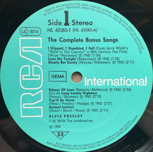 Elvis Presley The Complete Bonus Songs. RCA NL 45180. Vinyl, LP. Germany 1983