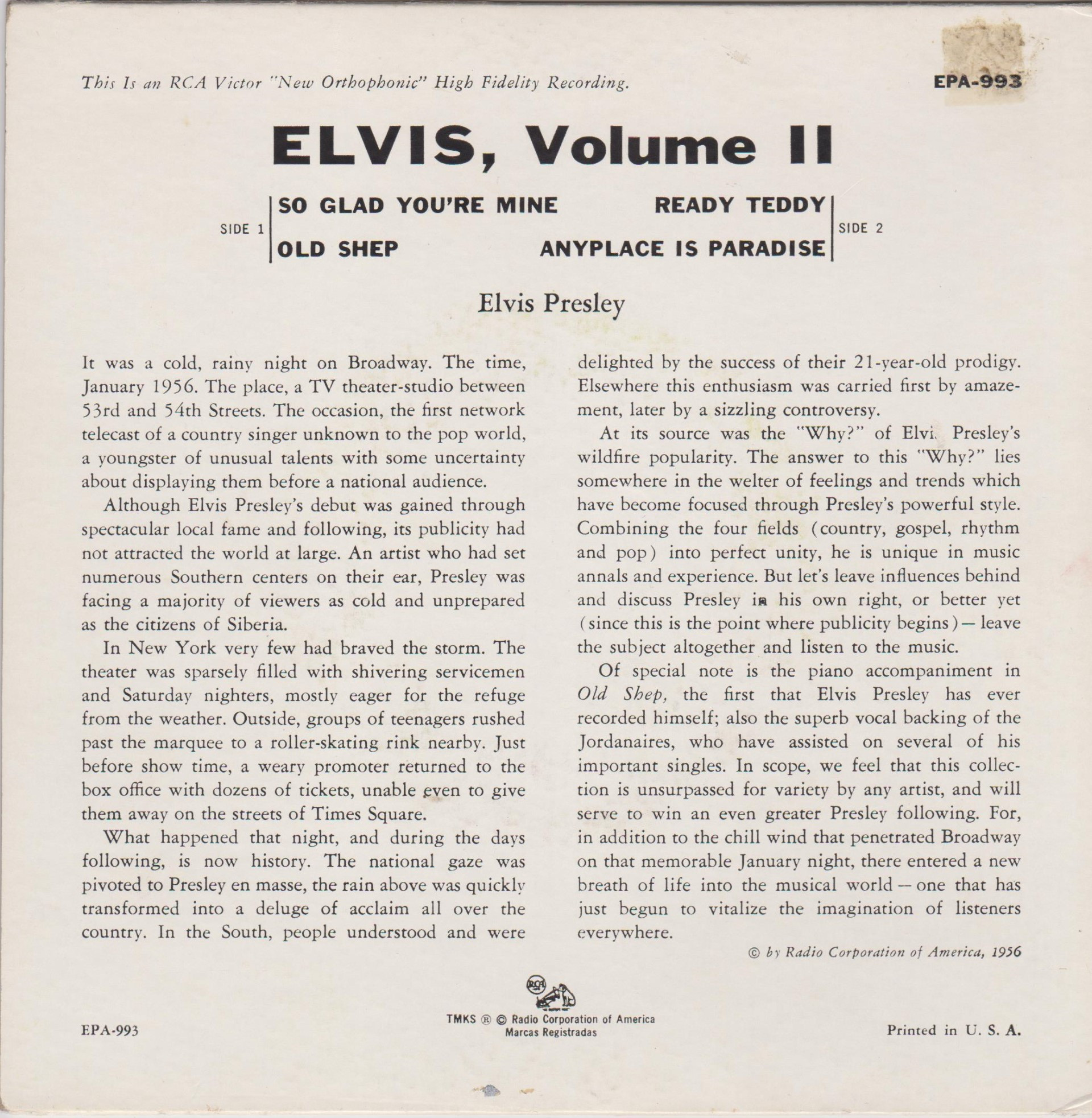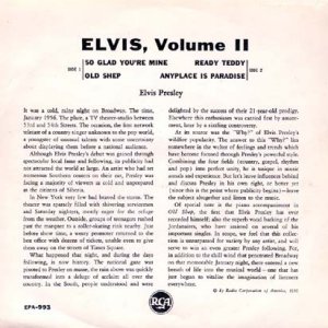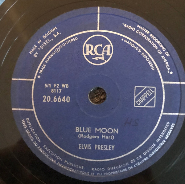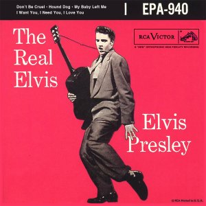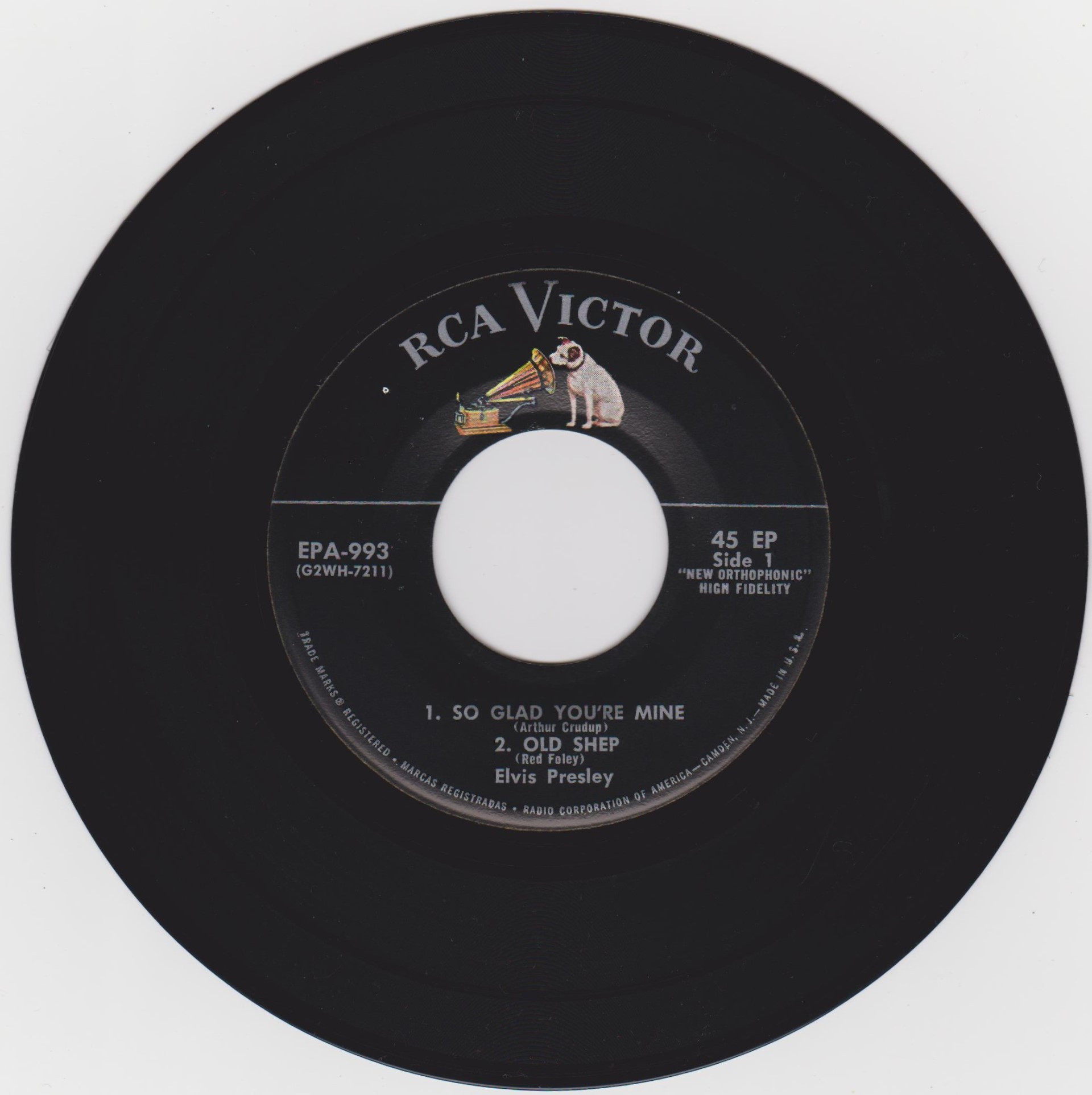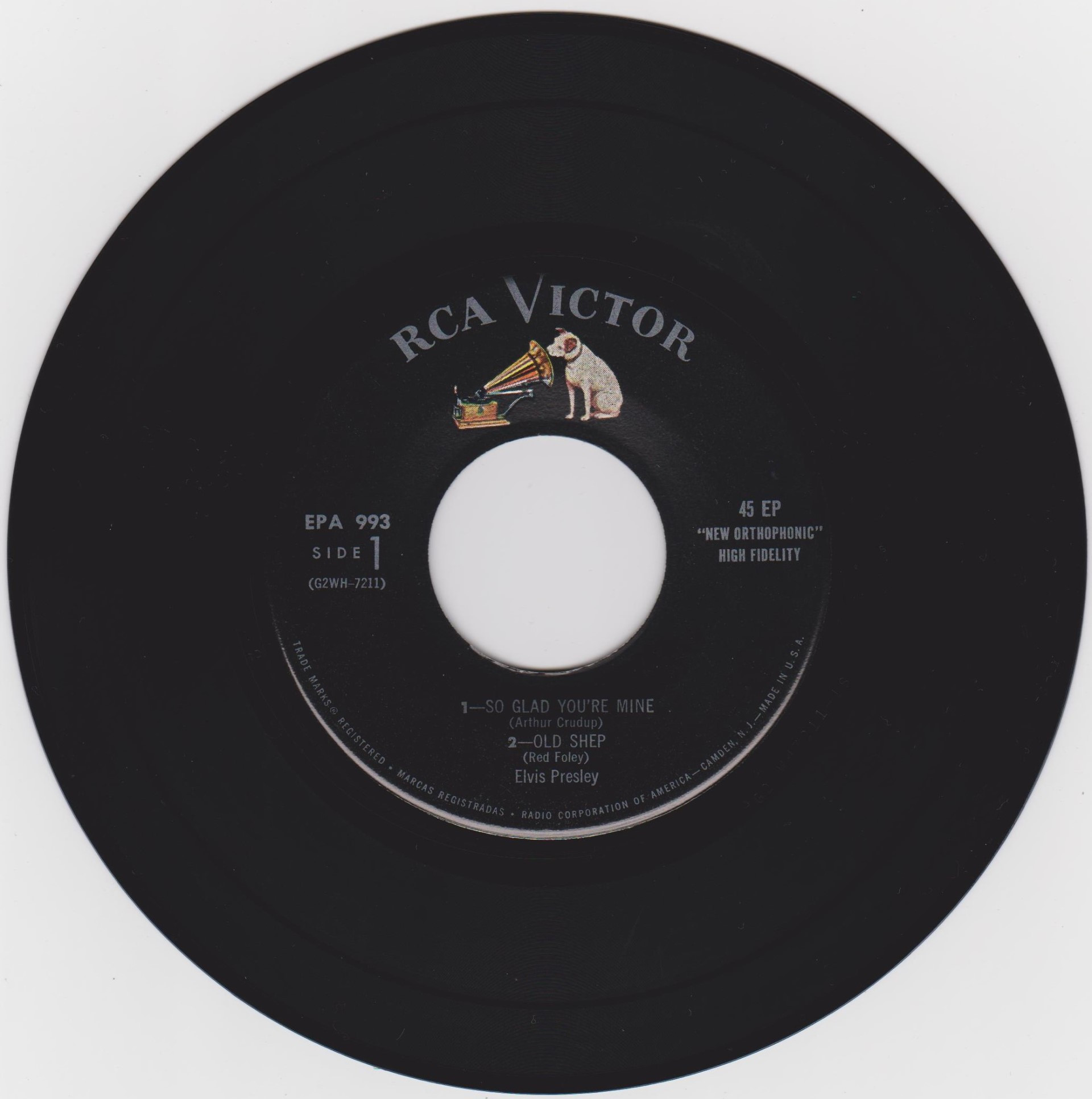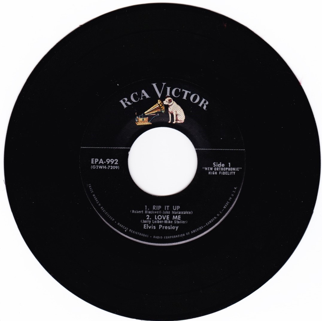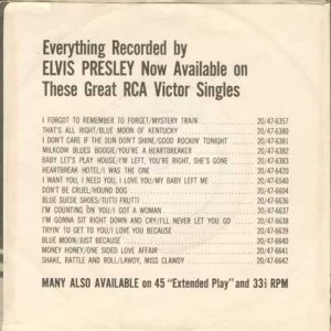 | Details : Front Cover : Elvis photo. Rear Cover : Text only. Label : Black with silver lettering & dog on top. Pressing Plant : Rockaway Matrix Number Side 1 : G2 - WH 7209 - 2S H A RCA 3 (Machine Stamped) Matrix Number Side 2 : G2 - WH 7210 - 2S D A RCA 6 (Machine Stamped) *NOTE* This label has a horizontal line. |