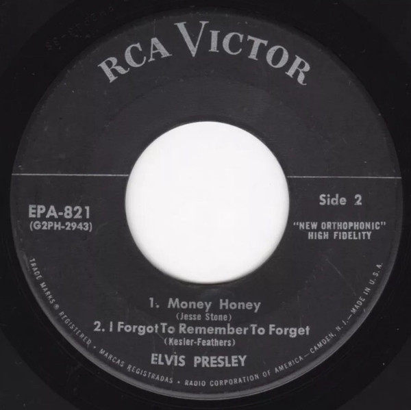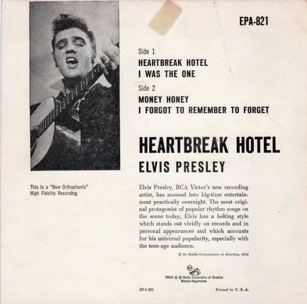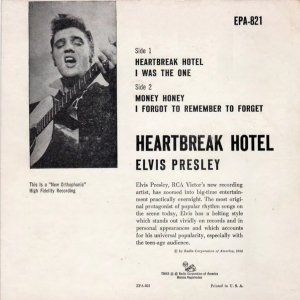 (EP) (US) RCA EPA 821 Released: April 20, 1956 Side 1 Heartbreak Hotel I Was The One Side 2 Money Honey I Forgot To Remember To Forget |
