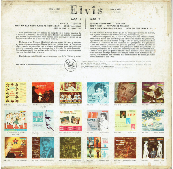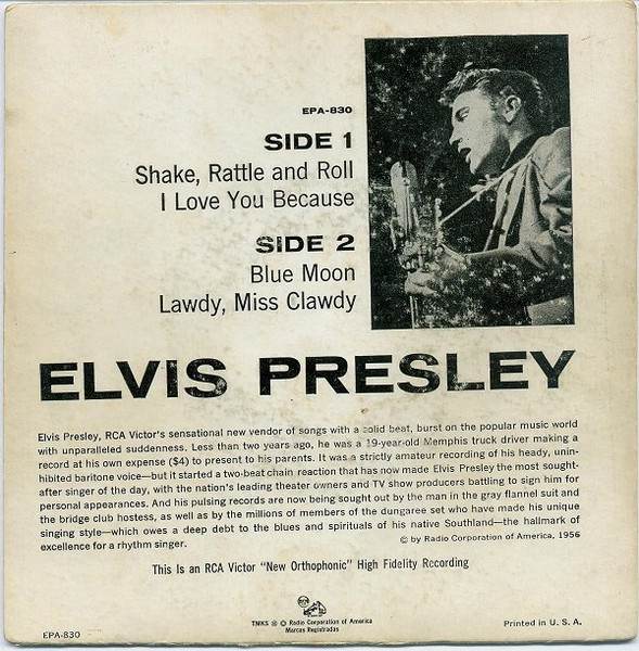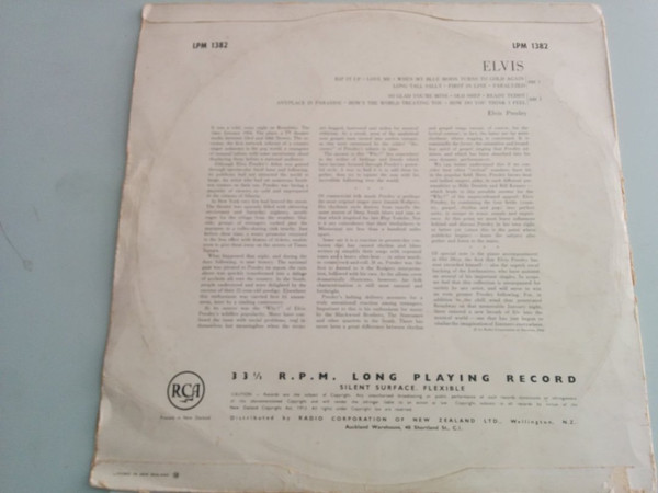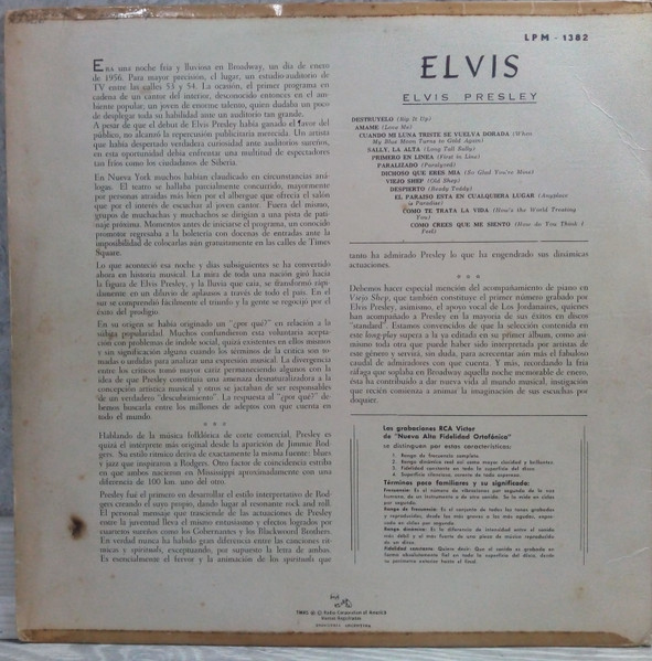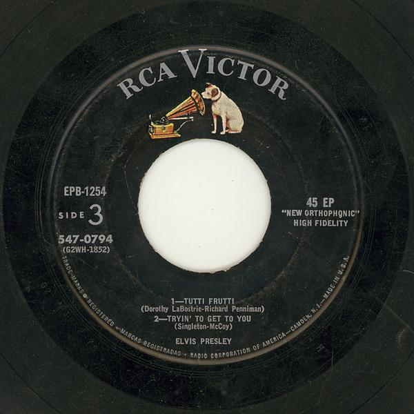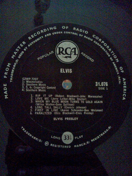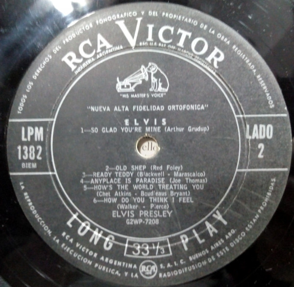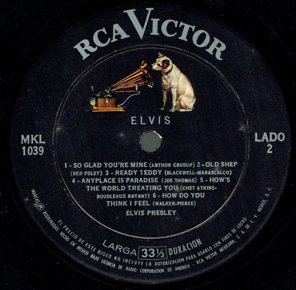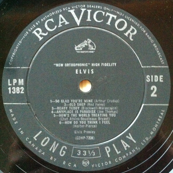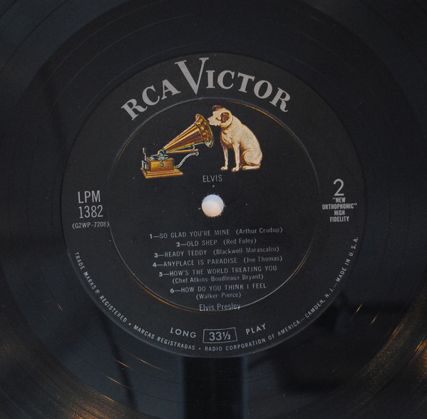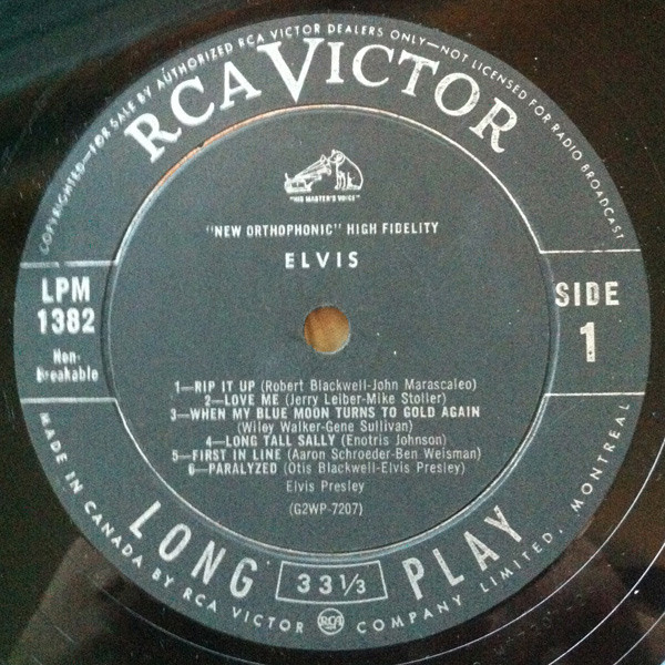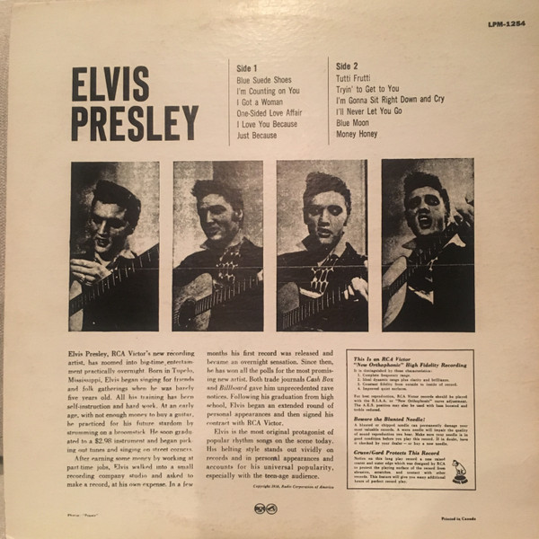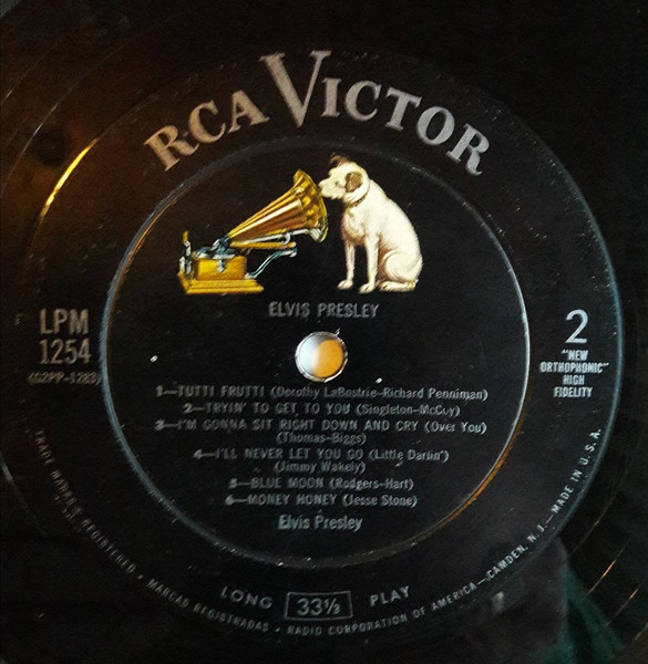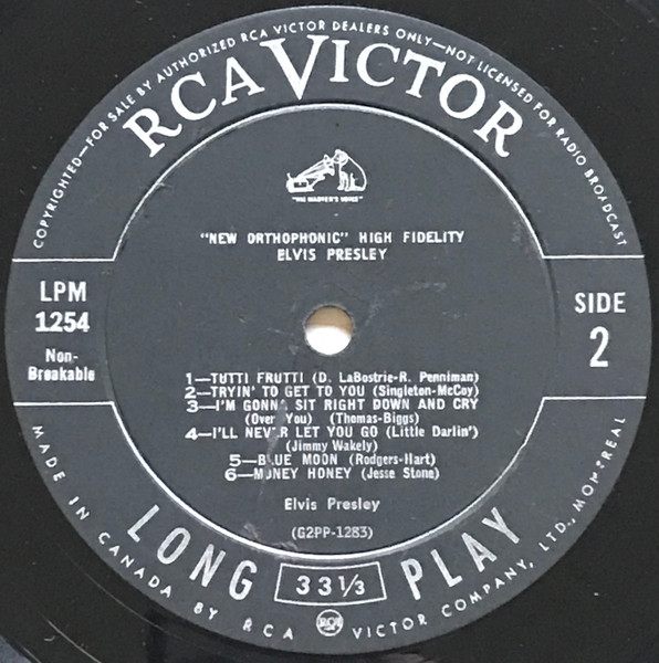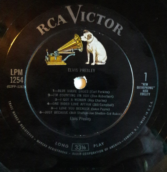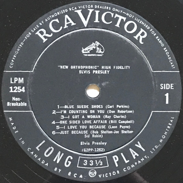 | Elvis Presley Label: RCA Victor LPM-1254 Black label, silver letters, Long Play, dog on top, Orthophonic. Slightly different cover than other Canadian mono pressing in that the RCA logo is a different color and the picture of Elvis is more centered on this copy. Matrix / Runout (Side A label): G2PP-1282 |