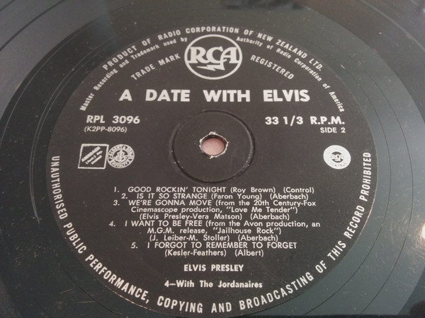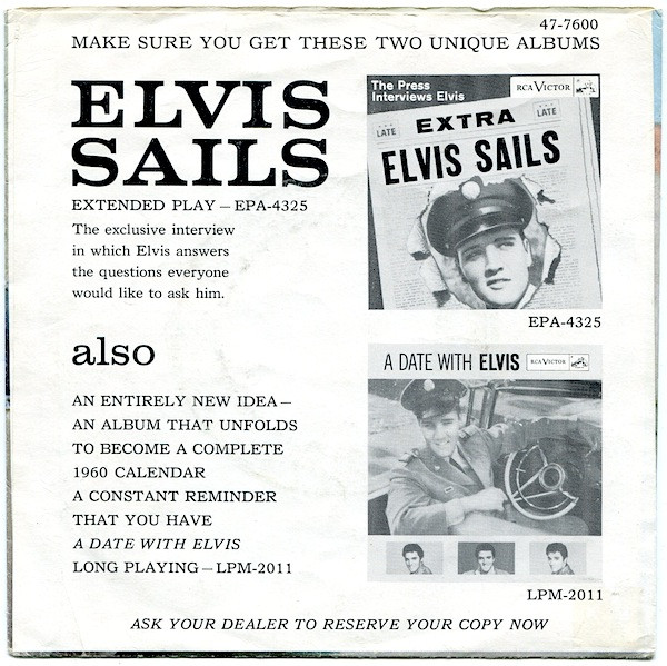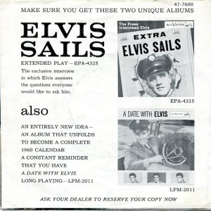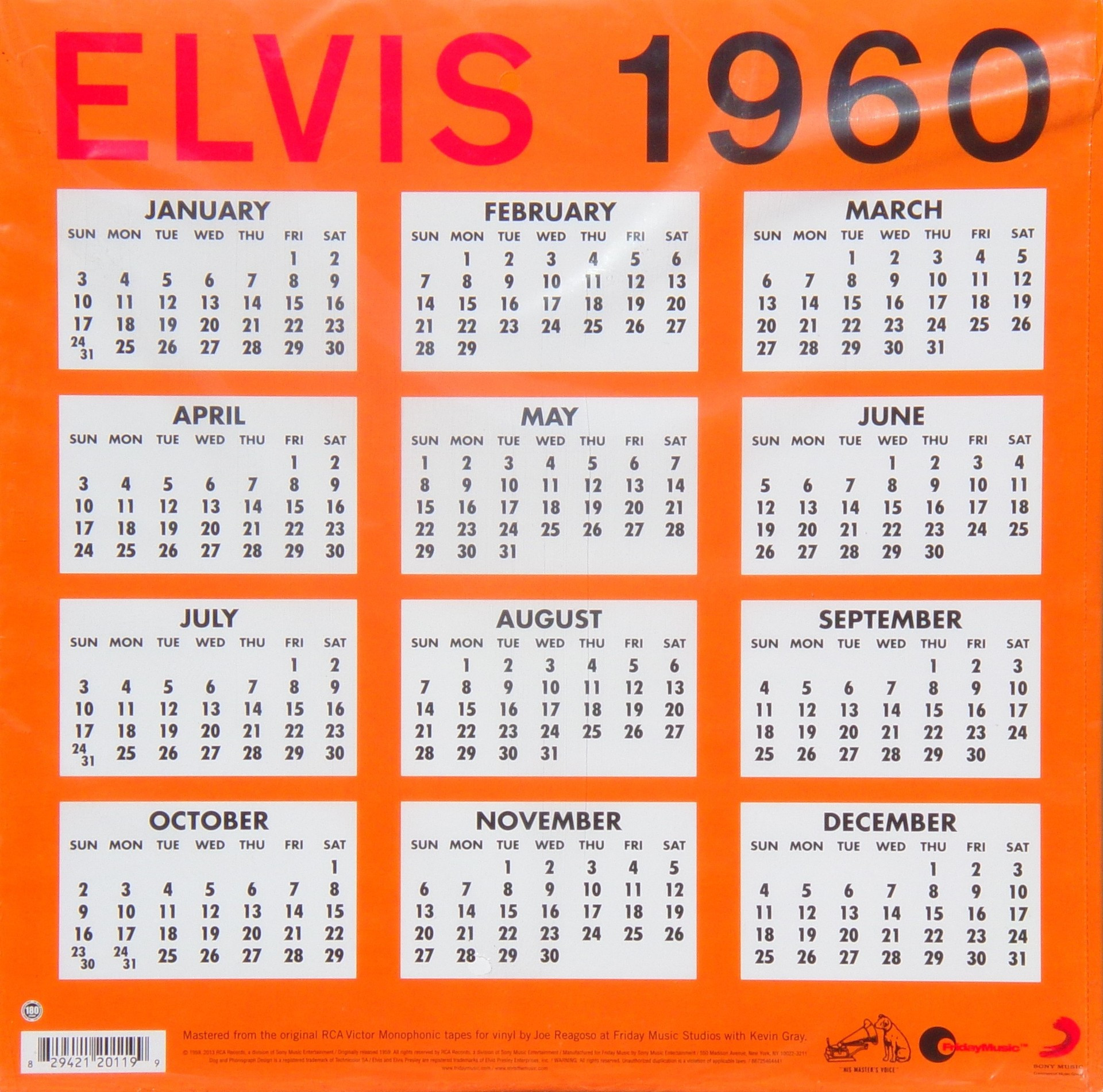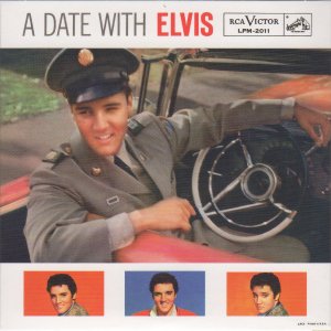 WITH ELVIS (LP) Brief History : A Date with Elvis is the eighth album by Elvis Presley, issued on RCA Victor Records (LPM 2011) in July 1959. It is a compilation of previously unreleased material from an August 1956 recording session at 20th Century Fox Stage One, two from Radio Recorders in Hollywood, and multiple sessions at Sun Studio. The album reached #32 on the Billboard Top Pop Albums chart. After Presley's induction into the army on March 24, 1958, RCA and his manager, Colonel Tom Parker, were faced with the prospect of keeping his name before the public for two years with no possibility of live performances, no movies, and with few unissued marketable recordings in the vault. A recording session was arranged for two days in June, which yielded enough items for five more single sides, singles being the commercial focus for rock and roll in the 1950s. Four of those tracks would be issued on 45s in 1958 and 1959 during his absence while doing military service. Presley, however, also did well in the albums market, all but one of his previous seven LPs charting no lower than #3, and RCA wished to continue promoting albums by Presley given his sales record. Much of Presley's material had not been released on LP, and for this album RCA collected material previously unavailable on album. Like its predecessor For LP Fans Only, this album featured tracks that had been issued on Sun Records with limited release, and were almost impossible to locate beyond certain parts of the south. The remaining five tracks derived from three different EPs issued in 1956 and 1957. Even by the standards of the late 1950s and early 1960s, where long-playing albums often ran to only about 35 minutes, this was a very short album at twenty-three minutes, and as such became the lowest charting Presley LP of the decade. RCA would squeeze one more album in 1959 out of previously issued material, the second singles collection, but it too would be a lower seller by previous standard. Presley would return from overseas in 1960 to commence proper recording again. this album also folds out to be a calendar for the year 1960. Front Cover : 4 Elvis photos. Catalogue number top right. Red sticker