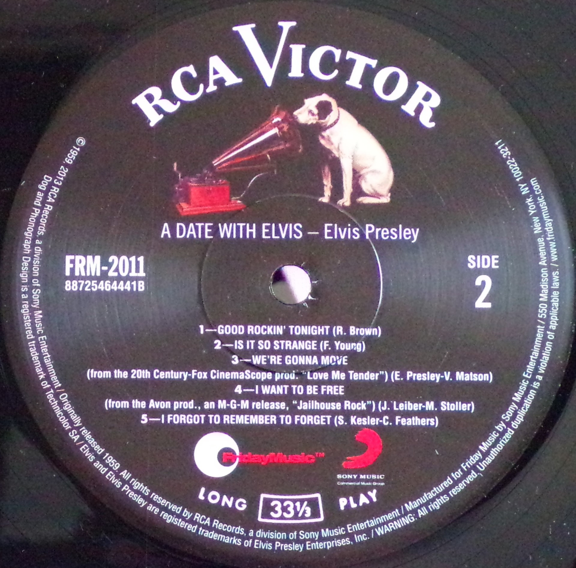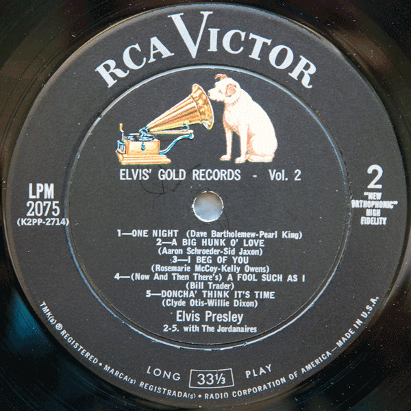 side 1. New Orthophonic on side. Disc: (1965) Black label, dog on side. Disc: (1969) Orange label. |
