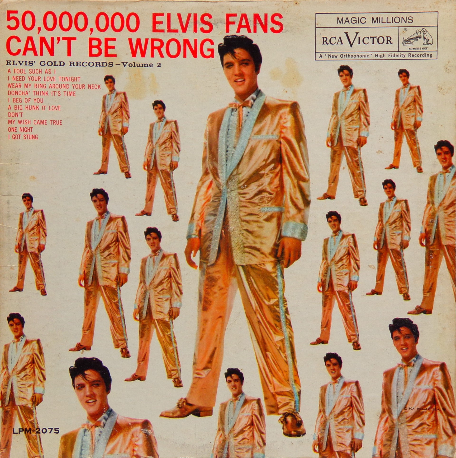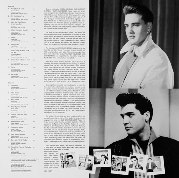 ELVIS FANS CAN'T BE WRONG (LP) 50,000,000 Elvis Fans Can't Be Wrong: Elvis' Gold Records - Volume 2 is the ninth album by Elvis Presley, issued on RCA Victor Records (LPM 2075) in November 1959. It is a compilation of hit singles released in 1958 and 1959 by Presley, from two recording sessions in June 1958 at RCA Studios in Nashville and three at Radio Recorders in Hollywood. The album peaked at #31 on the Billboard Top Pop Albums chart, and is considered to be one of the most successful and influential compilation albums of all time. It was certified Gold on 11/1/1966 and Platinum on 3/27/1992 by the R.I.A.A. Gold Records Vol. 2 comprises every single, both A-sides and B-sides, released by Presley during 1958 and 1959, with the exception of "Hard Headed Woman" backed with "Don't Ask Me Why," both of which having been previously issued on King Creole. The singles all made the Top Five on the Billboard Hot 100, and the b-sides all charted in the Top 40 independently of the hit sides. In the 1950s, a gold record awarded for a single referred to sales of one million units, different from the definition in use by the late 1970s for albums, where a gold record came to mean sales of 500,000 units. Exact sales figures from the RIAA for each record, however, are difficult to confirm. Although RCA executive Steve Sholes was the in-house A&R man for Presley, and nominally in charge of his recording sessions at RCA, accounts by Presley historian Peter Guralnick and Presley discographer Ernst Mikael Jorgensen indicate that Presley himself acted as the producer for his RCA sessions in the 1950s. Front Cover : Elvis in his famous gold suit. Catalogue number top right