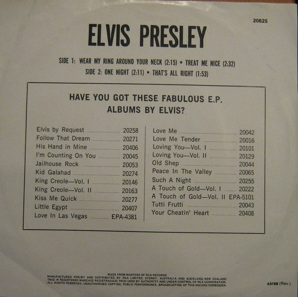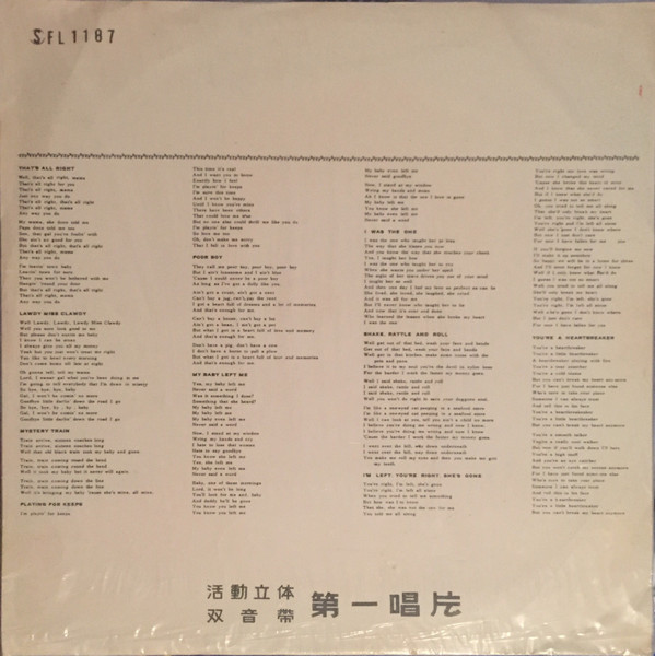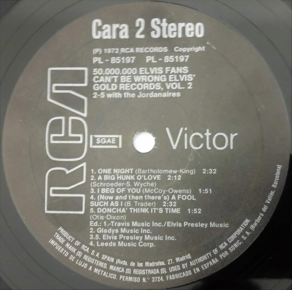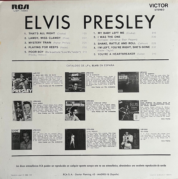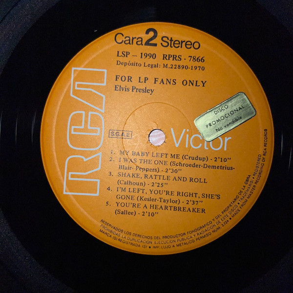 | For Lp Fans Only Label: RCA LSP 1990 01: Esta Muy Bien (That's All Right) 02: Lawdy, Miss Clawdy 03: Tren Misterioso (Mystery Train) 04: Amor Es Para Siempre (Playing For Keeps) 05: Pobre Muchacho (Poor Boy) Side 2: 01: Mi Nena Me Dejo (My Baby Left Me) 02: Yo Fui El Unico (I Was The One) 03: Shake, Rattle And Roll 04: Yo Me Quede, Tu Estas Bien, Ella Se Fue (I'm Left, You're Right, She's Gone) 05: Tu Eres Una Rompecorazones (You're A Heartbreaker) Manufactured For FTA |
