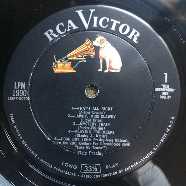 | Details : 1968 Release Front Cover : Elvis in his famous gold suit. Catalogue number top right with "Magic Millions". Printed in U.S.A. bottom right. Rear Cover : Coloured photo of Elvis. Label : Black with silver lettering & dog on top. No Camden N.J. at bottom. Album title above spindle hole. Side 1 : Side 1 on inner label. Side 2 : Side 2 on inner label. Pressing Plant : Indianapolis Matrix Number Side 1 : K2PP - 2713 - 21S (Machine Stamped) Matrix Number Side 2 : K2PP - 2714 - 11S (Machine Stamped) *NOTE* 1968 release Flat label with "RE" front cover bottom right. Rear cover has text box to the top left & right. RCA logo is now white. Monaural bottom of vinyl label. |