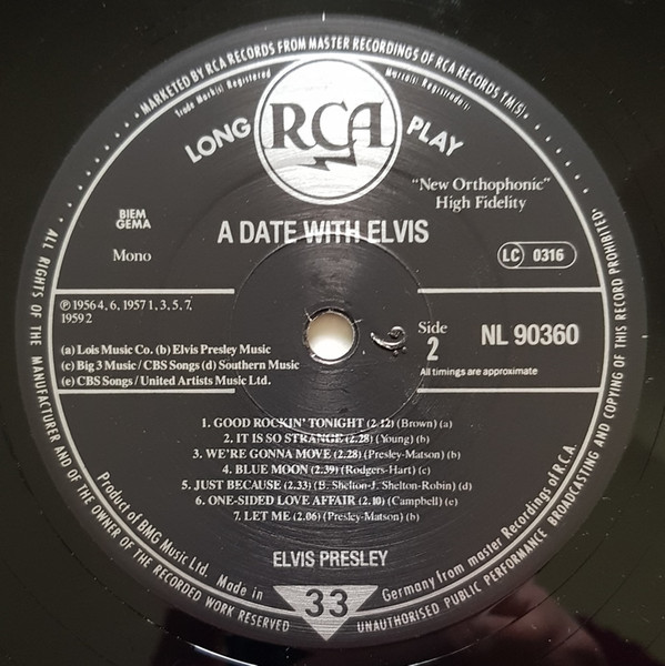 | A Date With Elvis Label: WaxTime In Color 950703 Side 1: Side 2: Phonographic Copyright ? WaxTime In Color Liner Notes Greil Marcus A6, A7, B6 & B7 are bonus tracks Barcode (Printed): 8 436559 468237 |