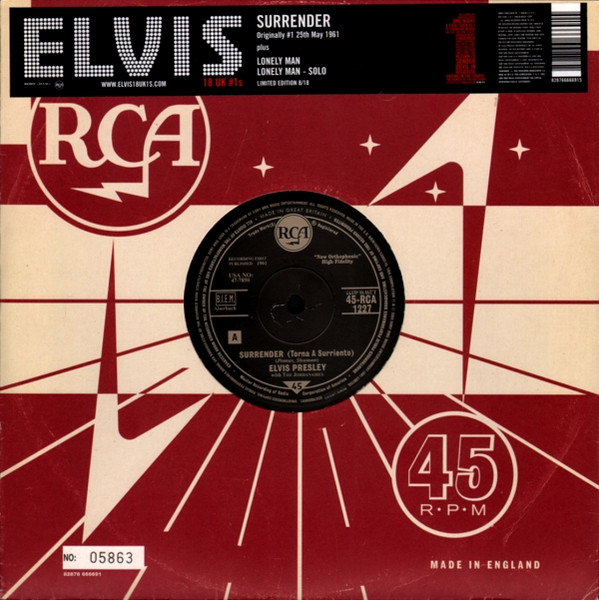 Entertainment – 82876666691, RCA – 45-RCA 1227 Series: Elvis 18 UK #1s – 8 Format: Vinyl, 10", 45 RPM, Single, Limited Edition, Reissue, Numbered Country: UK Released: 14 Feb 2005 Phonographic Copyright ? – Sony BMG Music Entertainment (UK) Ltd. Number eight in a series of numbered re-issues of Elvis's 18 UK number 1 singles to celebrate the 70th anniversary of his birth issued in replica labels and aged sleeves. Catalogue numbers: Die Cut Sleeve = 82876 666691; Front cover sticker: 82876666691; Labels: 45-RCA 1227 Labels & Front Cover Sticker: Front Cover Sticker: Die Cut Cover: Made in England. Labels: Barcode: 828766666915 |