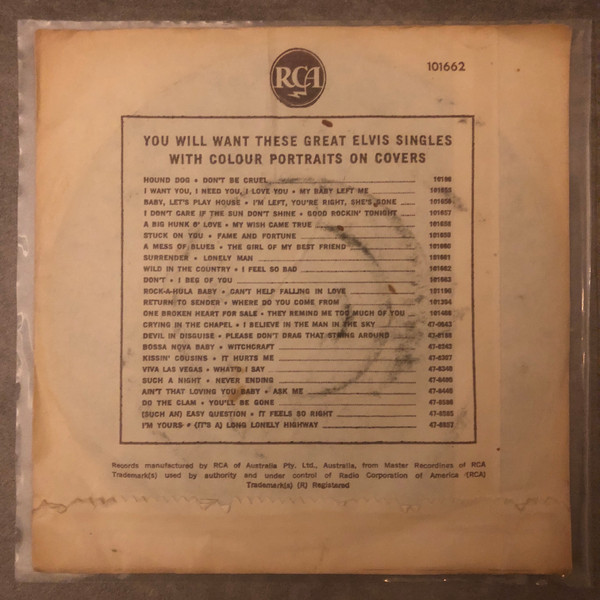 | Label: RCA – 101662 Format: Vinyl, 7", 45 RPM, Single, New Orthophonic Country: Australia Released: 1965 Part of the Australian Elvis portrait series. |