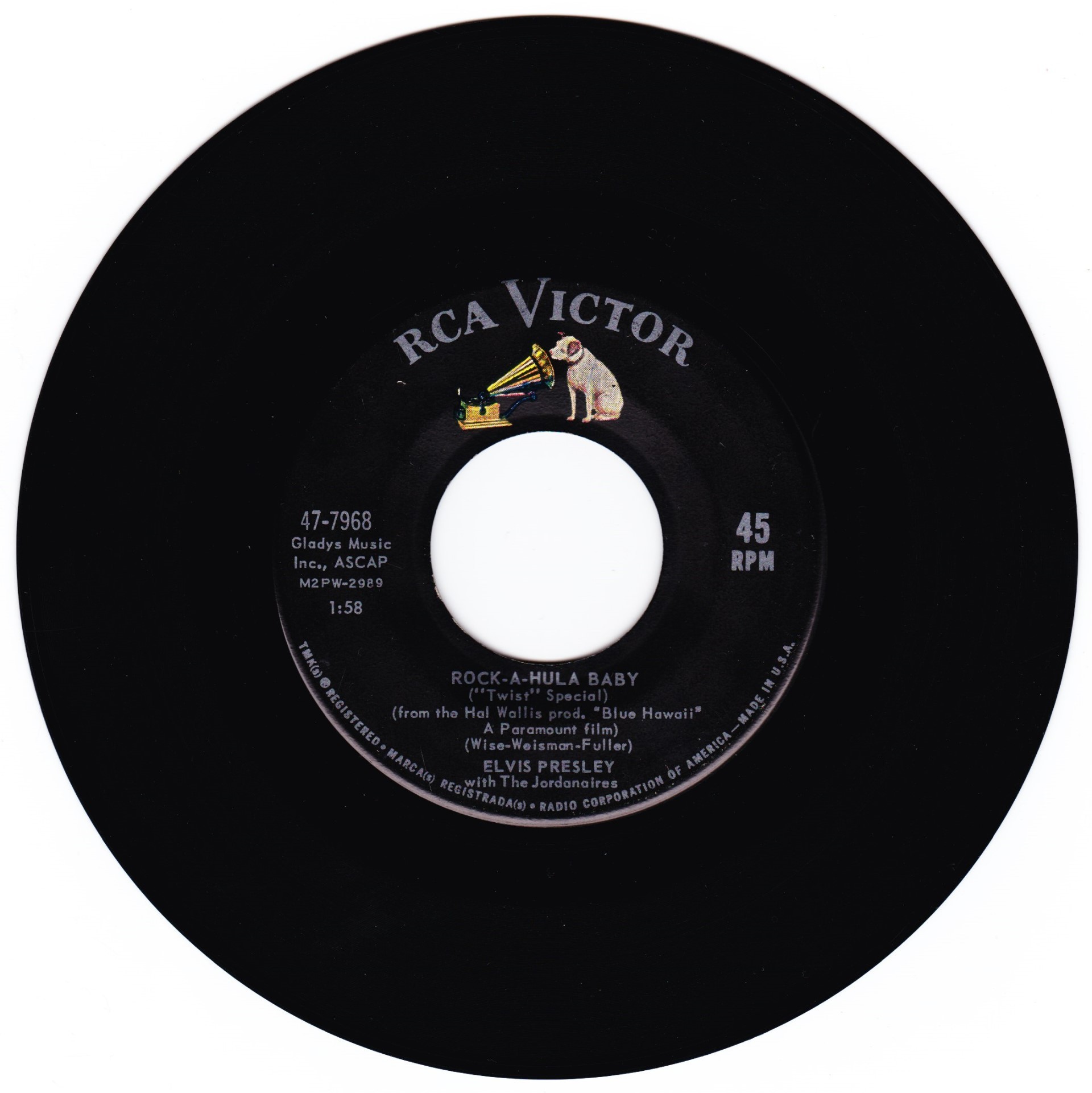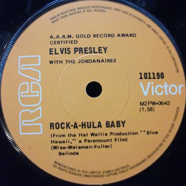 Label: RCA – 45-RCA 1270 Format: Vinyl, 7", Single, 45 RPM, Label variant, mispressing Country: UK Released: Jan 1962 Published By – Manor Music A-side text on label appears to be mispressed. Beneath the words "ELVIS PRESLEY" instead of saying "with THE JORDANAIRES" it says "Film "BLUE HAWAII")" Otherwise identical to Elvis Presley With The Jordanaires - Can't Help Falling In Love / Rock-A-Hula Baby ("Twist Special") Rights Society: BIEM NCB |