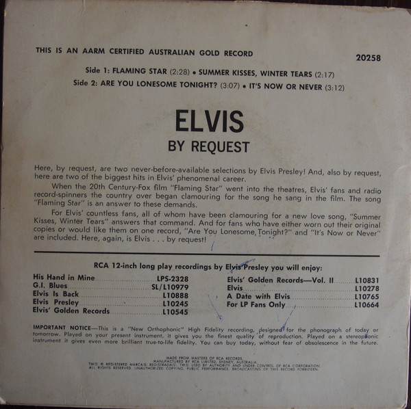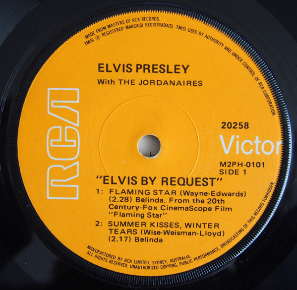 | Label: RCA Victor – 20258 Format: Vinyl, 7", 45 RPM, EP, Reissue, Orange Labels Country: Australia Released: 1977 Manufactured By – RCA Limited, Australia Matrix / Runout: M2PH-0101 |