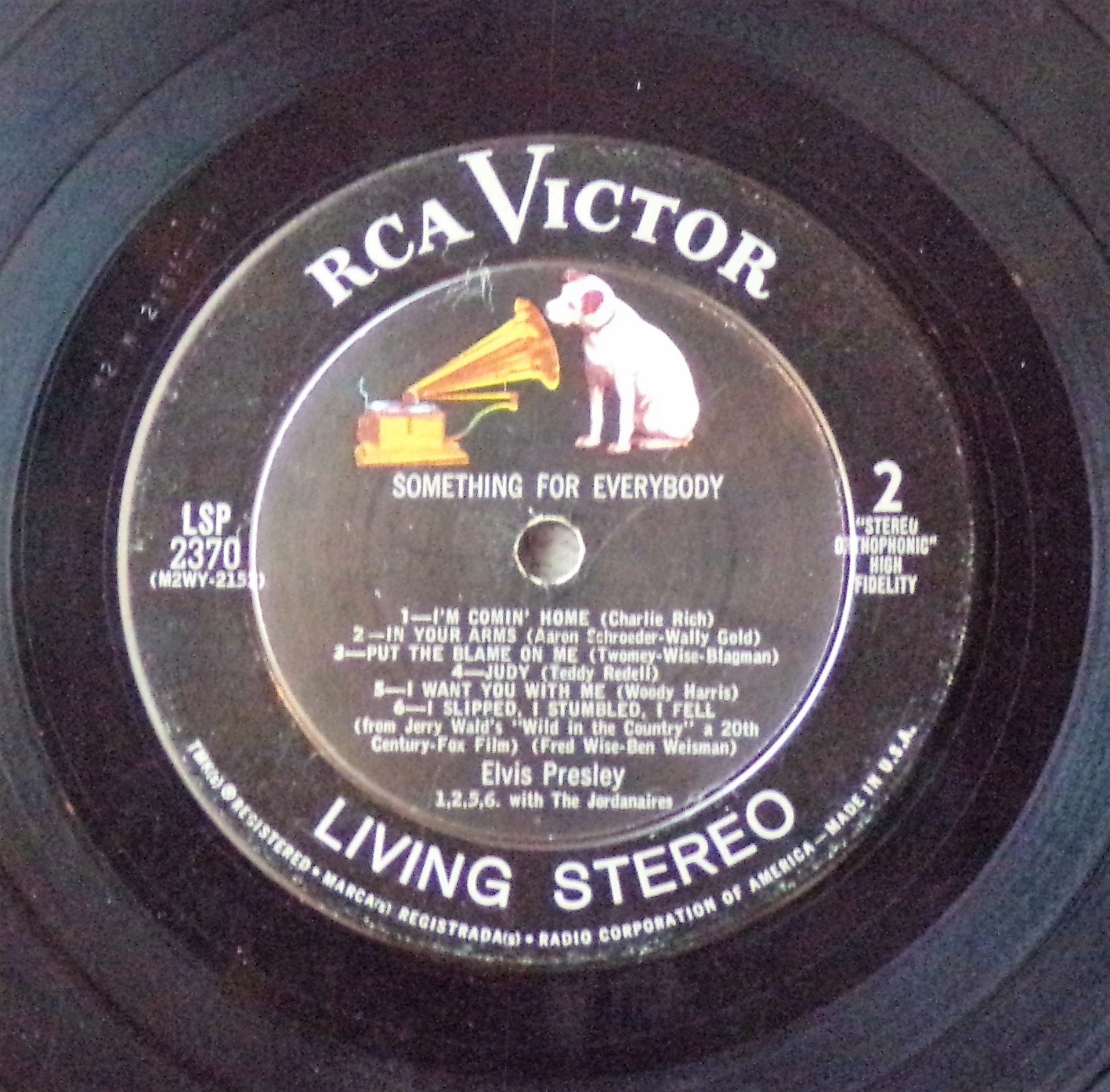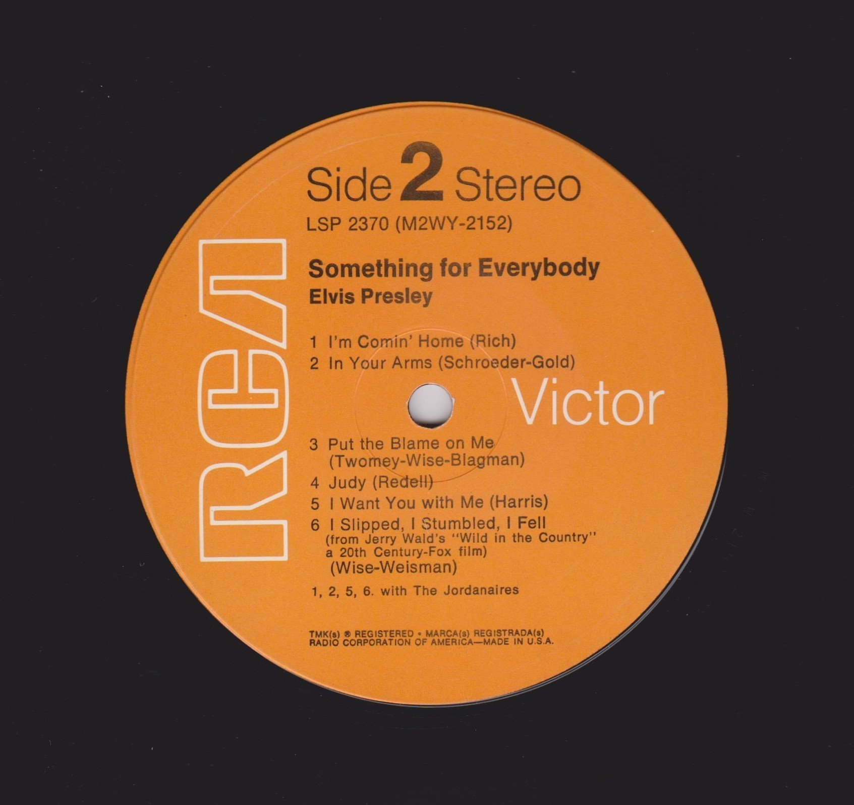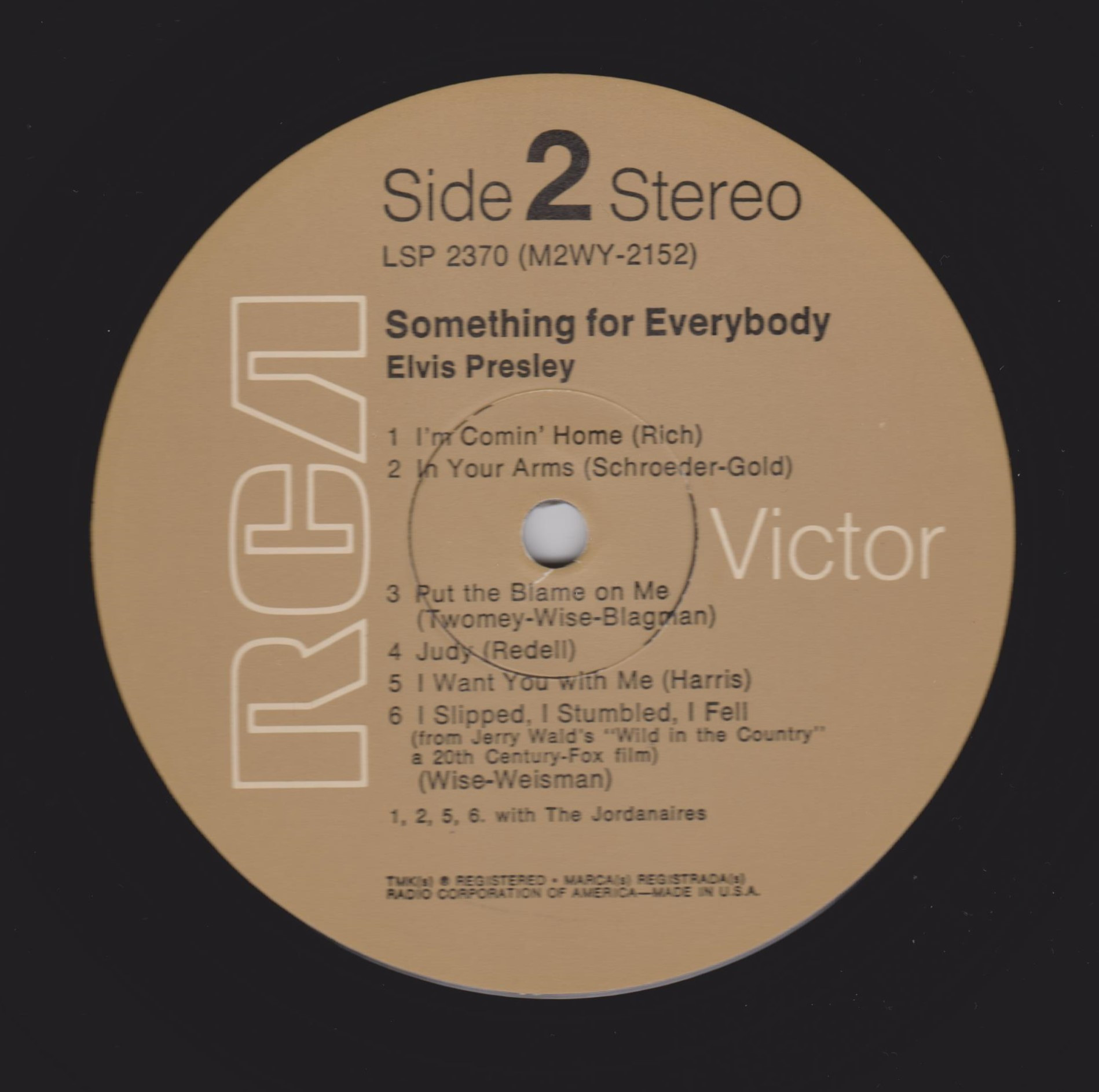 Radio Recorders, Hollywood, November 8, 1960 Something For Everybody is the thirteenth album by Elvis Presley, released on RCA Victor in mono and stereo, LPM/LSP 2370, in June 1961. Recording sessions took place on November 8, 1960, at Radio Recorders in Hollywood, and on March 12, 1961 at RCA Studio B in Nashville, Tennessee. It peaked at #1 on the Top Pop Albums chart. It was certified Gold on 7/15/1999 by the R.I.A.A. After his military discharge from the army in March 1960, any doubts about Presley's ability to recapture the momentum of his career in the 1950s had been laid to rest. During that year his three singles had all topped the charts, and his first album, Elvis Is Back!, had gone to #2 on the album chart. His musical film G.I. Blues had been wildly successful, its soundtrack also going to #1 on the album chart. Pressing on, he entered the familiar Studio B in Nashville and recorded eleven of the tracks for this album in one twelve-hour session, in addition to the single "I Feel So Bad". The single was initially scheduled to be the twelfth track for the album, but Presley chose it to accompany the title track to the film Wild in the Country as the promotional 45 for the film. Another track that had appeared in the film but not released commercially on records, "I Slipped, I Stumbled, I Fell", became the final track for the album. Front Cover : Photo of Elvis. Song titles to right. Catalogue number