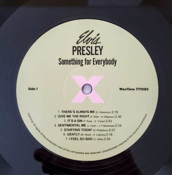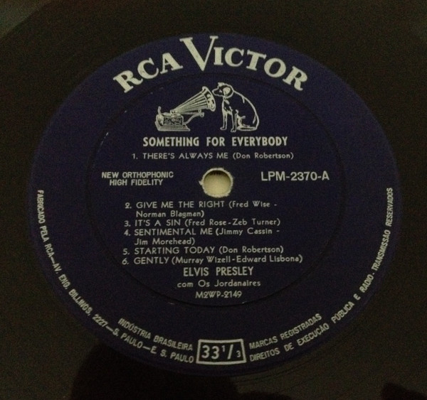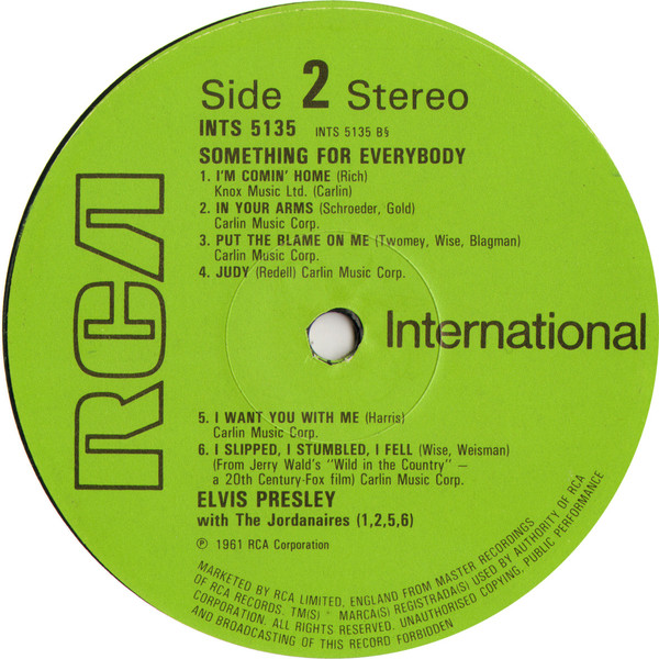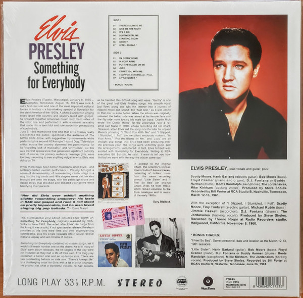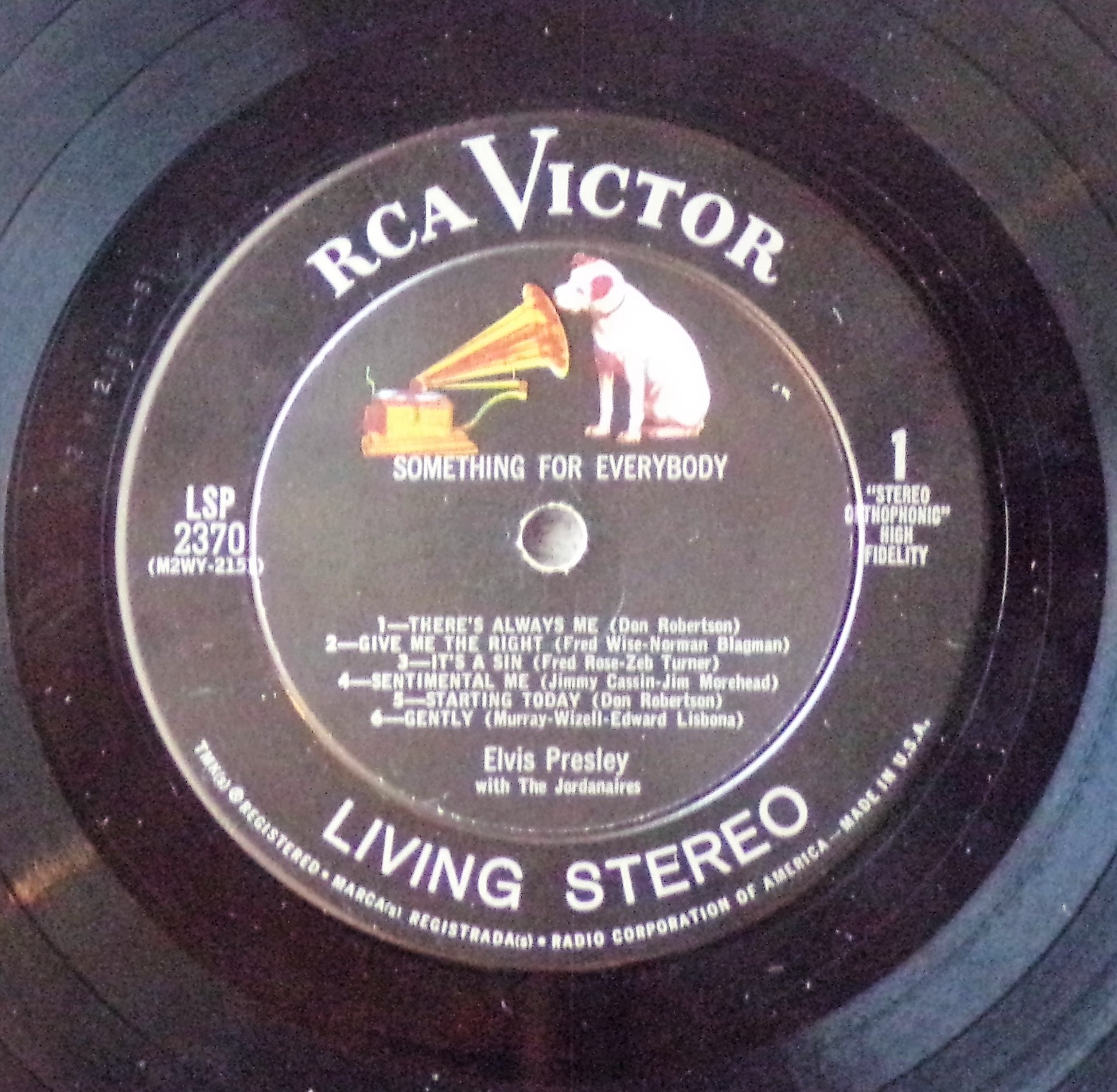 Radio Recorders, Hollywood, November 8, 1960 Something For Everybody is the thirteenth album by Elvis Presley, released on RCA Victor in mono and stereo, LPM/LSP 2370, in June 1961. Recording sessions took place on November 8, 1960, at Radio Recorders in Hollywood, and on March 12, 1961 at RCA Studio B in Nashville, Tennessee. It peaked at #1 on the Top Pop Albums chart. It was certified Gold on 7/15/1999 by the R.I.A.A. After his military discharge from the army in March 1960, any doubts about Presley's ability to recapture the momentum of his career in the 1950s had been laid to rest. During that year his three singles had all topped the charts, and his first album, Elvis Is Back!, had gone to #2 on the album chart. His musical film G.I. Blues had been wildly successful, its soundtrack also going to #1 on the album chart. Pressing on, he entered the familiar Studio B in Nashville and recorded eleven of the tracks for this album in one twelve-hour session, in addition to the single "I Feel So Bad". The single was initially scheduled to be the twelfth track for the album, but Presley chose it to accompany the title track to the film Wild in the Country as the promotional 45 for the film. Another track that had appeared in the film but not released commercially on records, "I Slipped, I Stumbled, I Fell", became the final track for the album. Front Cover : Photo of Elvis. Song titles to right. Catalogue number