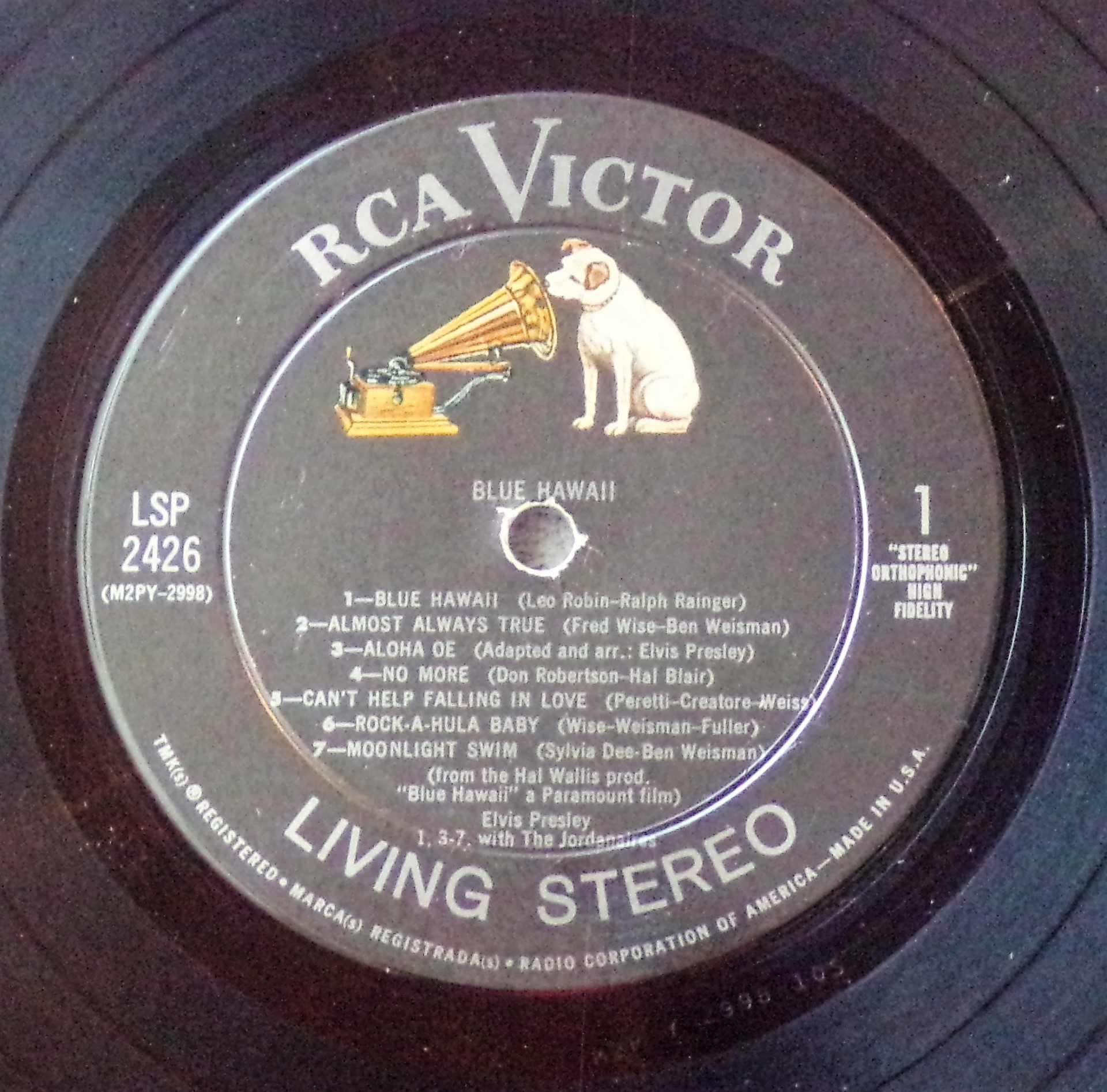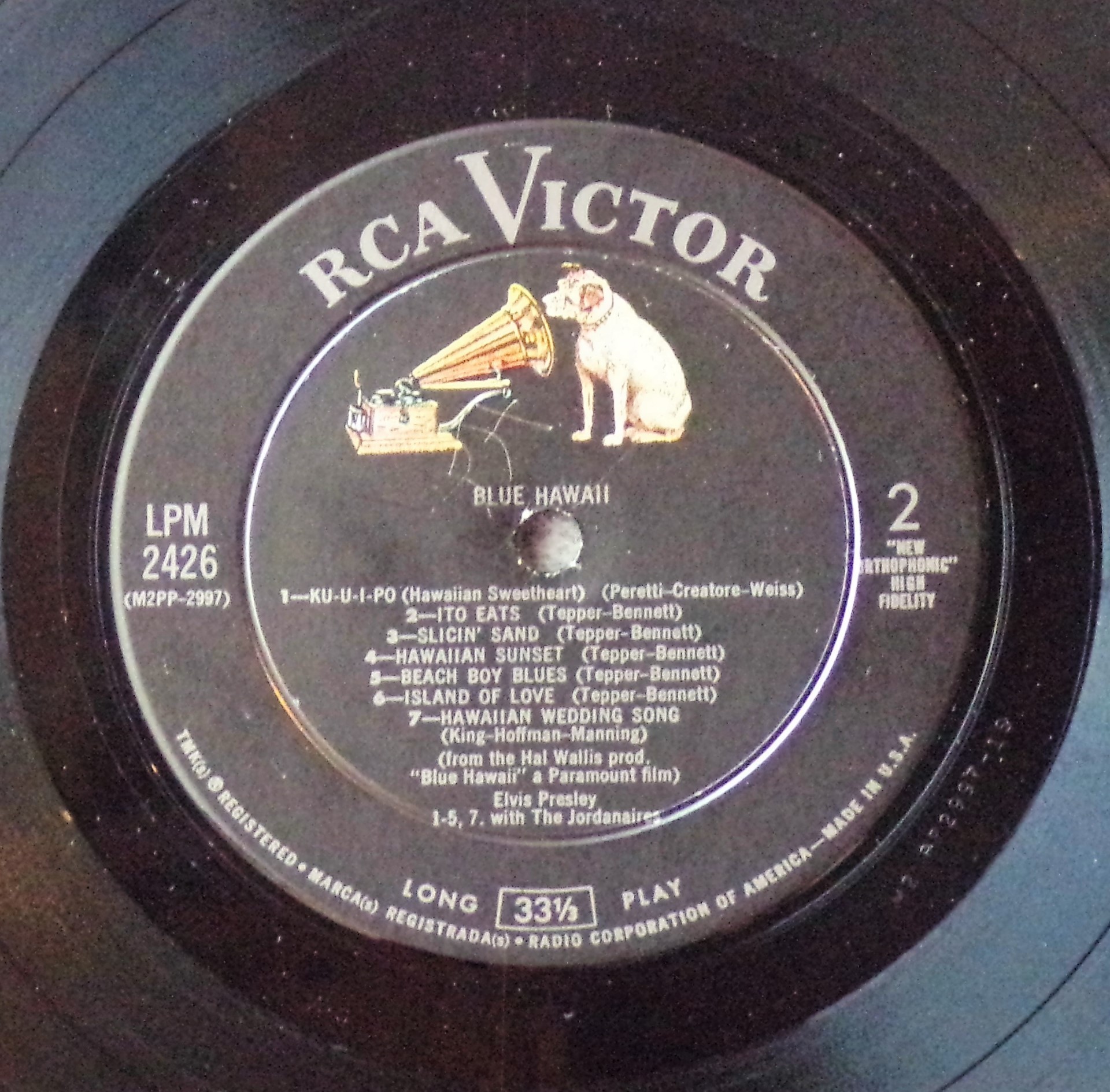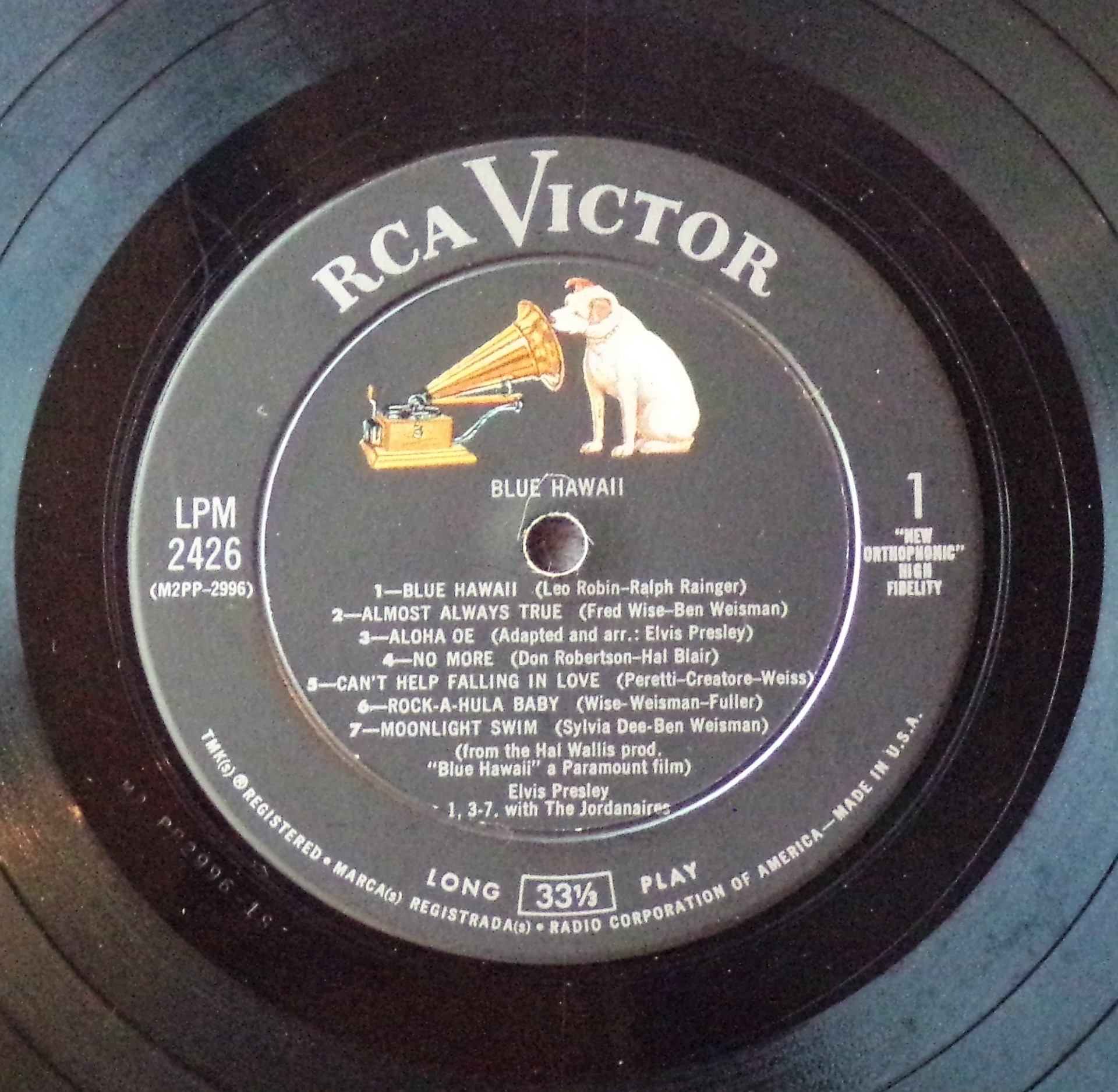 number bottom left. Logo top right. Bottom side left Printed In U.S.A. Rear Cover : 4 Elvis photos from Blue Hawaii. Catalogue number top right LPM/LSP 2426. Label : Black with silver lettering & dog on top. Side 1 : Right side has "New Orthophonic" High Fidelity under the number 1. Long Play at bottom. Side 2 : Right side has "New Orthophonic" High Fidelity under the number 2. Long Play at bottom. Pressing Plant : Indianapolis Matrix Number Side 1 : M2PP - 2996 - 1S B1 (Machine Stamped) Matrix Number Side 2 : M2PP - 2997 - 1S A3 (Machine Stamped) *NOTE* Front cover bottom side left Printed In U.S.A. |