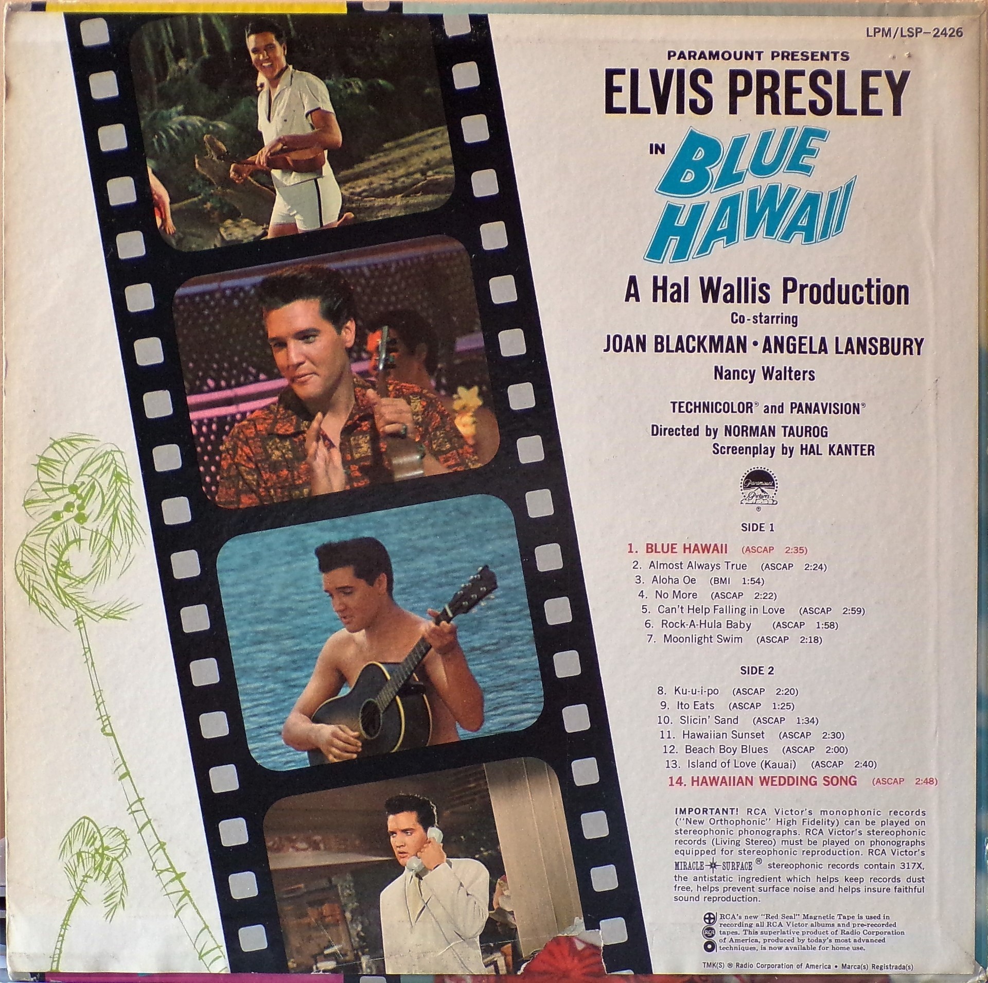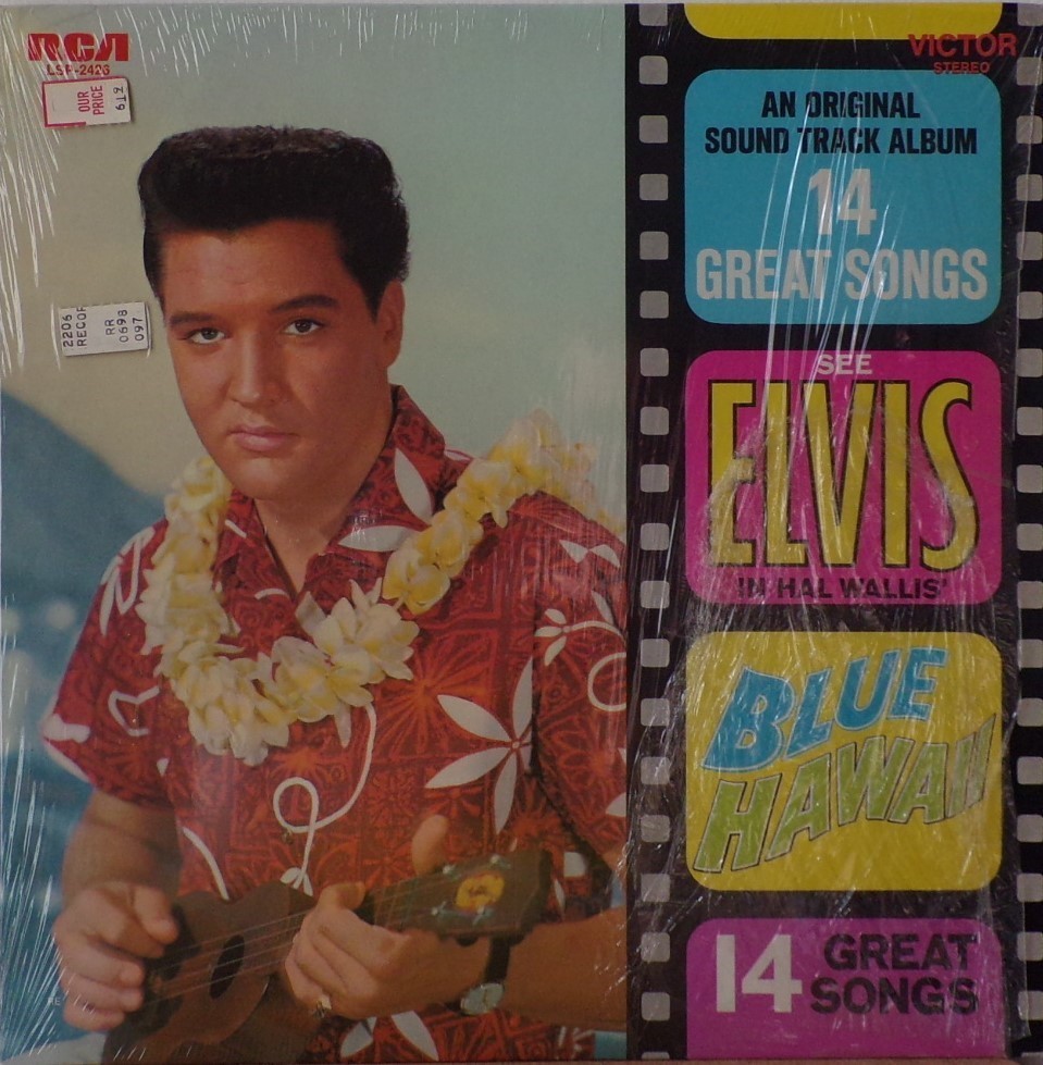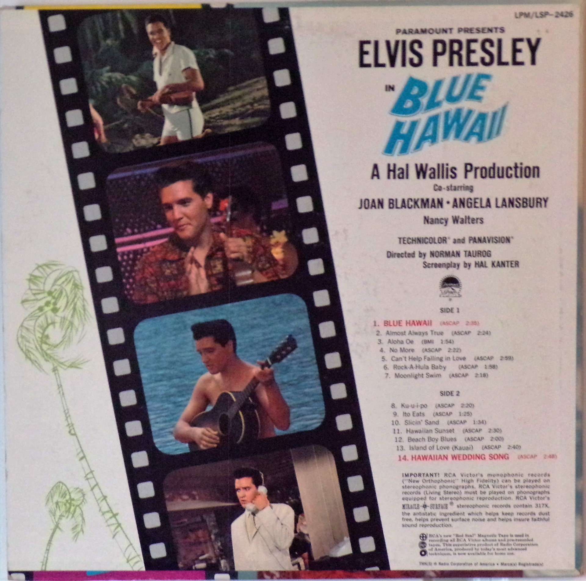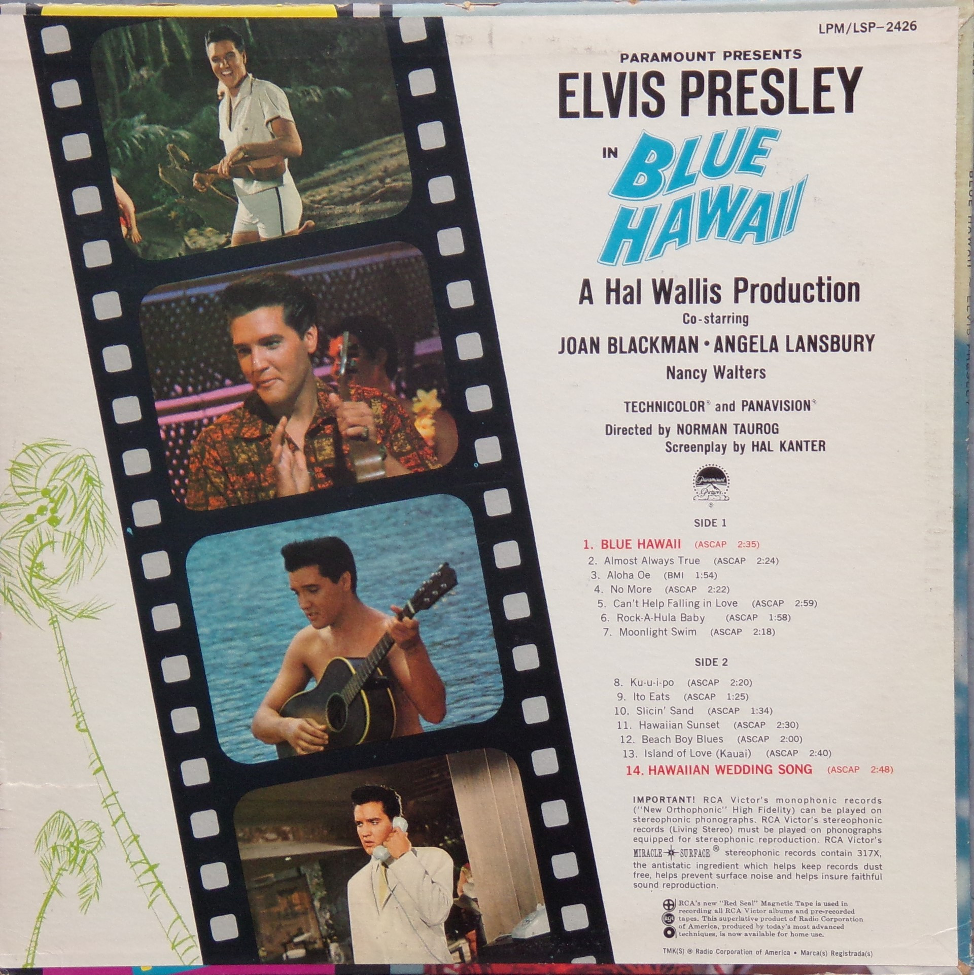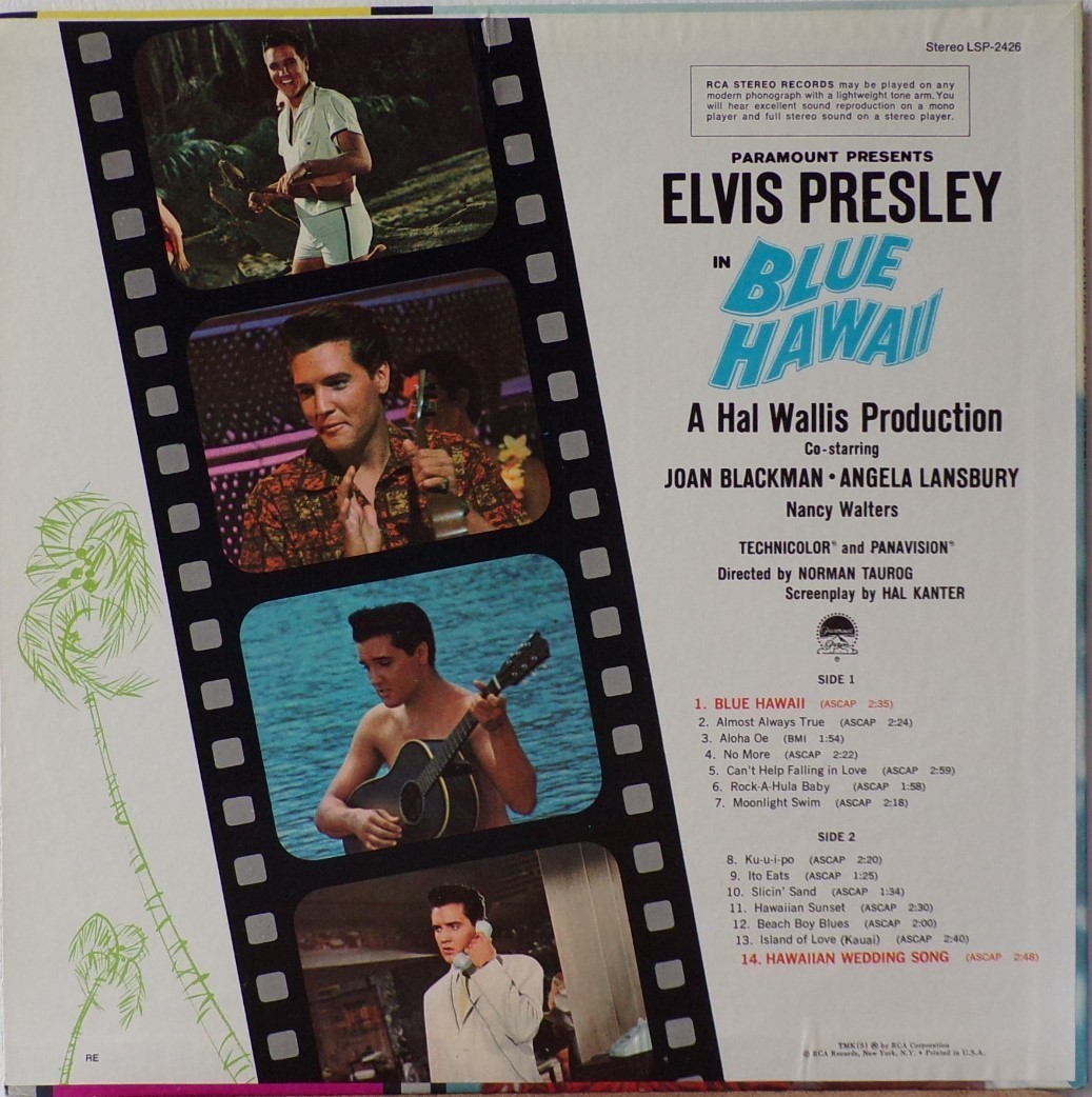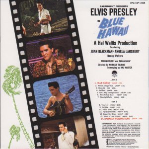 Recorders, Hollywood, March 21, 1961 Blue Hawaii is the fourteenth album by Elvis Presley, released on RCA Victor Records in mono and stereo, LPM/LSP 2426, in October 1961. It is a soundtrack for Presley's film of the same name. Recording sessions took place at Radio Recorders in Hollywood on March 21, 22, and 23, 1961. It spent 20 weeks at the #1 slot and 39 weeks in the Top 10 on the US Top Pop Albums chart. It was certified Gold on 12/21/1961, Platinum and 2x Platinum on 3/27/1992 and 3x Platinum on 7/30/2002 by the RIAA. On the US Top Pop Albums chart Blue Hawaii is the #2 most successful album of the 1960s, second only to West Side Story. RCA and the Colonel had initially planned a schedule of one soundtrack and one popular music release per year for Presley, in addition to the requisite four singles . To coincide with the location of the film, touches of Hawaiian music were included, from instrumentation to the traditional song "Aloha ?Oe." The title song was taken from a similar film Waikiki Wedding starring Bing Crosby in 1937, and "Hawaiian Wedding Song" dates from a 1926 operetta. The songs "Can't Help Falling In Love" and "Rock-A-Hula Baby" were pulled off the album for two sides of a single released the following month. The A-side "Can't Help Falling In Love," which would become the standard closer for an Elvis Presley concert in the 1970s, went to #2 on the Billboard Hot 100, while the b-side charted independently at #23. The Blue Hawaii soundtrack was nominated for a Grammy Award in 1961 in the category of Best Sound Track Album Or Recording Of Original Cast From A Motion Picture Or Television. The success of this soundtrack and its predecessor G. I. Blues, both of which sold in much greater quantity than Presley's two regular releases of the time, Elvis Is Back! and Something for Everybody, set the pace for the rest of the decade. The Colonel and Presley would focus on Elvis' film career, "normal" albums taking a back seat with only six during the 1960s against sixteen full-length soundtrack albums among 27 movies and the comeback special. Five songs from this album appear on the 1995 compendium of soundtrack recordings: the two sides of the single, "Blue Hawaii," Details :Front Cover : Photo of Elvis. Film title to right. Catalogue