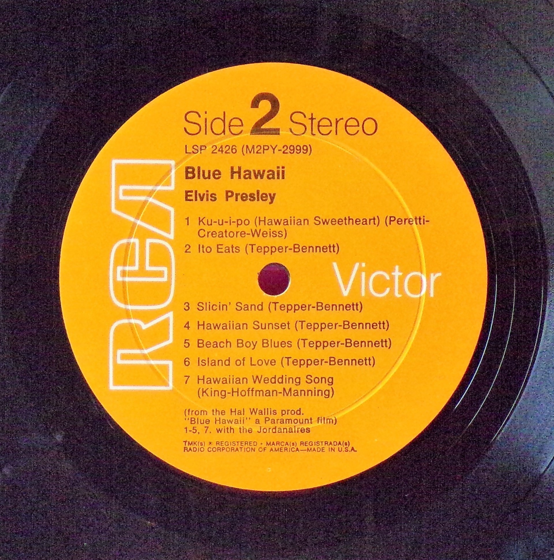 | Details : 1971 Release Front Cover : Photo of Elvis. Film title to right. Catalogue number top left. Living Stereo top right. Logo top right. Rear Cover : 4 Elvis photos from Blue Hawaii. Catalogue number top right LPM/LSP 2426. Label : Orange. Flexible vinyl. Side 1 : Stereo at top. Side 2 : Stereo at top. Pressing Plant : Indianapolis Matrix Number Side 1 : M2PY - 2998 - 17S B2 (Machine Stamped) X (Hand Etched) Matrix Number Side 2 : M2PY - 2999 - 19S A1 (Machine Stamped) X (Hand Etched) *NOTE*Front cover bottom side left Printed In U.S.A. |
