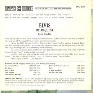 | Details : 1971 Release Front Cover : Photo of Elvis. Song titles to right. Catalogue number top left. Logo top right "Living Stereo". Rear Cover : Photo of 3 Elvis albums "Elvis TV Special", "How Great Thou Art" & "His Hand In Mine". Catalogue number top right. Label : Orange. Flexible vinyl. Side 1 : Stereo at top. Side 2 : Stereo at top. Pressing Plant : Hollywood Matrix Number Side 1 : M2WY - 2151 - 5S (Machine Stamped) Matrix Number Side 2 : M2WY - 2152 - 2S (Machine Stamped) *NOTE* Front cover bottom side right Printed In U.S.A. Rear cover "RE 2" & number "4" bottom left. Printed in U.S.A. bottom centre. |