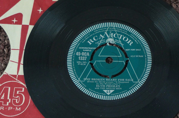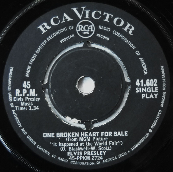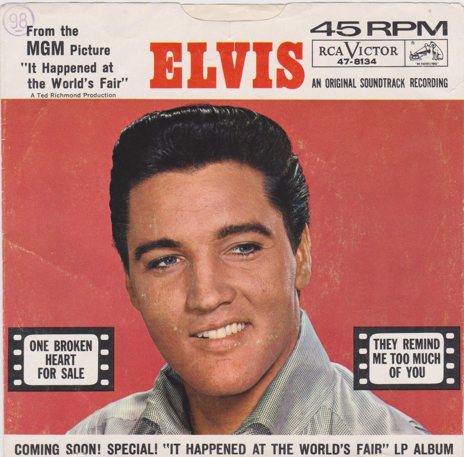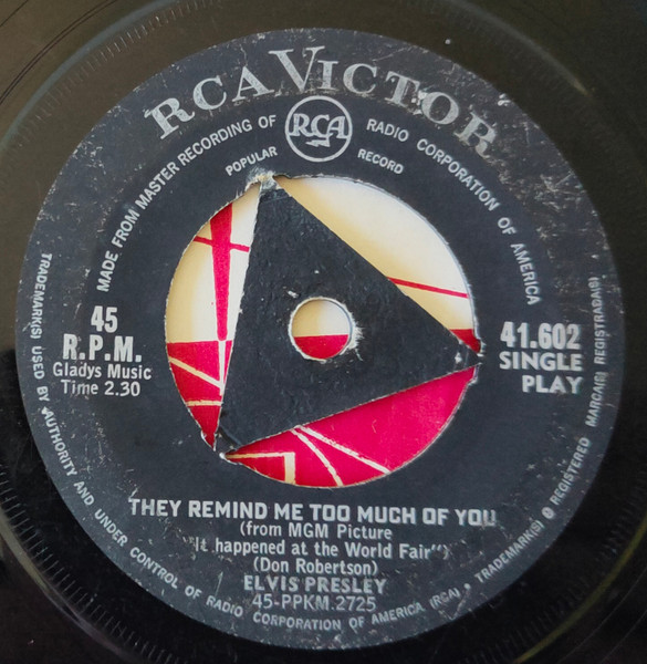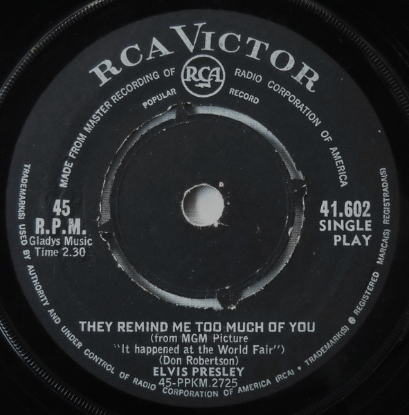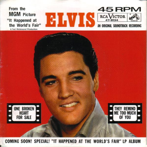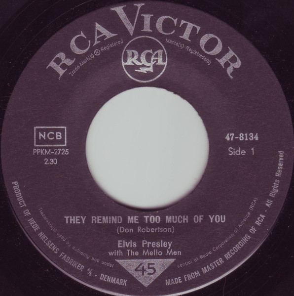 | Label: RCA Victor – 47-8134, RCA – 47-8134 Format: Vinyl, 7", 45 RPM, Single Country: Denmark Released: ??? Made By – Hede Nielsens Fabriker A/S From The MGM picture "It Happened At The World's Fair". This danish edition has "They Remind Me Too Much Of You" as Side 1 and "One Broken Heart For Sale" as Side 2, where as other editions of 47-8134 it is the other way around. Label : RCA on the sleeve, RCA Victor on the labels. Matrix / Runout (Side A Label): PPKM-2725 |