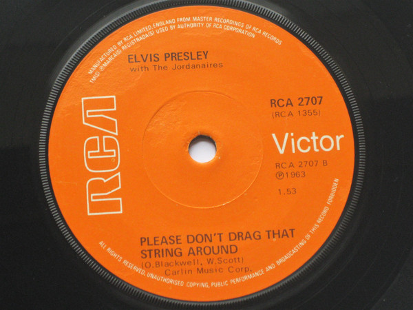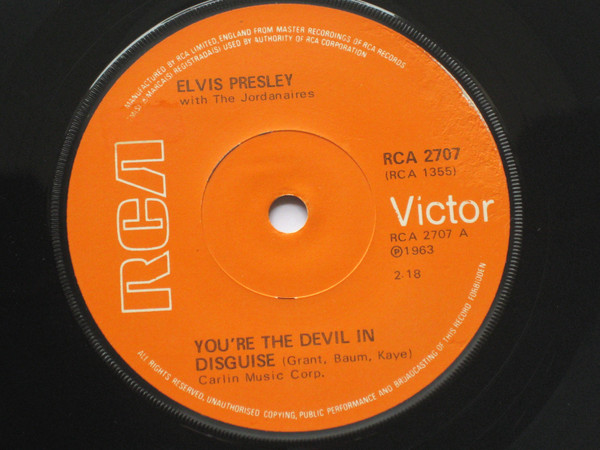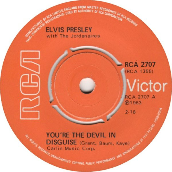 | Label: RCA Victor – RCA 2707, RCA Victor – RCA 1355 Format: Vinyl, 7", 45 RPM, Single, Reissue, 4-prong Centre Country: UK Released: May 1977 Manufactured By – RCA Ltd. Similar to Elvis Presley With The Jordanaires - (You're The) Devil In Disguise that has a solid centre and orange RCA Victor labels however, this version has a 4-prong centre, see UK release below. All runouts are etched Matrix / Runout (Label side A): RCA 2707 A |