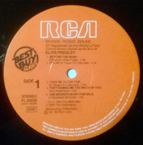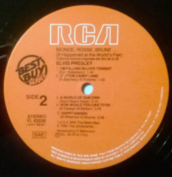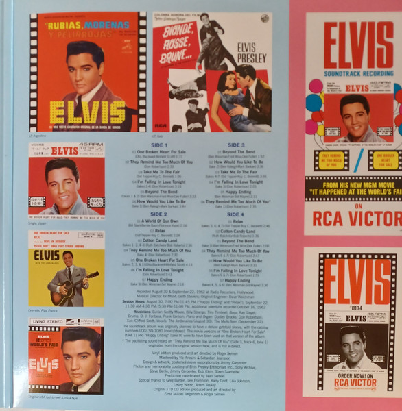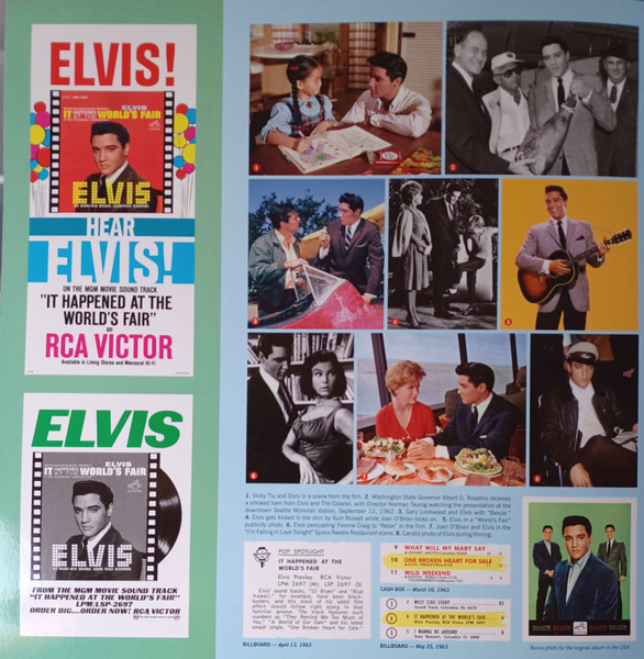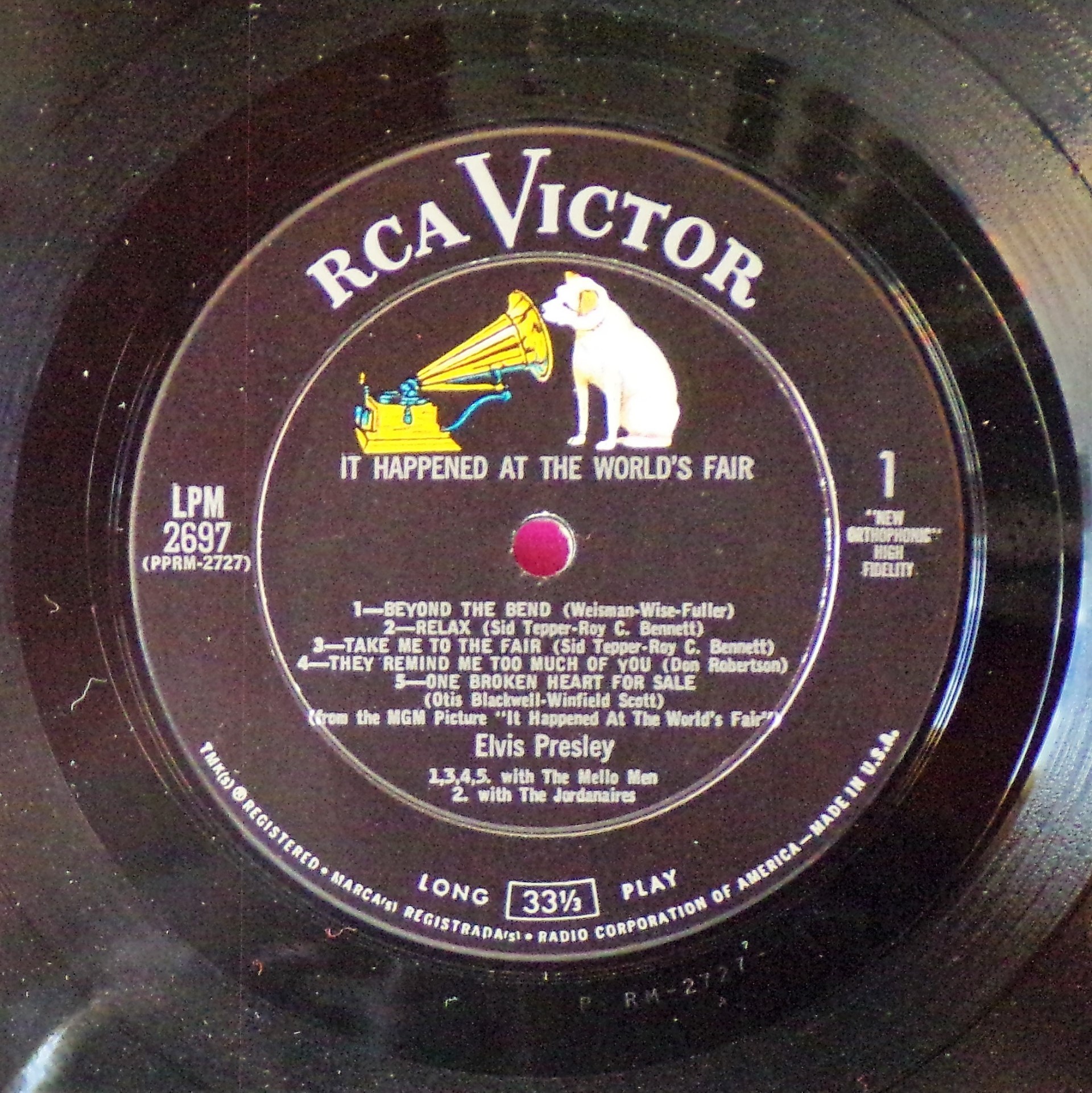 August 30, 1962 Brief History : It Happened at the World's Fair is the seventeenth album by Elvis Presley, released on RCA Victor Records in mono and stereo, LPM/LSP 2697, in April 1963. Recording sessions took place at Radio Recorders in Hollywood on August 30 and September 22, 1962. It peaked at #4 on the Billboard Top Pop Albums chart. Initially booked for August 28 and 29, sessions were delayed as Presley had taken ill, and only two numbers were completed satisfactorily on the first night of August 30. Ten songs were tackled for the soundtrack, the standouts being two written by one of Presley's favorite songwriters, Don Robertson taking an active part in the sessions by playing keyboards, and one by the team that had written the #2 hit single "Return to Sender" of the previous year, Otis Blackwell and Winfield Scott. All three songs, "I'm Falling In Love Tonight," "They Remind Me Too Much of You," and "One Broken Heart for Sale," would be included on the 1995 compilation of soundtrack highlights. "One Broken Heart for Sale" and "They Remind Me Too Much of You" would be released ahead of time on January 29 as a single to promote both the album and the film. "Broken Heart" just missed the top ten, peaking at #11 on the Billboard Hot 100, with the b-side charting independently at #53. Truncated with a verse excised to a very short length of 1:35, "Broken Heart" was the first RCA single of Presley's career that did not make the top five, excluding the bizarre case of "Shake Rattle and Roll" which did not chart at all after being released on August 31, 1956, simultaneously with the Presley debut album divided up into six singles. Front Cover : Photo of Elvis. Title on top. Catalogue