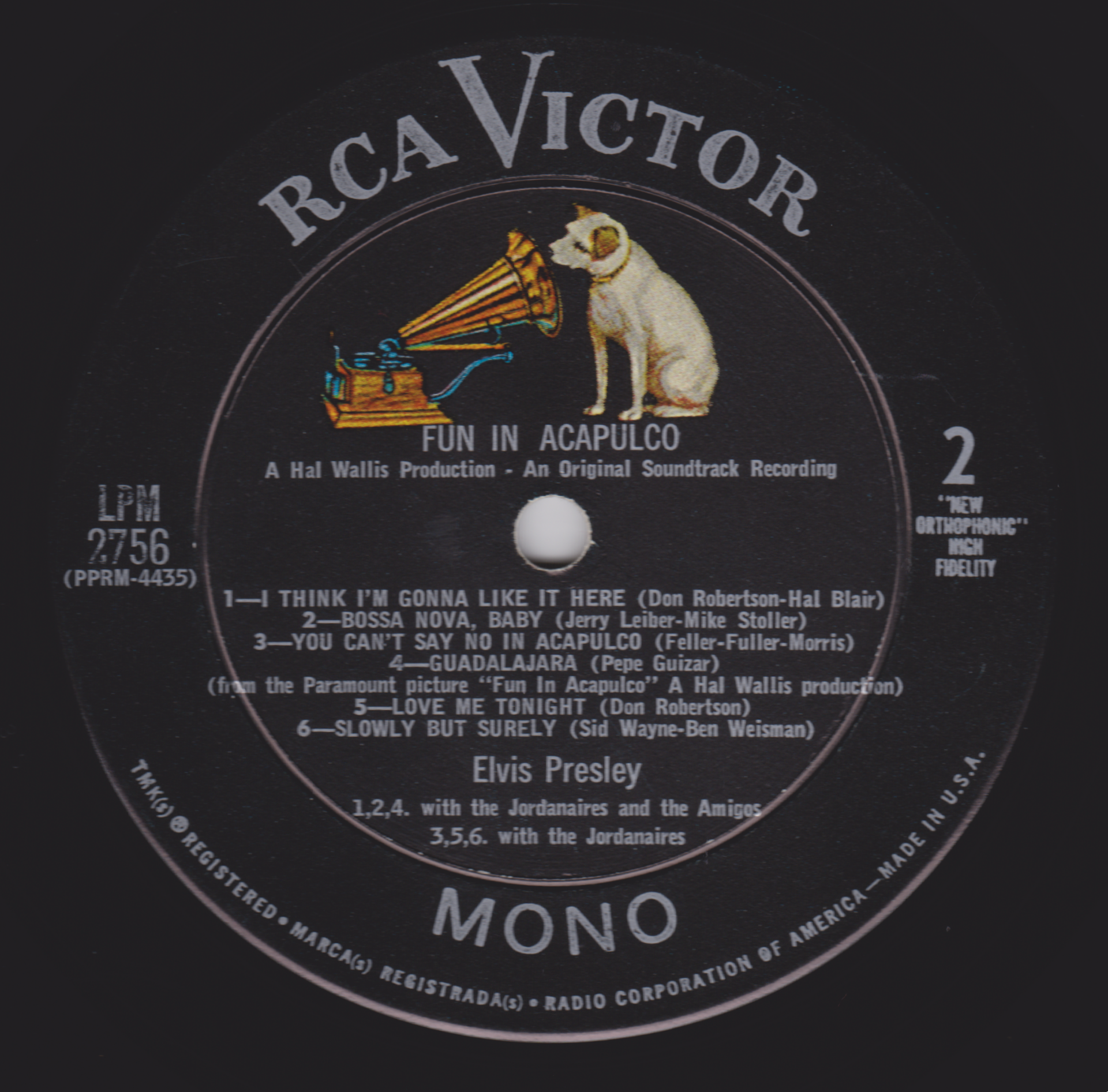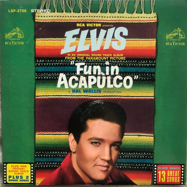 Hollywood, January 22, 1963 Brief History : Fun in Acapulco is the nineteenth album by Elvis Presley, released on RCA Victor Records in mono and stereo, LPM/LSP 2756, in November 1963 - the November 1 date is disputed. Recording sessions took place at Radio Recorders in Hollywood on January 22 and 23, 1963, and at RCA Studio B in Nashville, Tennessee, on May 26 and 27, 1963. It peaked at #3 on the Top Pop Albums chart. The album, along with the accompanying film, would be Presley's last release before the arrival of Beatlemania. The third of his tropical travelogue films for Paramount Pictures after Blue Hawaii and Girls! Girls! Girls! finds Elvis frolicing south of the border. The standard stable of songwriters for Presley delivered songs to match, with titles like "Marguerita," "El Toro," "You Can't Say No In Acapulco," and "The Bullfighter Was A Lady." Included as well was the old standard "Guadalajara" by Pepe Guízar from the 1930s. With the change from the normal routine, and with the addition of trumpet players Rudolph Loera and Anthony Terran, Presley engaged the material with greater enthusiasm than on recent soundtrack outings. Four of these songs would be included on the 1995 compilation of soundtrack highlights: the title track, "Mexico," "Marguerita," and the song released as the lead single, "Bossa Nova Baby." "Bossa Nova Baby" arrived in stores one month prior to the soundtrack, coupled with the track "Witchcraft" by rhythm and blues songwriter and arranger Dave Bartholomew and a hit for The Spiders in 1956. The fact that the bossa nova craze of the 1960s was a Brazilian phenomenon rather than a Mexican one mattered little, as the single peaked at #8 on the Billboard Hot 100. Compensating for the skimpy ten-track It Happened at the World's Fair album, the Colonel insisted on making Fun in Acapulco a good value. Two additional tracks, "Love Me Tonight" and "Slowly But Surely" were pulled from the aborted album sessions of May, 1963, and added here to bring the running order up to thirteen tracks. Details : *NOTE* Top of label states "A Hall Wallis Production - An Original Soundtrack Recording" under Fun In Acapulco in capitals. On labels Right side has "New Orthophonic" High Fidelity under the numbers 1 & 2. Jordanaires & Amigos on one line both sides of label. |