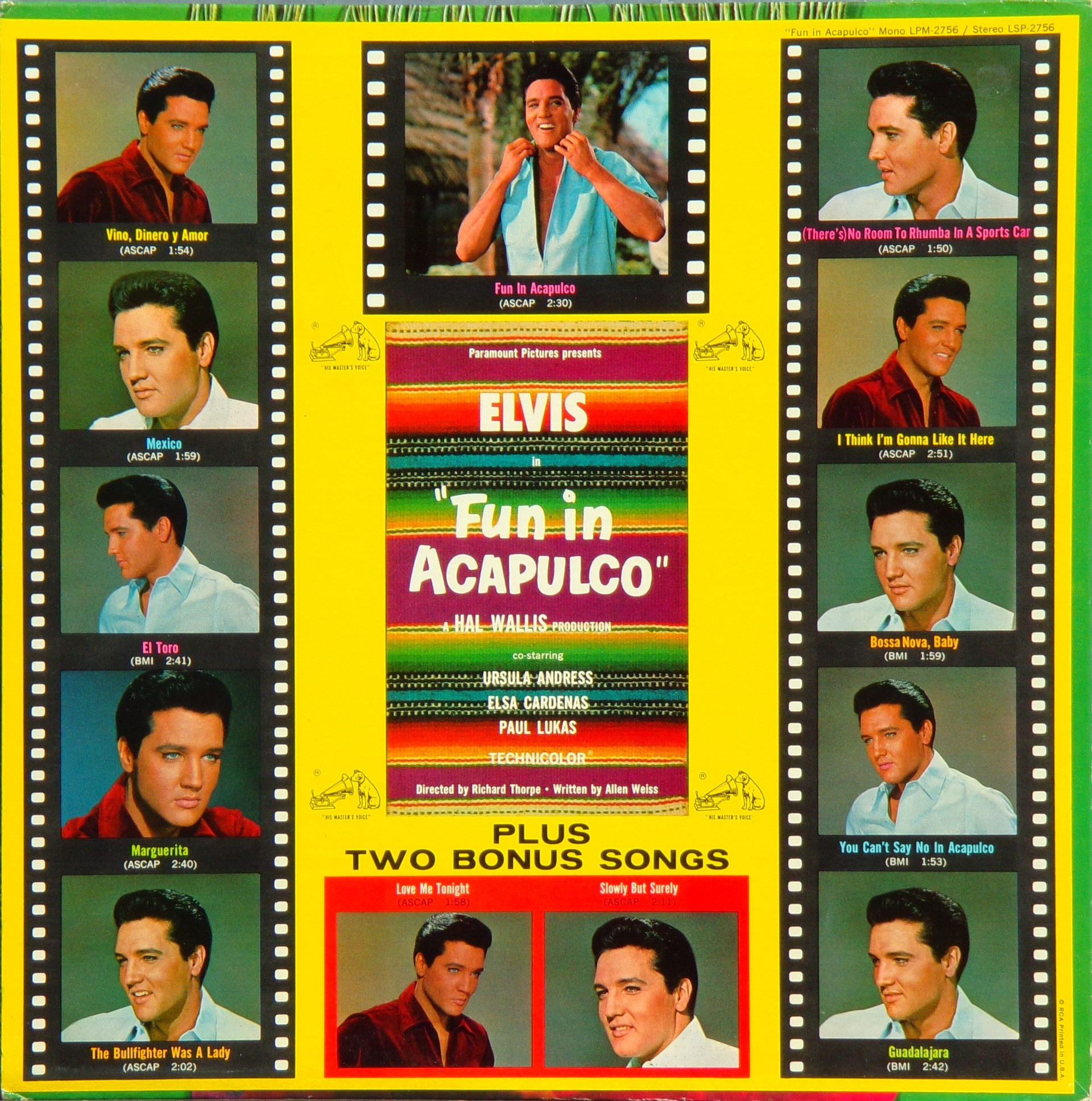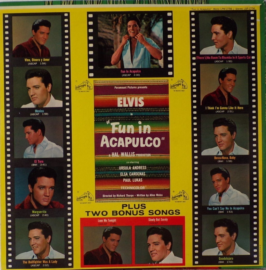 IN ACAPULCO (LP) (US) RCA LSP / LPM 2756 Released: November 15, 1963 Side 1 Fun In Acapulco ** Vino, Dinero Y Amor * Mexico * El Toro ** Marguerita * Bullfighter Was A Lady * No Room To Rhumba In A Sports Car ** Side 2 I Think I'm Gonna Like It Here * Bossa Nova Baby You Can't Say No In Acapulco ** Guadalajara ** 2 Bonus Songs (Not In Movie) Love Me Tonight *** Slowly But Surely **** * Recorded: Radio Recorders,