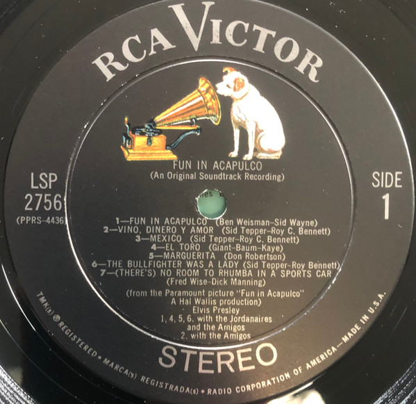 | Details : Front Cover : Photo of Elvis. Film title centred. Catalogue number bottom left. Rear Cover : 13 photos of Elvis. Catalogue number top right Mono LPM 2756 / Stereo LSP 2697. Printed in U.S.A. bottom side right. Label : Black with silver lettering & dog on top Side 1 : MONO at bottom Side 2 : MONO at bottom Pressing Plant : Rockaway Matrix Number Side 1 : PPRM - 4434 - 2S A (Machine Stamped) 2 (Hand etched) Matrix Number Side 2 : PPRM - 4435 - 2S A3 (Machine Stamped) *NOTE* Top of label states in brackets "(An Original Soundtrack Recording)" under Fun In Acapulco in capitals. No mention of "New Orthophonic" High Fidelity on labels. "SIDE" now added above numbers 1 & 2 on labels. Jordanaires & Amigos on two lines both sides of label. |