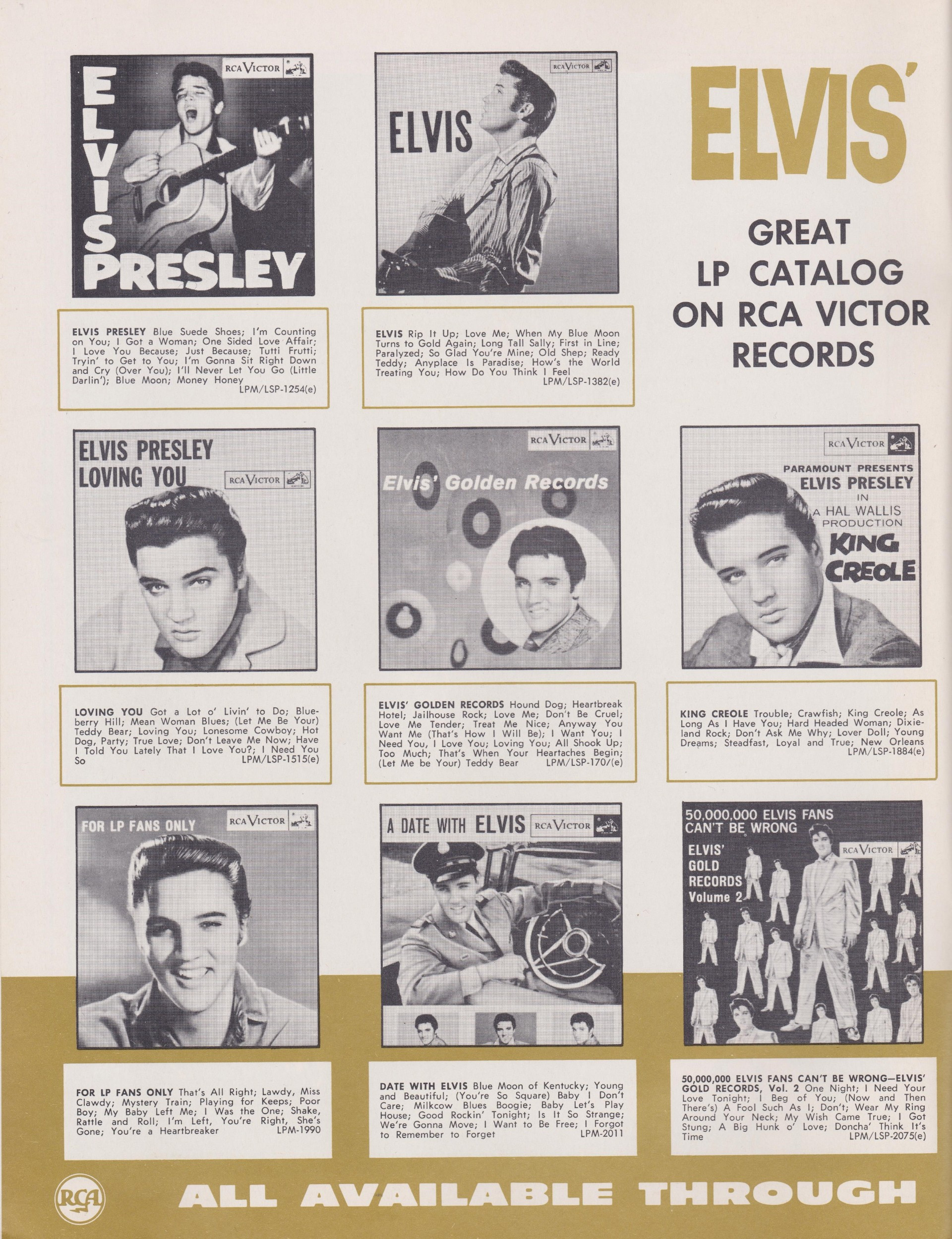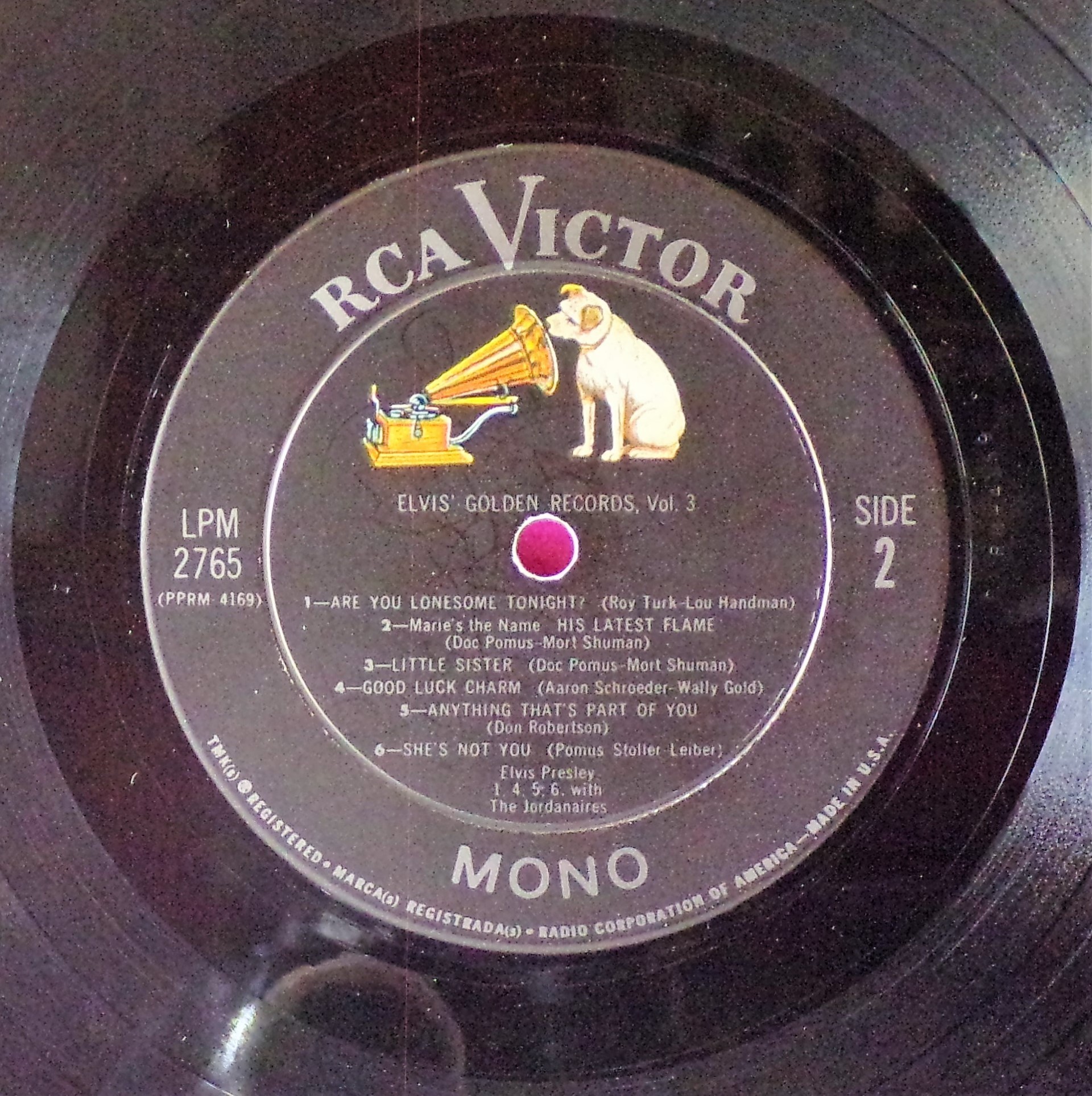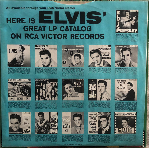 | Details : Catalogue Number : LPM 2697 Front Cover : Photo of Elvis. Title on top. Catalogue number bottom left. Logo top right below album title. Rear Cover : Catalogue number top right LPM/LSP 2697 below RCA Logo. Printed in U.S.A. bottom centre. Label : Black with silver lettering & dog on top. Side 1 : Right side has "New Orthophonic" High Fidelity under the number 1. Long Play at bottom. Side 2 : Right side has "New Orthophonic" High Fidelity under the number 2. Long Play at bottom. Pressing Plant : Hollywood Matrix Number Side 1 : PPRM - 2727 - 6S B (Machine Stamped) Matrix Number Side 2 : PPRM - 2728 - 6S B (Machine Stamped) *NOTE* No photo. MGM statement on vinyl labels on 1 line. Label font light grey. Elvis Presley on bottom of labels large font. |