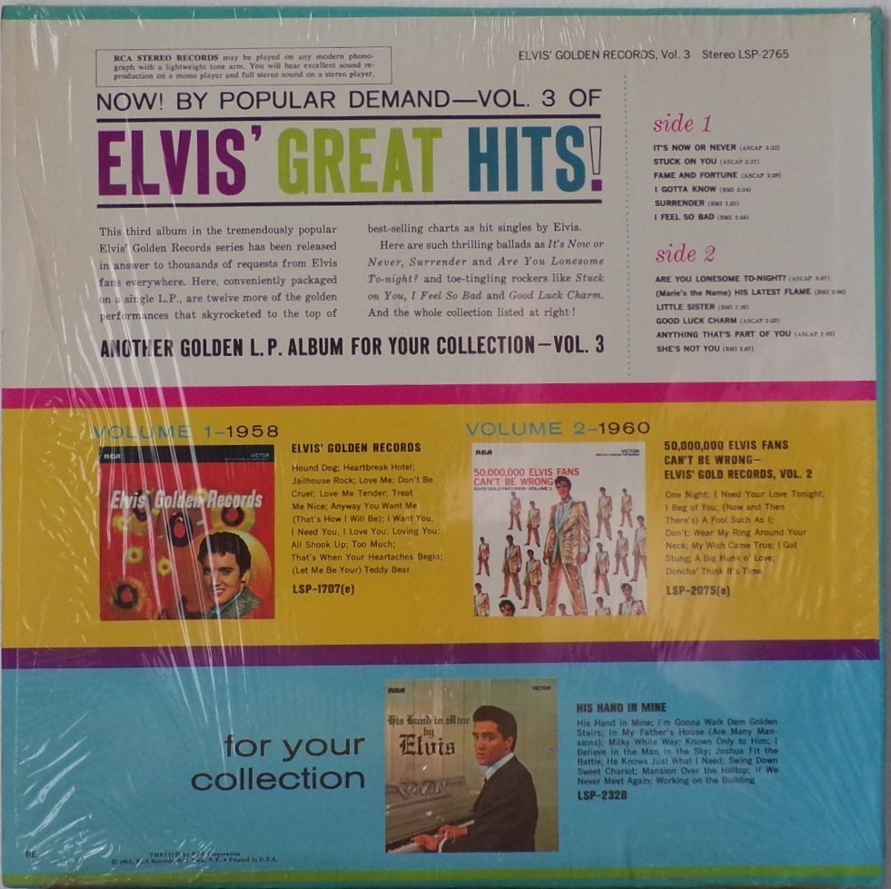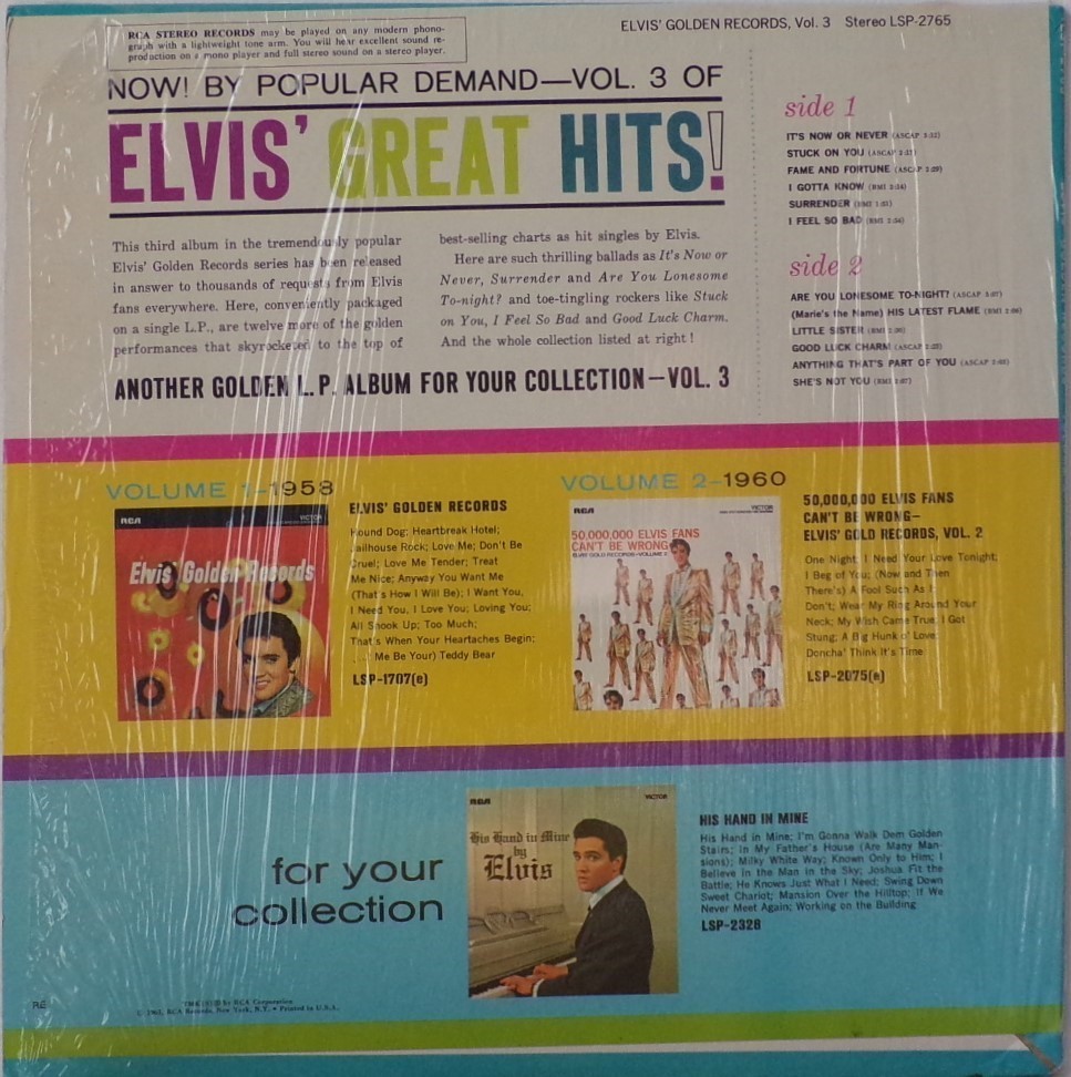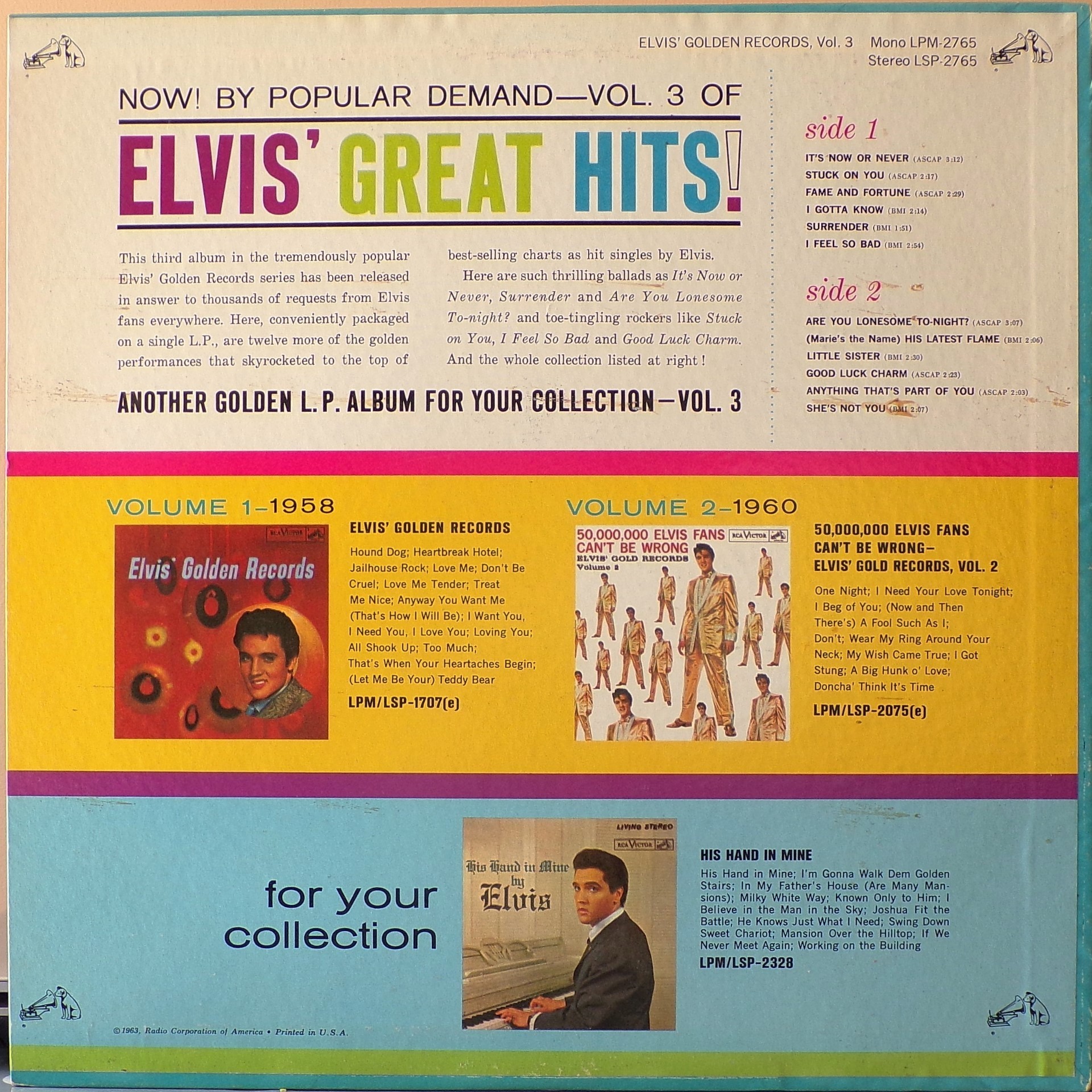 GOLDEN RECORDS VOLUME 3 (LP) Catalogue Number : LPM - 2765 Brief History : Elvis' Golden Records Volume 3 is a greatest hits album by American rock and roll icon Elvis Presley, released by RCA Victor, RCA Victor LPM-2765, on August 11, 1963. The record was the third volume of a five volume collection. It is a compilation of hit singles released in 1960, 1961, and 1962. The album was originally released as a mono and stereo LP record and was reissued several times. It was certified Gold on 11/1/1966 and Platinum on 3/27/1992 by the R.I.A.A. Colonel Parker envisioned a marketing strategy of alternating soundtrack albums with independent studio recordings, accompanied by singles. By mid-1963, Presley's studio albums had struggled while the soundtrack albums had all done brisk business. Sessions in late May had failed to produce material cohesive enough for a regular album, those tracks surfacing on singles and pell-mell on soundtracks and the Elvis for Everyone compilation. The immediate solution was another compilation of hit singles, the sales numbers proving the success of this interim strategy. Golden Records Volume 3 comprises eight Top Five A-sides along with four b-sides which also made the Top 40, "Fame and Fortune," "I Gotta Know" "Little Sister," and "Anything That's Part of You." Five A-Sides, "Stuck on You," "It's Now or Never," Are You Lonesome Tonight?," "Surrender," and "Good Luck Charm" went to #1. "It's Now or Never" had been adapted from the 1898 Neapolitan song "O Sole Mio," and "Are You Lonesome Tonight," a ballad from 1926, had been a rare request to Elvis from the Colonel for his wife. As with the other titles in the series, all singles in this compilation are certified by the RIAA as attaining gold status with sales of at least 500,000 copies. Original recordings produced by Steve Sholes, Joseph Lilley, Chet Atkins, Urban Thielmann, Jeff Alexander, and Hans Salter. Details : *NOTE* The below 16 page full colour folio with a giant size pin up inside was given away at record stores with this release. On a further note in photo 6 (page 5 - last photo listed here) of the folio they listed Elvis' Golden Records Volume 3 as LPM / LSP 7117 which is incorrect. In photo 16 (page 15) they have listed it incorrectly also. The folio was released with 2 corrections after this. This folio also came with a giant size poster stapled inside. |