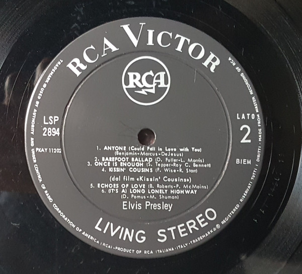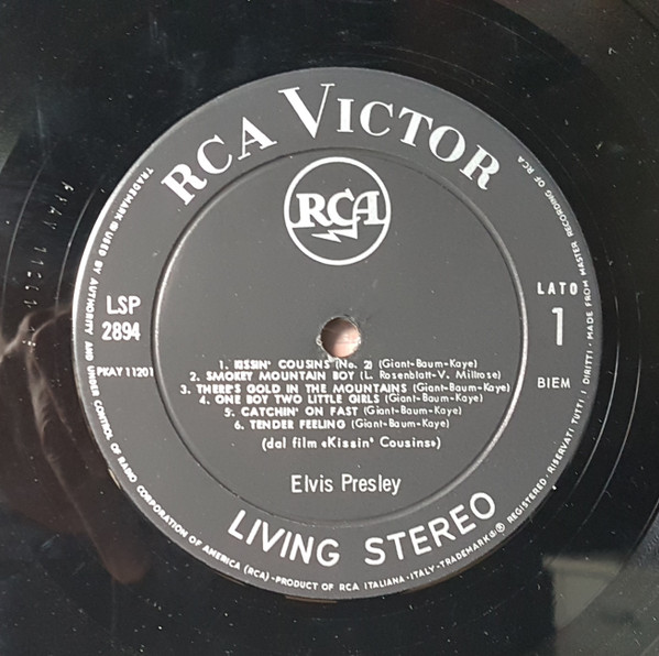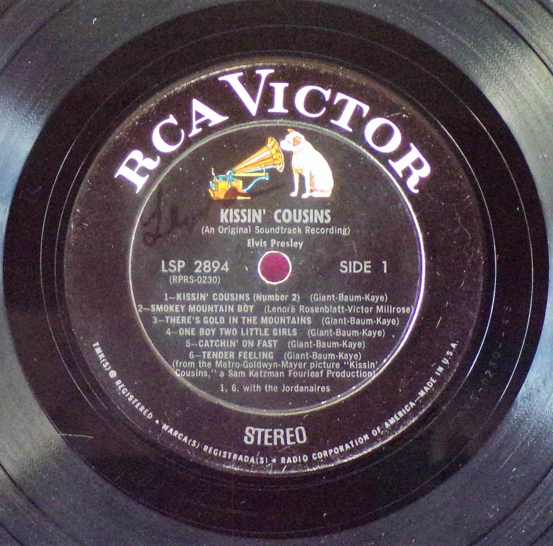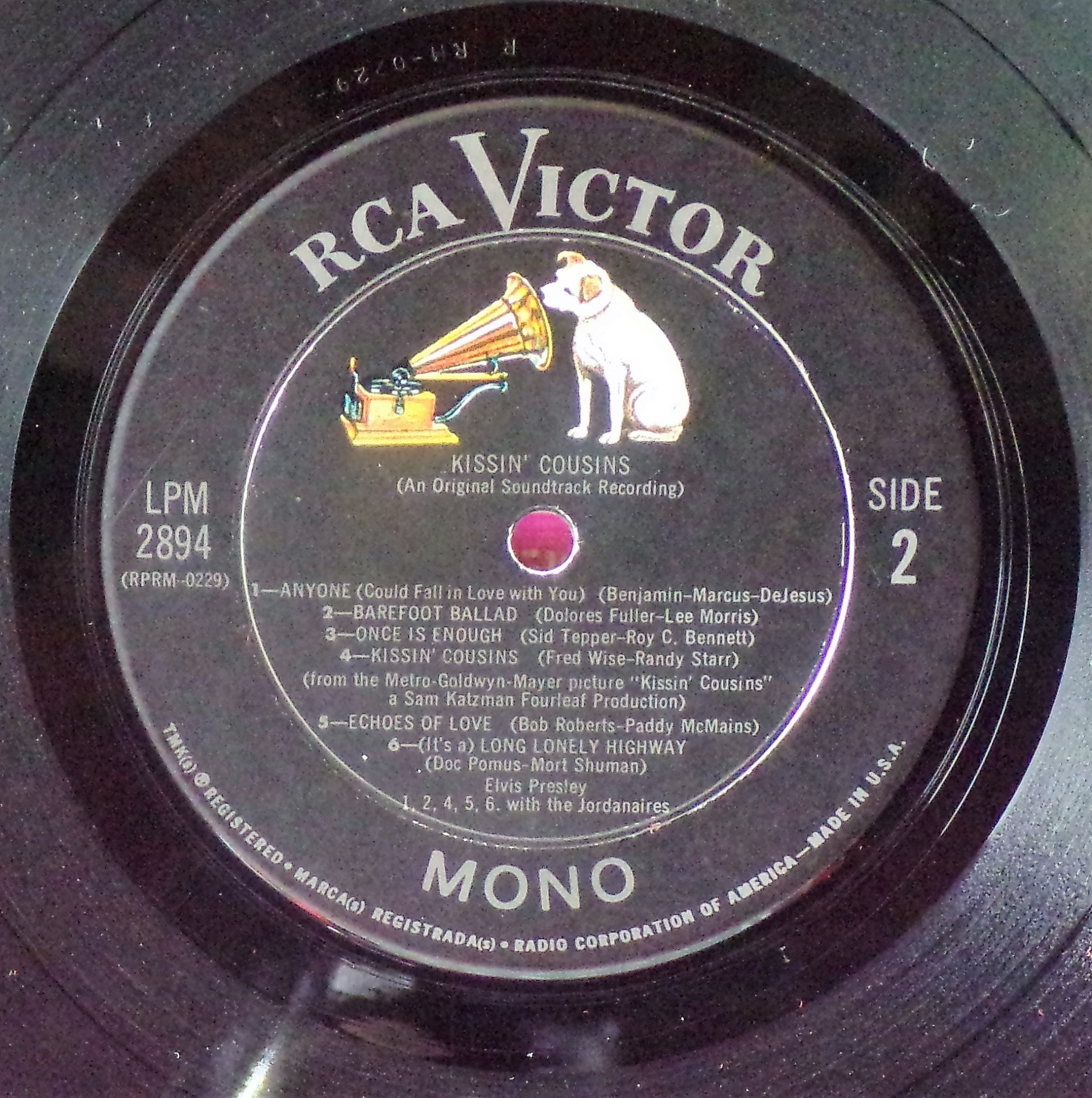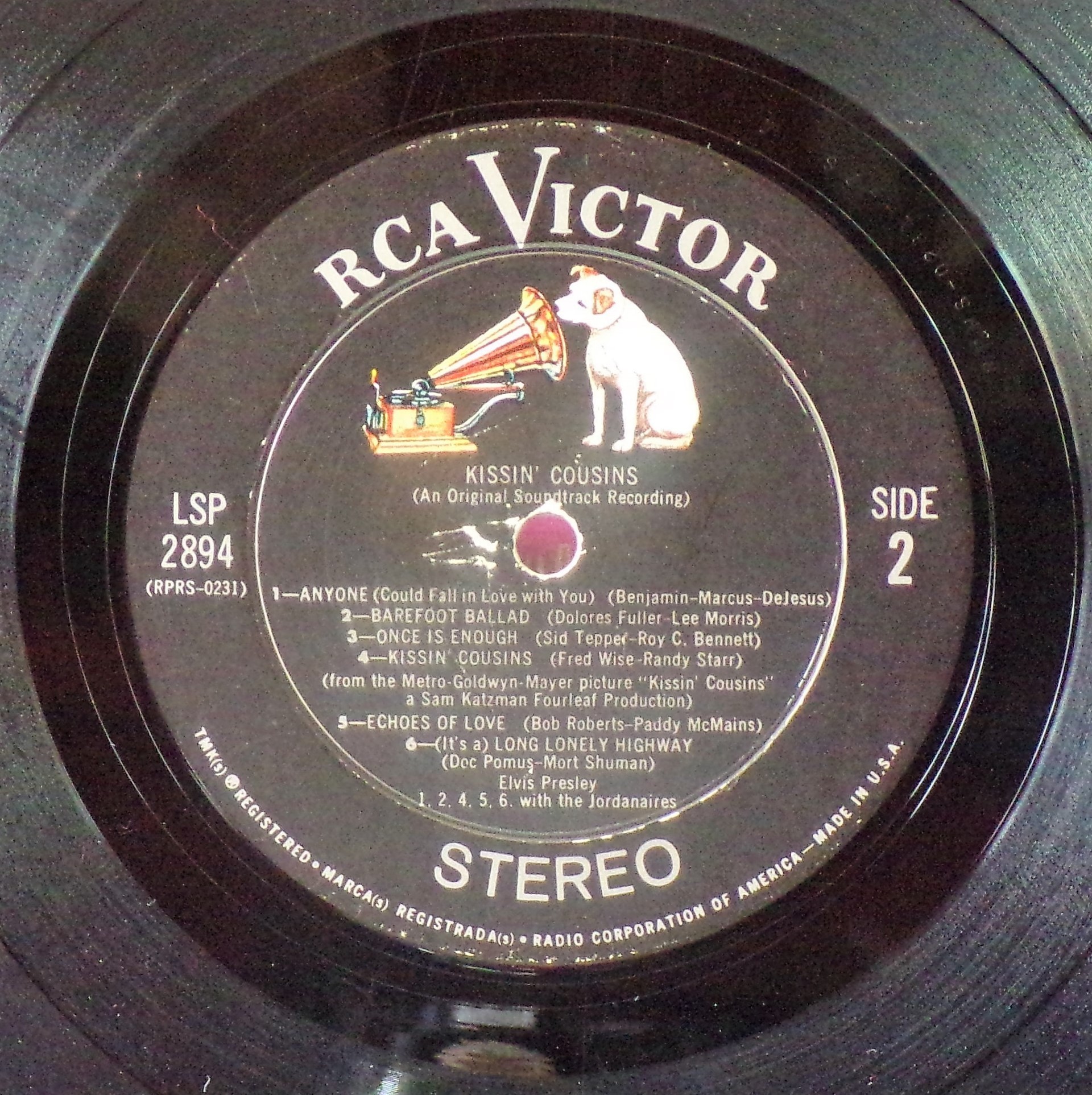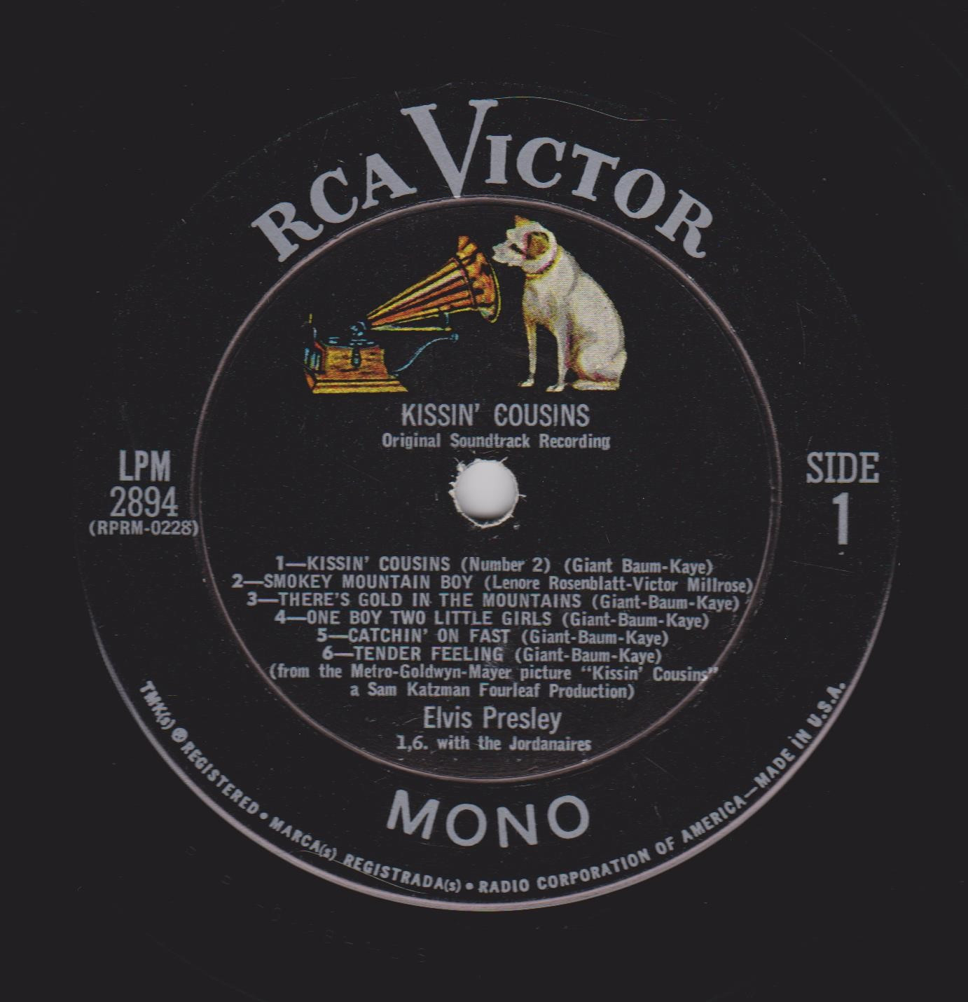 photo beneath. Catalogue number bottom left. Rear Cover : 6 photos of Elvis. Catalogue number top right Mono LPM 2894 / Stereo LSP 2894. Printed in U.S.A. above 3rd photo from left at bottom. Label : Black with silver lettering & dog on top. Side 1 : MONO at bottom. Side 2 : MONO at bottom. Pressing Plant : Rockaway Matrix Number Side 1 : RPRM - 0228 - 2S A5 (Machine Stamped) Matrix Number Side 2 : RPRM - 0229 - 2S A2 (Machine Stamped) *NOTE* Front cover has cast photo. Under Kissin Cousins on labels "An Original Soundtrack Recording". Light silver font on labels. |