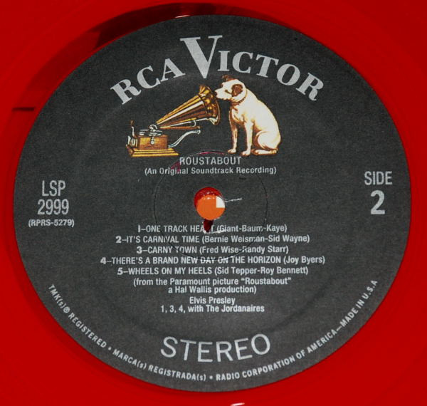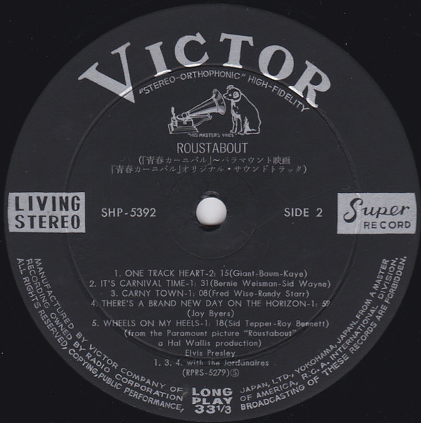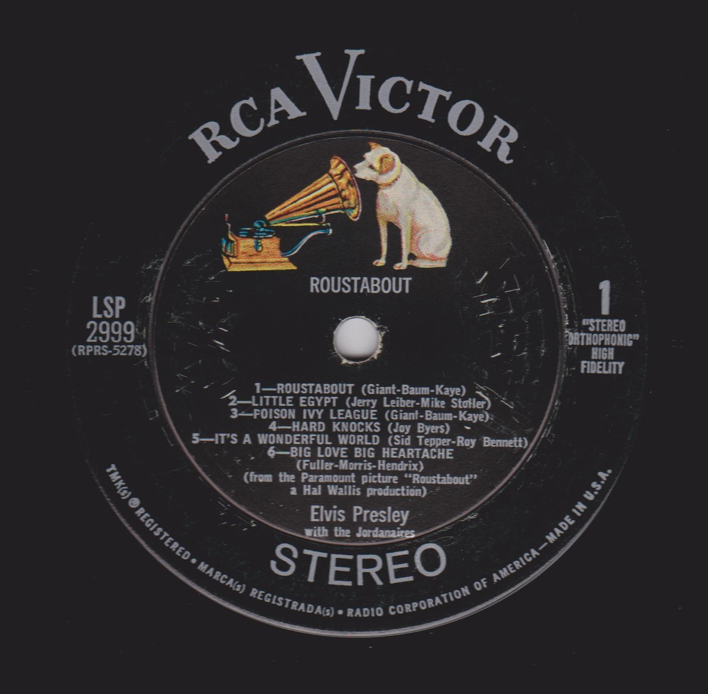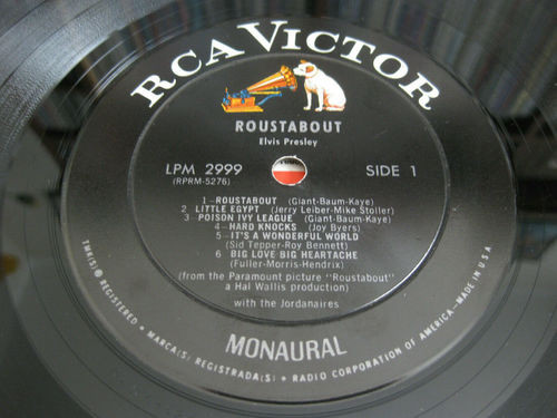 Radio Recorders, Hollywood, March 2, 1964 Brief History : Roustabout is the twenty-first album by Elvis Presley, released on RCA Victor Records in mono and stereo, LPM/LSP 2999, in October 1964. Recording sessions took place at Radio Recorders in Hollywood, California, on March 2 and 3, and April 29, 1964. It peaked at #1 on the Billboard Top Pop Albums chart. It was certified Gold on 5/20/1988 by the R.I.A.A. The album would be Presley's final soundtrack to reach #1 and his last #1 album until 1973's Aloha From Hawaii: Via Satellite. Payments to Presley for each film amounted to between $225,000 to $1,000,000 up front, often half the budget for production, with a 50% share of the profits. These movies were being shot in sometimes as little as three weeks, with the complete scoring and recording of the soundtrack albums taking no more than two weeks. It fell to Colonel Parker's lieutenant Freddy Bienstock to ensure that the soundtrack songs fit into the profit equation with the publishing controlled by Elvis Presley Music or Gladys Music, the Hill and Range Publishing companies owned by Elvis and the Colonel. As a result, successful writers such as Doc Pomus and Mort Shuman, Otis Blackwell and Winfield Scott, and Don Robertson lost interest in adhering to the needs of the grind. It was interlocking self-promotion, causing one MGM employee to remark that the movies "didn't need titles. They could be numbered. They would still sell. Blackwell and Scott in fact submitted a candidate for the title track, "I'm A Roustabout" recorded on March 3, only to find it substituted by a song from a different team of writers. This recording was eventually released by RCA on the top-selling 2003 compilation 2nd to None. Presley and his coterie of top session musicians gamely plowed through all of this, and eleven songs were recorded for the twenty-minute soundtrack LP. Details : 1965 RCA Silver Logo on top |