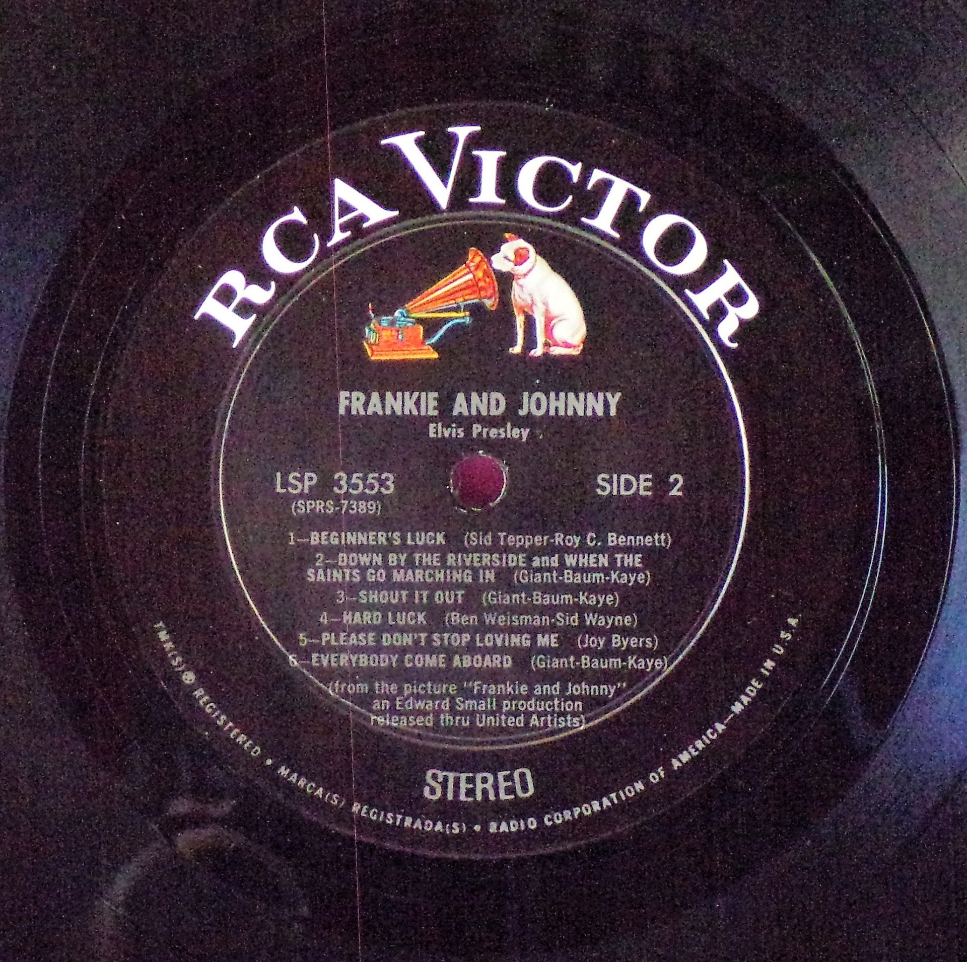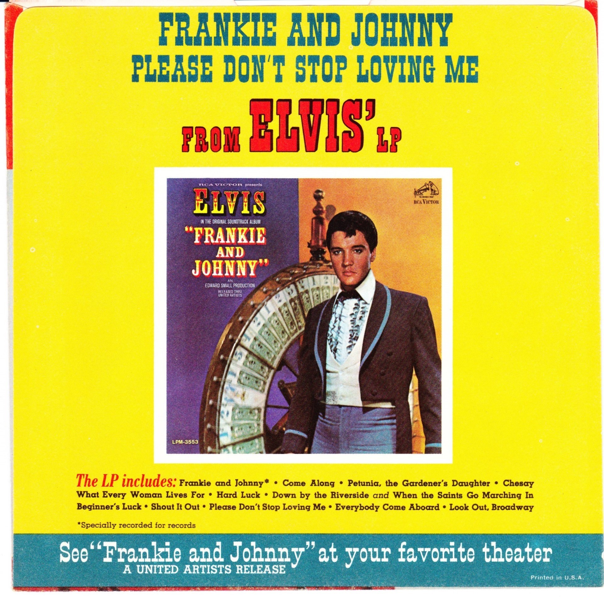 AND JOHNNY (LP) (US) RCA LSP / LPM 3553 ( See reissue in 1976 ) Released: April 1966 Side 1 Frankie And Johnny Come Along * Petunia, The Gardener's Daughter ** Chesay *** What Every Woman Lives For ** Look Out, Broadway ** Side 2 Beginner's Luck * Down By The Riverside / When The Saints Go Marching In * Shout It Out * Hard Luck **** Please Don't Stop Loving Me Everybody Come Aboard ** * Recorded: