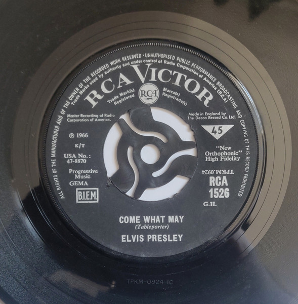| Label: RCA Victor – RCA-1545 Format: Vinyl, 7", 45 RPM, Single Country: UK Released: 1966 Made By – The Decca Record Company Limited Matrix / Runout (Side A Printed Label): TPKM 5307 |
