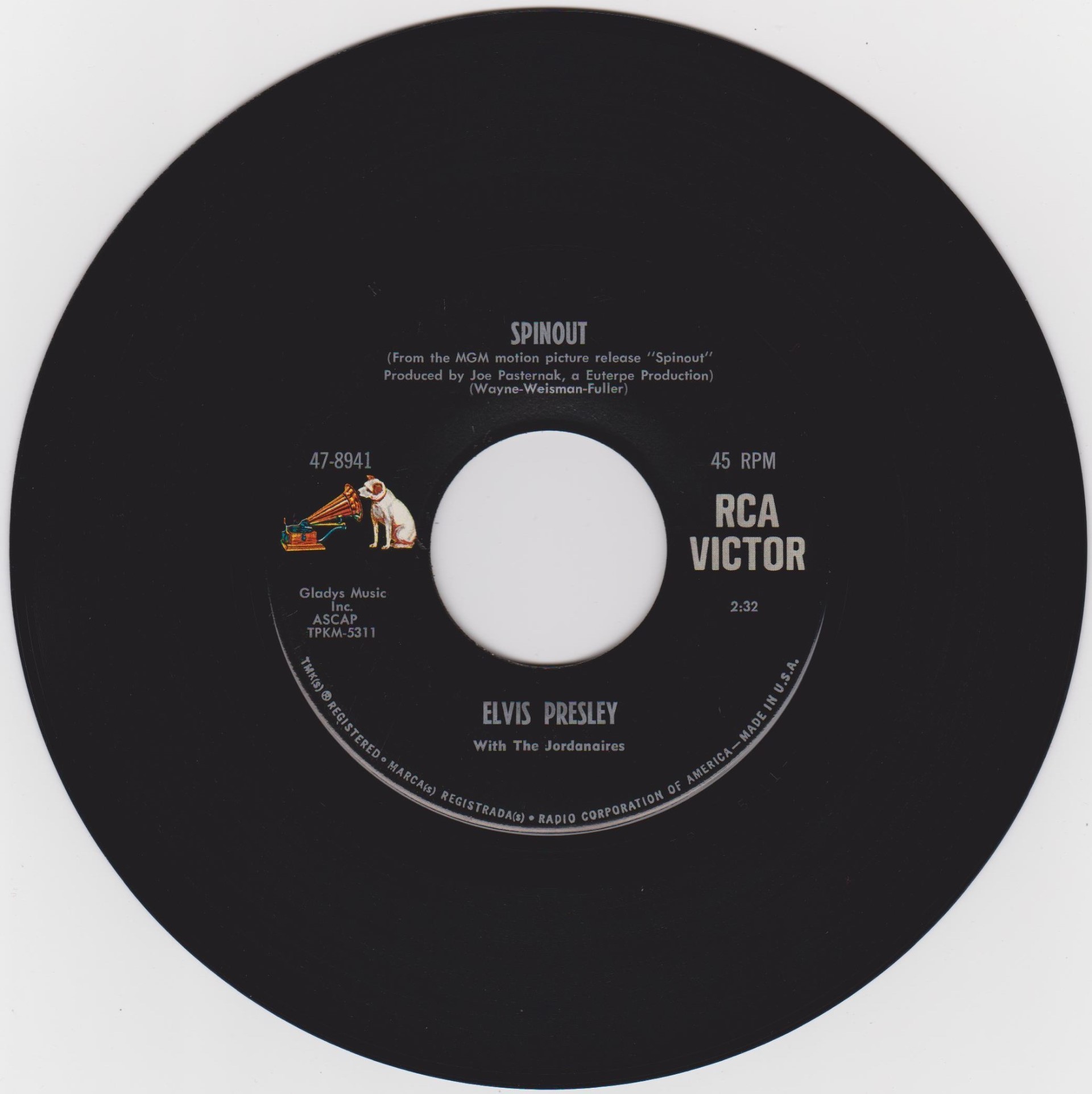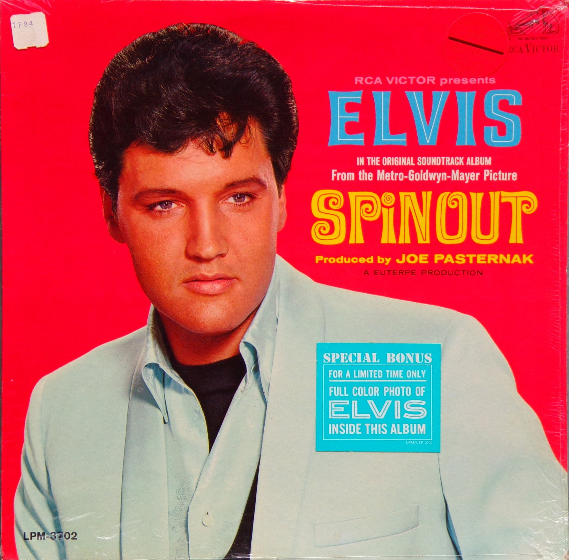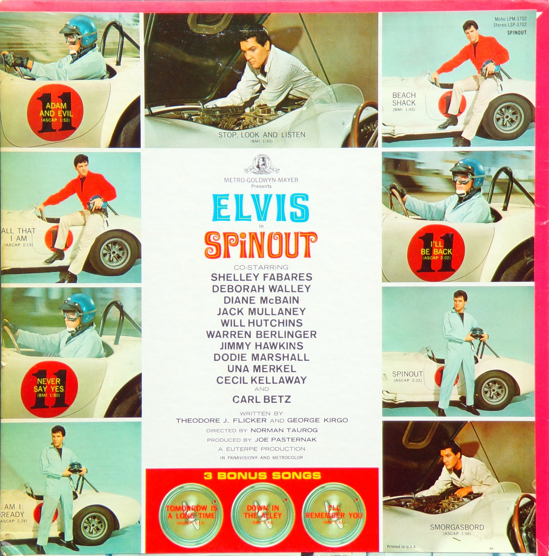 Recorded: Radio Recorders, Hollywood, February 16, 1966 Brief History : Spinout is the twenty-seventh album by Elvis Presley, released on RCA Victor Records in mono and stereo, LPM/LSP 3702, in October 1966. Recording sessions took place at Radio Recorders in Hollywood, California, on February 16 and 17, 1966. It peaked at #18 on the Top Pop Albums chart. In early 1966, executives at RCA and the Colonel had arrived at the same conclusion. They could no longer expect records of only soundtrack recordings and session leftovers to perform as strongly as in the past. Popular music was rife with changes in the mid-1960s, and with chart dominance from The Beatles, Bob Dylan, and a host of others, Presley no longer reigned supreme in the marketplace. Soundtrack sales were plunging, shifting fewer units and peaking at lower positions on the chart. But the Spinout sessions still adhered to the same formula of the past four years. Nine songs were recorded for the soundtrack, all of which appeared in the film. The songs derived from the standard pool of songwriters, their publishing rights signed over to Elvis Presley Music and Gladys Music, the companies owned by Elvis and the Colonel. One song "Stop, Look, and Listen" had been a recent b-side for Bill Haley & His Comets in February 1965. Two songs were released as a single the month before the film's premiere, the title track backed with "All That I Am," and although both sides charted independently the A-side just barely made the Top 40. Elvis performed the song "Adam and Evil" on stage in the film which features a long drum roll at the beginning. He makes reference to Adam and Eve in the Bible, that "Adam and Evil they go hand in hand / Eve taught him sin, that's the way it all began". Elvis clicks his fingers throughout the track. Acknowledging shifts in taste, three additional tracks of a contemporary nature were added as a "special bonus" to bring the album up to a more acceptable running time. Recorded at RCA Studio B in Nashville, Tennessee during the sessions for his gospel album How Great Thou Art, two were rhythm and blues songs. The other was an original by Bob Dylan (publishing rights were, of course, not signed over to Presley and Parker), with a ballad from a later Nashville session in June. "Down in the Alley' had been released in 1957 by The Clovers, and Presley knew of and appreciated the Dylan song from the version on Odetta Sings Dylan by the folk singer Odetta. "I'll Remember You" had been a record by Don Ho, and reflected Presley's infatuation with Hawaii and its culture. Even with these inclusions, the album fared little better than its predecessors in 1966. Dylan confessed to Rolling Stone in June 1969 that Presley's version of "Tomorrow Is A Long Time" was the cover of one of his songs that he "treasured the most." The three additional songs can be found on From Nashville to Memphis: The Essential 60's Masters, while three songs from the film soundtrack appeared on its sister compilation: "Spinout," "All That I Am," and "I'll Be Back." Front Cover : Photo of Elvis. Title to the right. Catalogue number