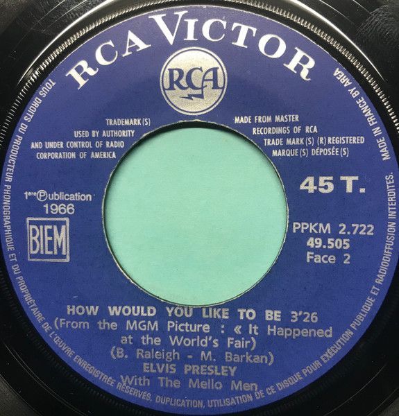 | Label: RCA Victor – 47-8950 Format: Vinyl, 7", 45 RPM, Single Country: Germany Released: 1966 Lacquer Cut At – TELDEC-Studio, Hamburg How Would You Like To Be is from the MGM picture "It Happened At The World's Fair". Rights Society (Boxed): GEMA |