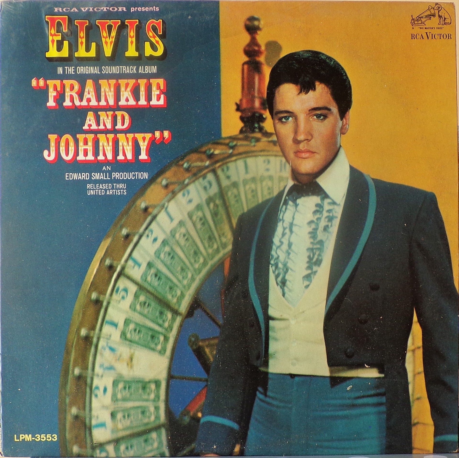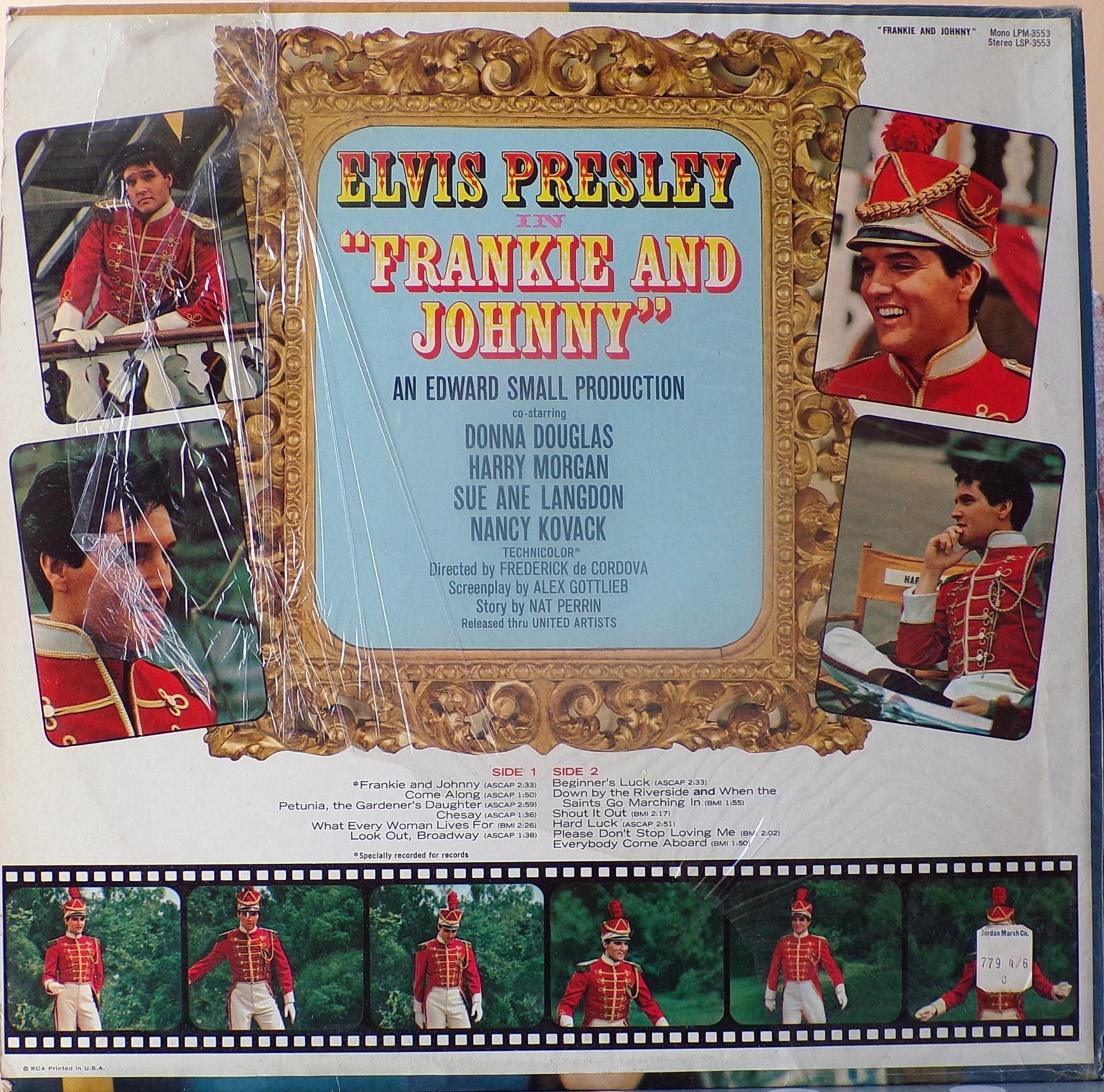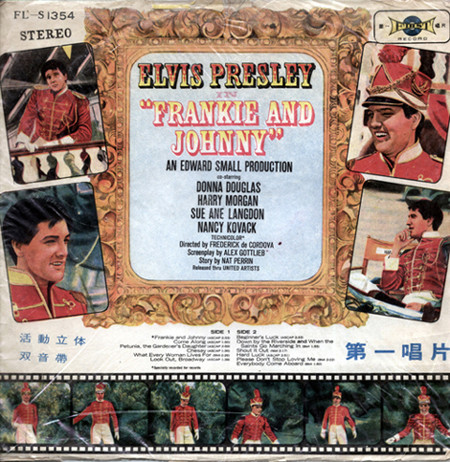 Radio Recorders, Hollywood, May 13, 1965 Brief History : Frankie and Johnny is the twenty-fifth album by Elvis Presley, released on RCA Victor Records in mono and stereo, LPM/LSP 3553, in March 1966. Recording sessions took place at Radio Recorders in Hollywood, California, on May 12, 13, and 14, 1965. It peaked at #20 on the Top Pop Albums chart. It was certified Gold and Platinum on 1/6/2004 by the R.I.A.A. To coincide with the 19th century setting of the film, some traditional song material was utilized for the soundtrack. "When the Saints Go Marching In" is an old gospel hymn that has become a jazz standard associated with the traditional hot jazz of New Orleans. It is paired in a medley with "Down by the Riverside," another traditional gospel song dating back to the relevant time period. Both are in the public domain, and the team of Giant, Baum, and Kaye captured the publishing for Freddy Bienstock and the Colonel. The title song, "Frankie and Johnny," is a variant on the American popular song first published in 1904 and credited to Hughie Cannon. With changed lyrics, another publishing royalty was secured for Gladys Music. Twelve songs were recorded at the sessions for Frankie and Johnny, and all were used and issued on the soundtrack. The title song was issued as a single, with "Please Don't Stop Loving Me" on the b-side. Released either just before or simultaneously with the album, "Frankie and Johnny" peaked at #25 on the Billboard Hot 100, with the b-side also charting at #45. Front Cover : Photo of Elvis. Catalogue number bottom left. *NOTE* Hype Sticker. A 12 X 12 inch photo was given away free for a period during this release. It was enclosed inside the album. Different matrix numbers. |