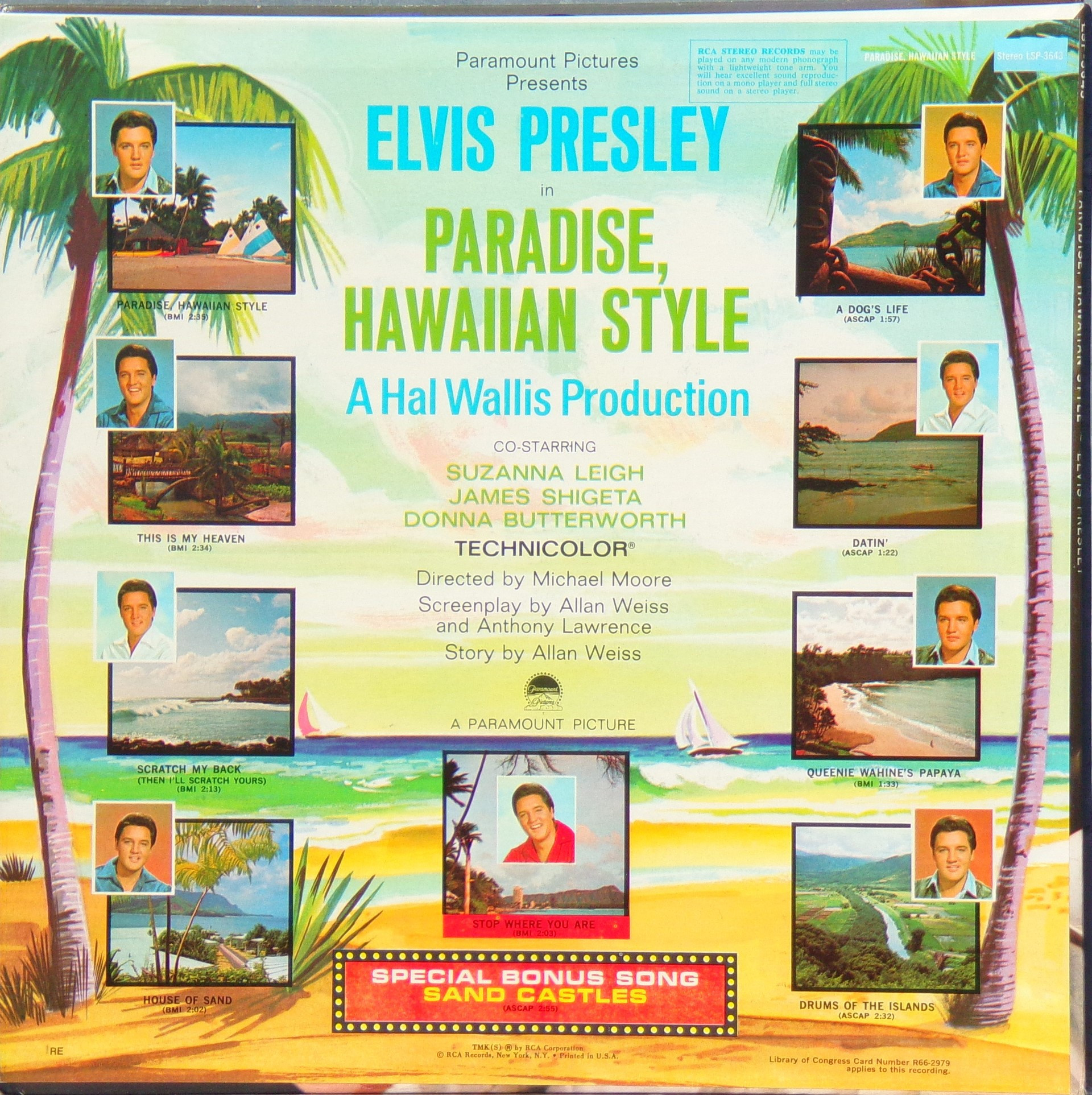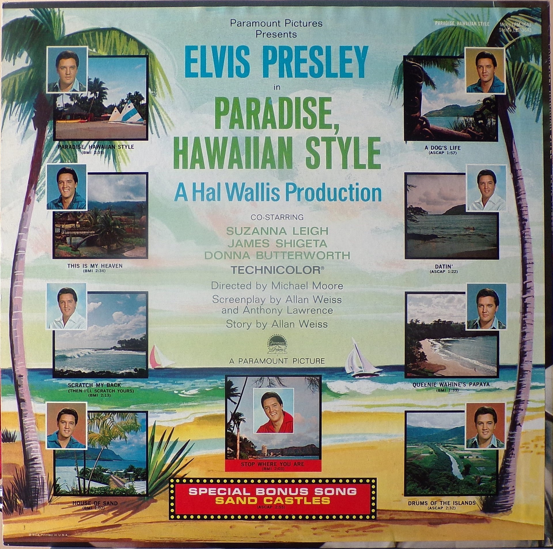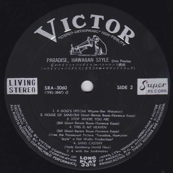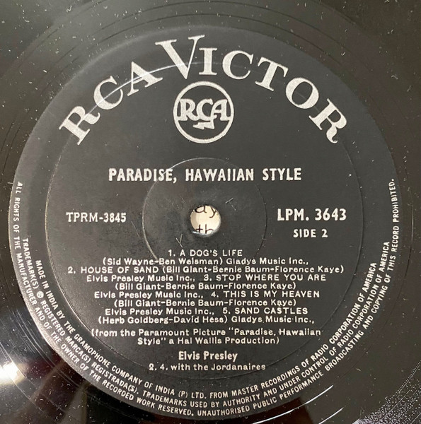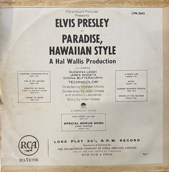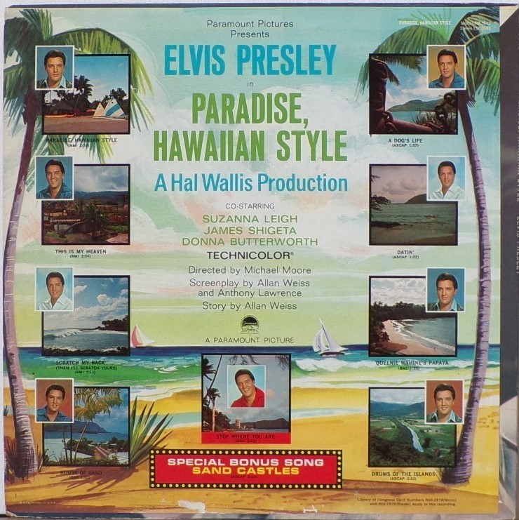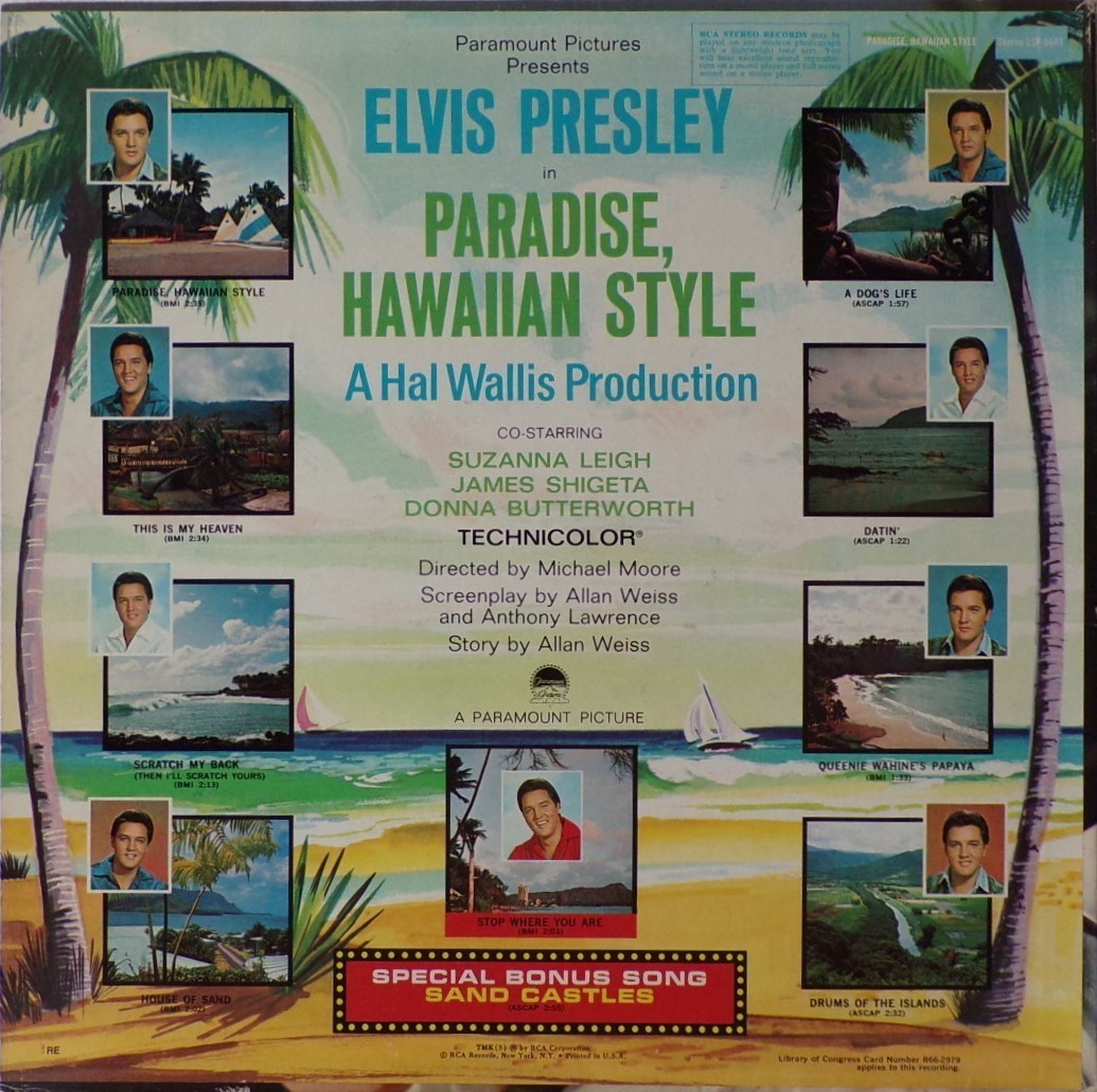 HAWAIIAN STYLE (LP) (US) RCA LSP / LPM 3643 Released: June 1966 Side 1 Paradise Hawaiian Style *** Queenie Wahine's Papaya *** Scratch My Back ** Drums Of The Islands * Datin' *** Side 2 Dog's Life *** House Of Sand ** Stop Where You Are ** This Is My Heaven * Sand Castles ** * Recorded: Radio Recorders,
