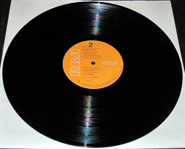 left. Rear Cover : 9 photos of Elvis. Catalogue number top right Mono LPM / Stereo LSP 3643. Printed in U.S.A. bottom left. Label : Black with silver lettering & dog on top. Side 1 : STEREO at bottom. Side 2 : STEREO at bottom. Pressing Plant : Indianapolis Matrix Number Side 1 : TPRS - 3846 - 2S A1 (Machine Stamped) Matrix Number Side 2 : TPRS - 3847 - 2S A4 (Machine Stamped) *NOTE* RCA Victor Logo in white. |